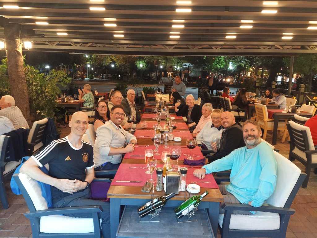 Captain Caveman met Rob for a drink at Lukka bar then I walked in to town to meet them at Aşkın’s for a pre-dinner drink. Jamie and Drew were already there with Captain Caveman and Rob, I joined Jamie in a Mr G to remember his late husband Graeme. The Mr G drink is named after Graeme and is very moreish, it was also Aşkın’s last weekend of opening as they would be closing for the winter. The evenings were getting a little cooler now so I had a fleece on as we walked through town to meet everyone at Bistro Blue. It was also their last night so l had reserved a table for 10 of us; Ma & Pa, Jamie & Drew, Viv & Paul, Nanny Kay, Rob, Captain Caveman and me. We sat down but Captain Caveman decided he would take Dad’s seat so Dad had to go back to sitting opposite Mom so that Captain Caveman could sit opposite Rob. I sat between Paul and Drew, opposite Nanny Kay. I’d already decided I was having a steak before I’d even looked at the menu, Captain Caveman and I decided to treat ourselves to the large one for a little extra. Drew had a mixed grill and it was massive, I really enjoyed my steak and it took me ages to eat it. After a gorgeous meal most of us wandered over to Sofra bar where there was a band on so we caught the second half. Luckily a few from Fat Club were there so I joined them on the dance floor. I loved Psycho Killer and it was the singer’s birthday so it was a great way to end the night. We met up with our neighbours and some friends and had a great night with more wine – the diet was going really well! When it was time to go home, I needed a taxi back to Mark and Kate’s but I didn’t have their address to hand. I went to the taxi rank and asked for a ‘taxi to Mark and Kate’s house please’ and the driver said he knew the way. It was pretty late and I’m not sure why I didn’t call Fikri but I got back ok and went to bed having had a lovely time.