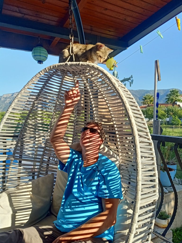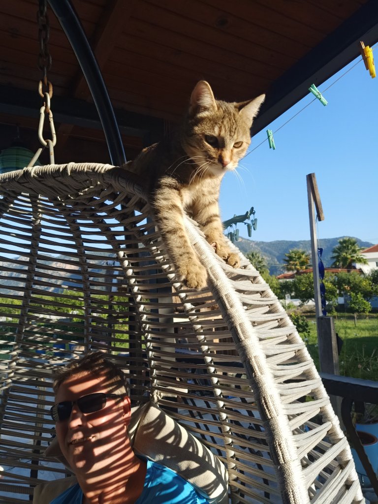 By 7.25am on Friday 4th November all cats at Mark and Kate’s were fed. I was tempted to go back to bed but didn’t and I spent some time on my Turkish. I cycled back to see Captain Caveman who was looking forward to Rob’s arrival this afternoon. He made the spare bed and had a tidy round a bit, while I cooked lunch he went to the supermarket. He bought 3 cartons of cherry juice (for his gout), a carton of orange juice and a toastie loaf for a total of 88 lira (£4.20). He also bought a lightbulb for the cooker hood for 13 lira, a shower head for 35 lira and some coffee for 65 lira, just over £5 for those 3 items. We ate Slimming World friendly potatoes with peppers and onion, then I added tiny bits of sucuk (Turkish salami) and cheese. It wasn’t bad but not amazing though that didn’t matter as I had organised a night out later. I went back to Mark and Kate’s to check on the kitties then feed them.