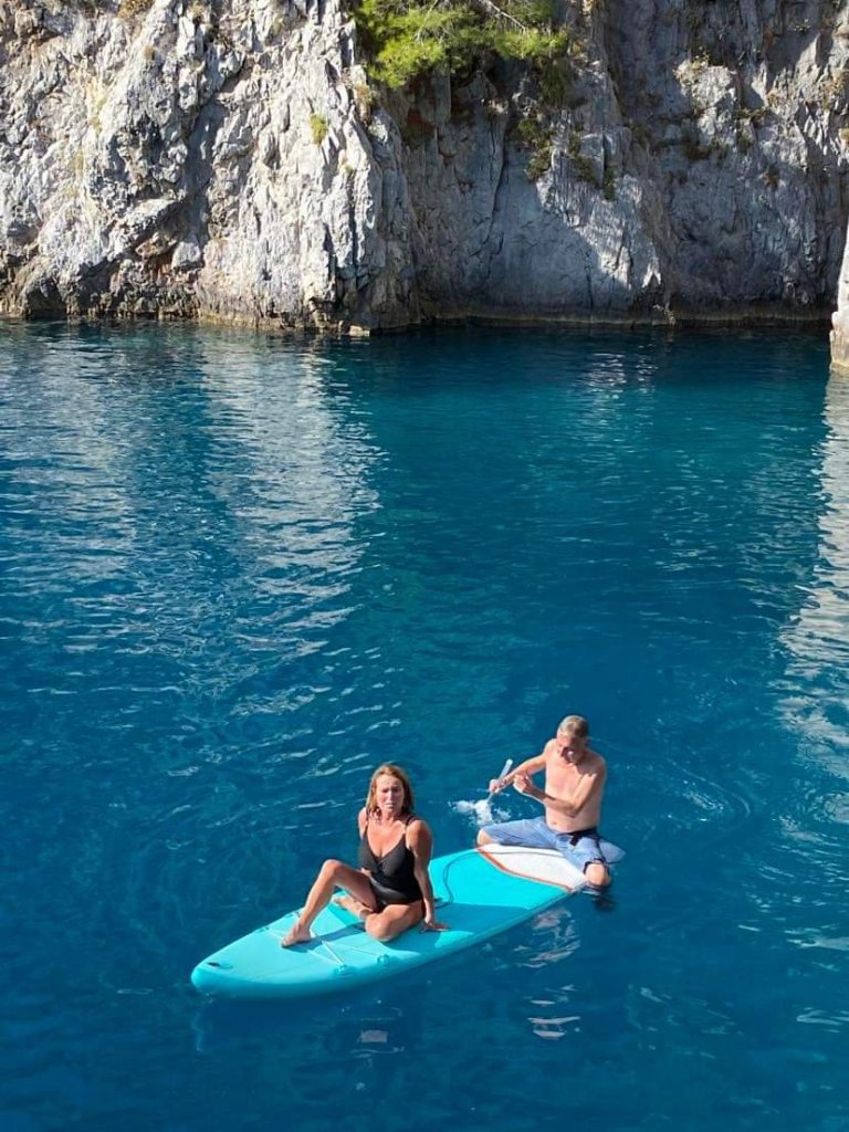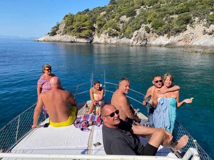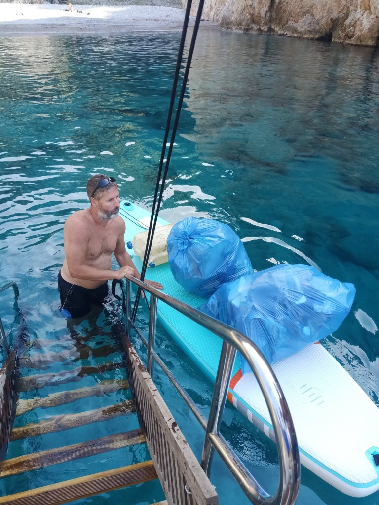 Kate, aka Miss Guided Tours or Miss Adventure, had organised another boat trip on Sunday 30th October. I had resigned myself to not going given that Edna, the dog, had not been well yesterday. When we got up and took both dogs out for a walk they were fine and Edna was back to normal, thankfully. I decided I would go on the boat trip, after all, but it did mean we would be leaving the pooches in the villa for about 7 hours and I was a bit concerned. Before the day out to sea on Kaan’s Tequila Boat, we didn’t have time to make breakfast so we grabbed a pain au chocolat from Migros and ate it at the front of the boat. On board today we had some of the same usual suspects but we were missing a couple who couldn’t make it and had added more for good measure. My parents, Captain Caveman and I were joined by Vanessa, Adam & Kath, Jackie & Chris, Trish & Steve, Michaela & Ali, Gay Gaz, Kelly and a lady we call 007. Mark and Kate got picked up from their jetty on our way to Devil’s Bay once again. I was so pleased that Ali was well enough to join us even though he and Michaela were not able to go mad with the drink. Trish was back to her usual self too and could enjoy a white wine (or 2) but Vanessa was now feeling a bit iffy and had to limit her wines to just 2 this time. Kate, who was doing so well being alcohol free but was finding it tricky to not drink. Typically, Kaan and Kate had agreed water would be free on this trip, so if she ordered wisely she still could take advantage of a free bar today! Of course, Gay Gaz, Kelly, Mark and Steve managed to make up for it on the booze. By 2pm Captain Caveman had cleared a beach of lots of litter and was towing it back to the boat using a paddle board as a raft.