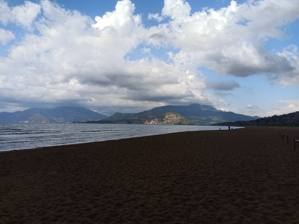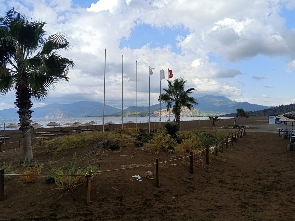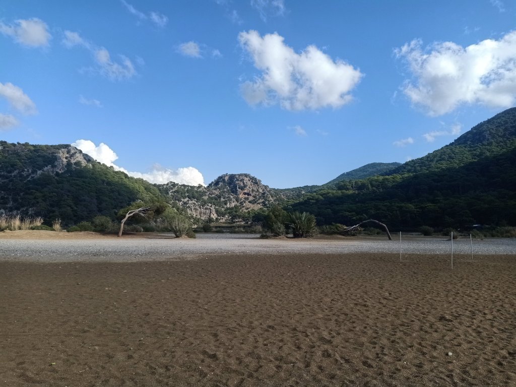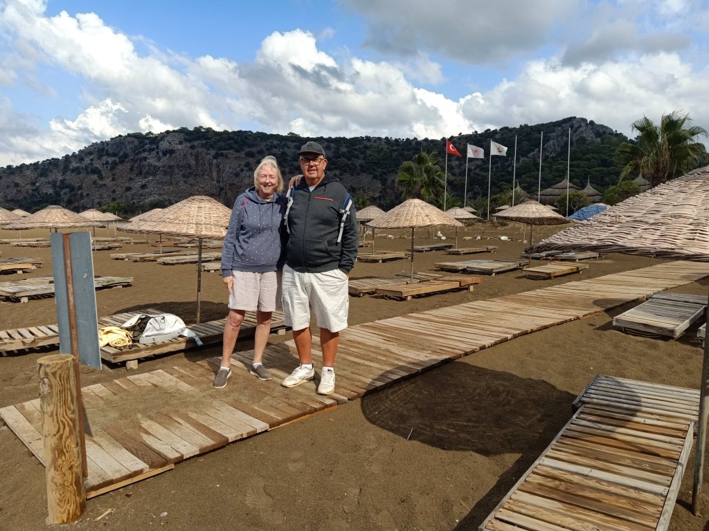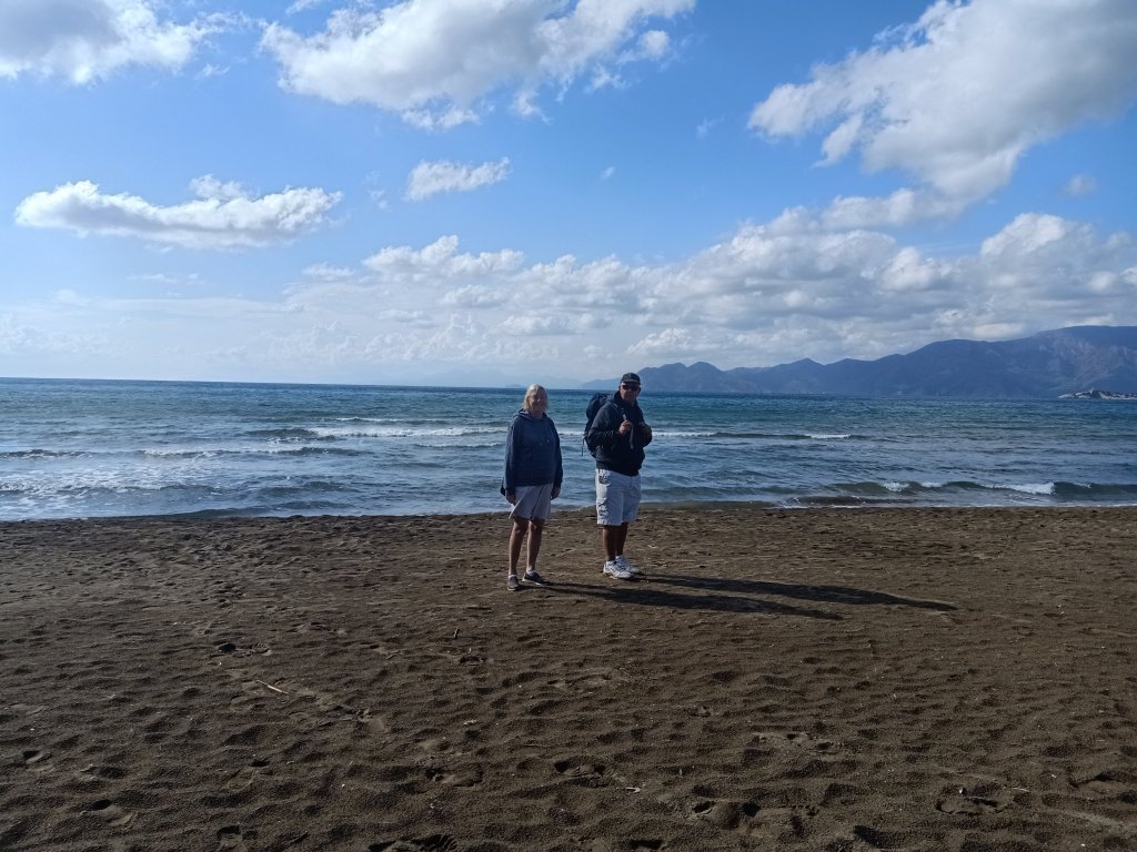 During the night there had been heavy rain but it looked like it was easing off when we woke up on Sunday 6th November. Rob had already been up early for his morning run, where a street dog had accompanied him. He got back to the apartment just as the rain had begun again. Captain Caveman was still in bed rejigging today’s plans. The idea had been for Captain Caveman and Rob to walk it to Iztuzu beach over the hills. They would get the 10am bus part way along and walk the rest. My parents and I would get the bus at noon and see them there. Instead, we ate Turkish breakfast pastries at home with a hot beverage before our afternoon trip out. Just before 10am we thought the whole of Plan A would be stopped due to the heavy rain but, by 10.15am, the rain had stopped and the sun was trying to come out. All 5 of us got the 12 o’clock bus, Captain Caveman was a bit cheesed off as the 10am bus had been moved to 10.30am so they could have still done plan A if they had known. At the beach it was fairly cold, breezy, but the sun was warming things up a bit. I thought it was too cold to swim and didn’t take my swimmers. Our first stop of the day was to see the amazing work that is being done at the turtle hospital, one of my favourite turtles today was Nessie and she might even be getting released soon.