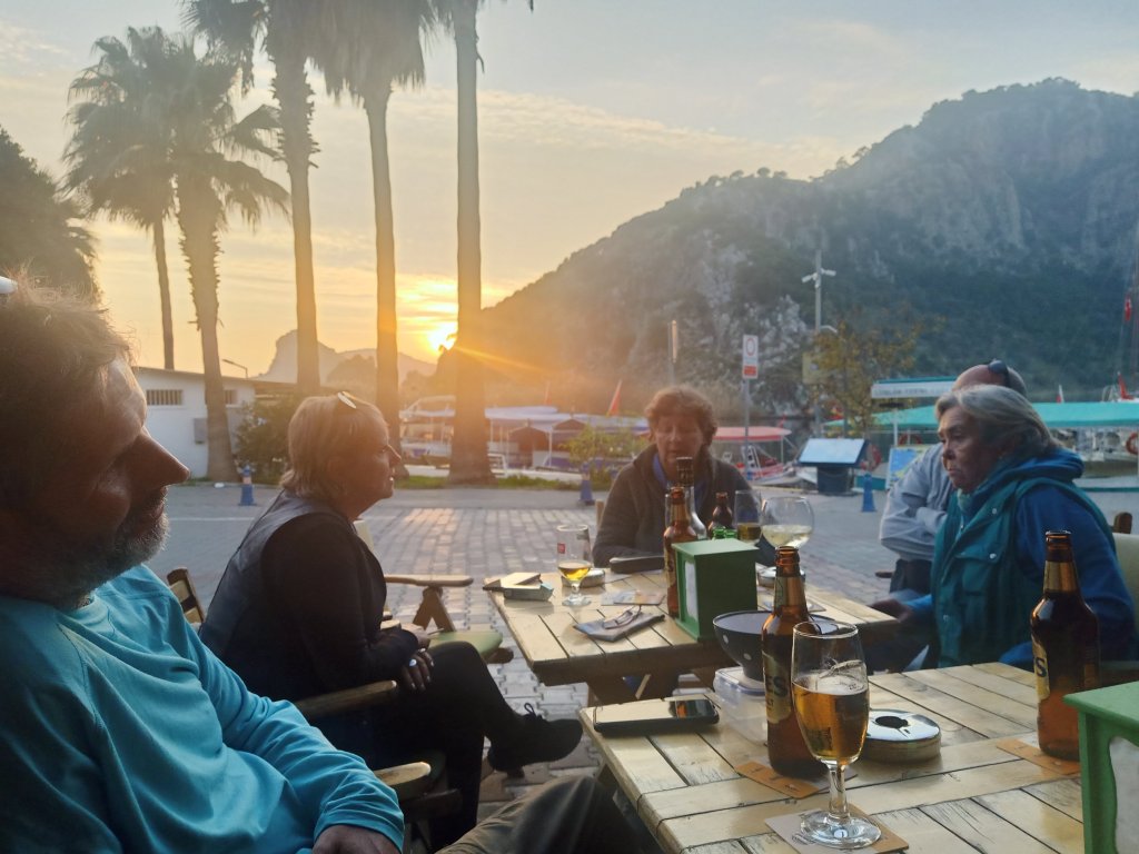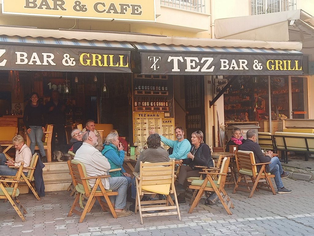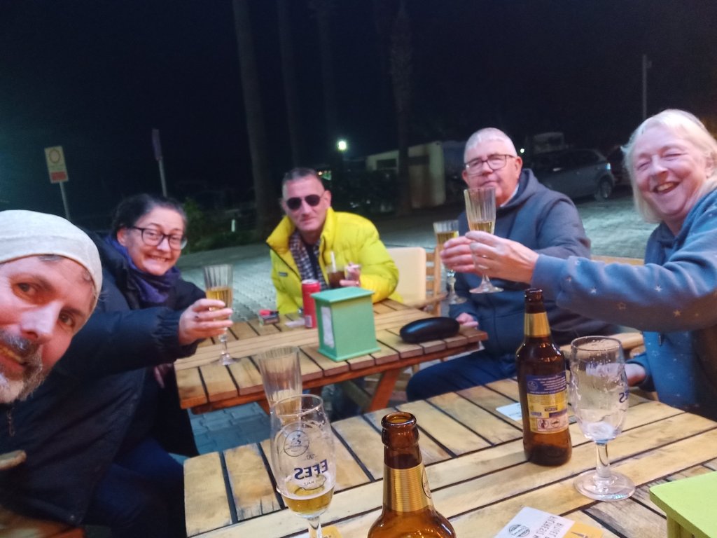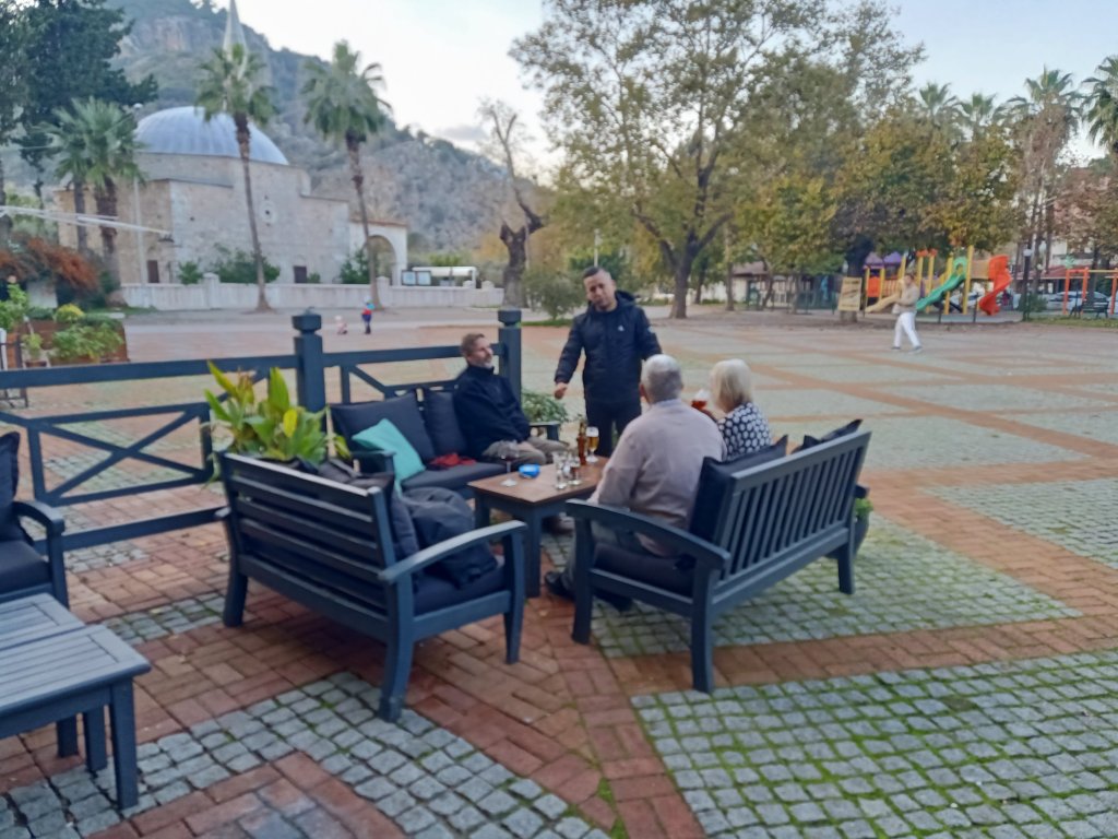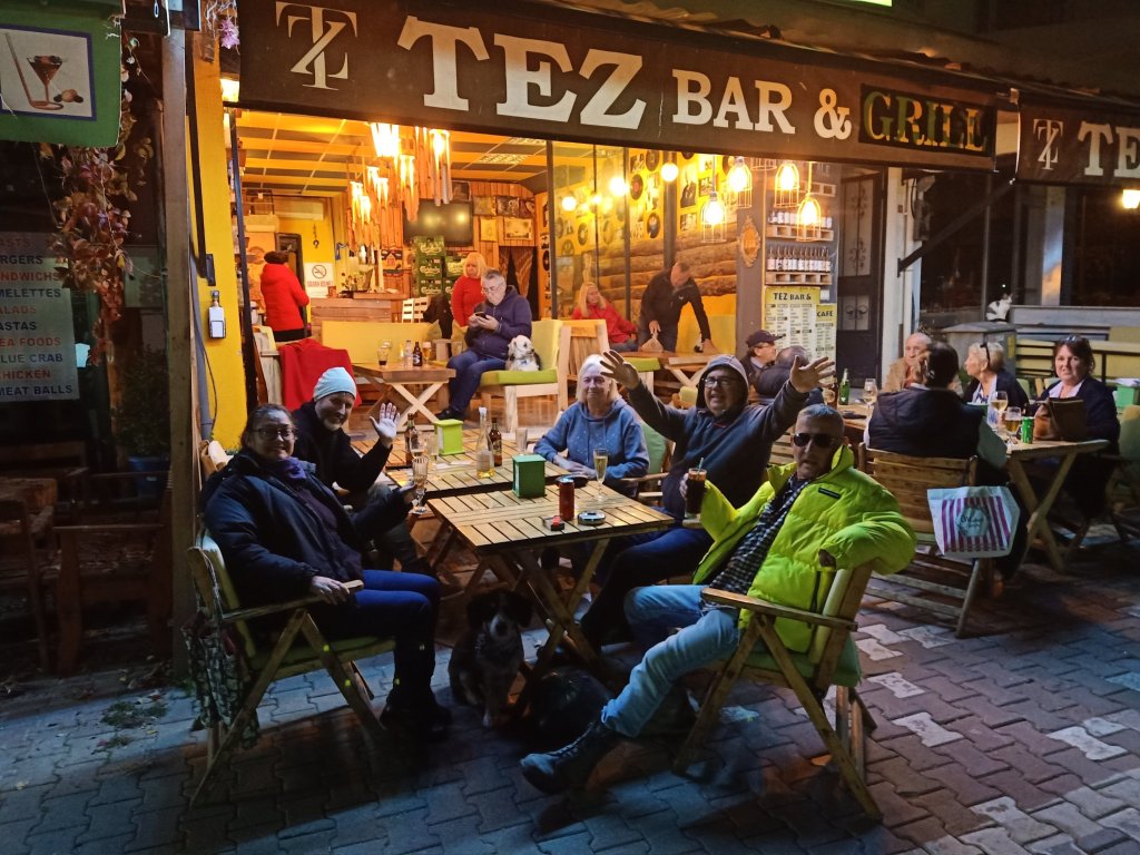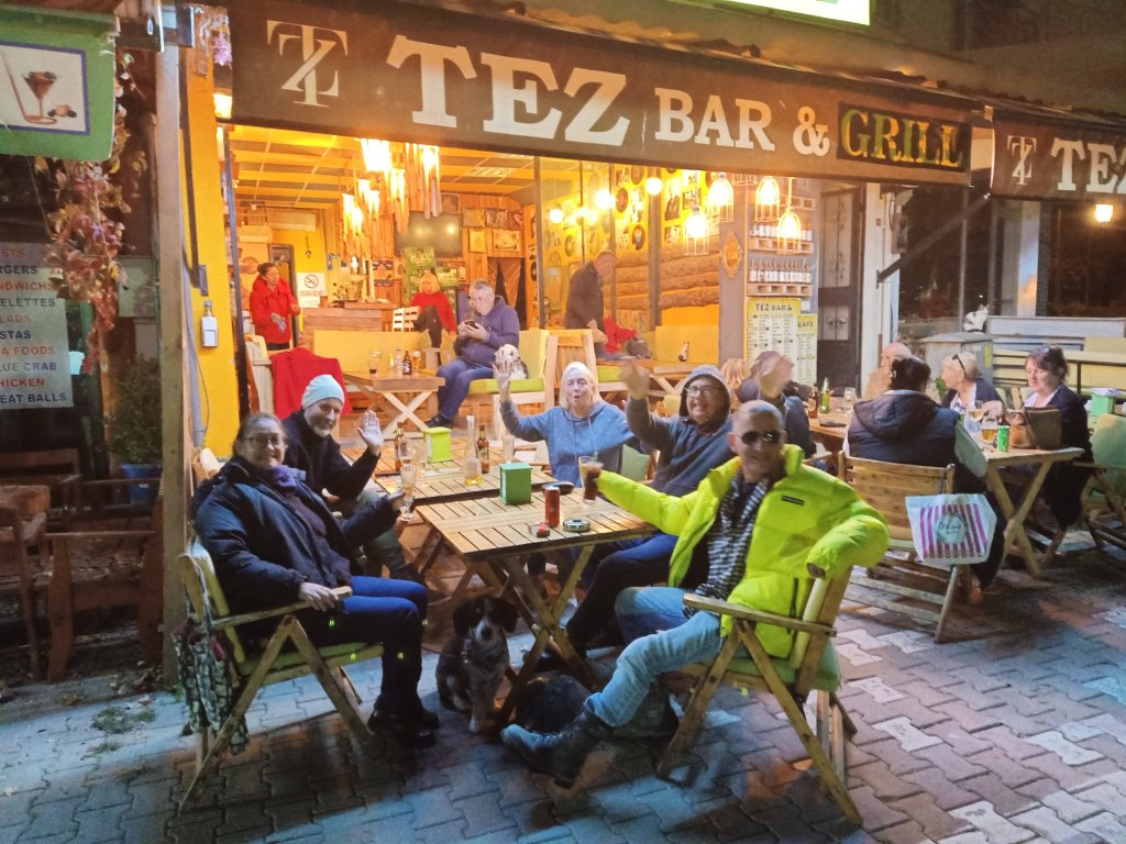When I finished class I walked over to Bistro Blue which had now opened on certain days during the winter months. It’s one of our favourites in Dalyan so it was good news and my parents were very happy about it too. Captain Caveman, Charlie and my parents were already there and I was surprised to see my Dad drinking strawberry cider. As they had just opened, we got a bit of a deal on the beers and wine which were only 50 lira each (£2.17) – the cider was 70 lira (£3). The owners Selahı and Annie had the place looking good and it had an awning up and heaters inside. We didn’t go inside because we had Charlie who was loving being able to nosey around. It was quite pleasant being sat outside and it meant that Charlie could say hello to some street dogs. As we were leaving, Annie and Selahı treated us all to a free shot of either amaretto or a minty concoction to celebrate their first day of winter opening.