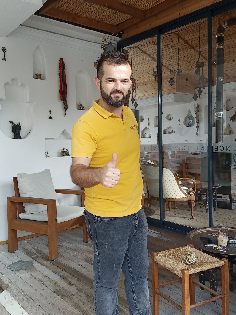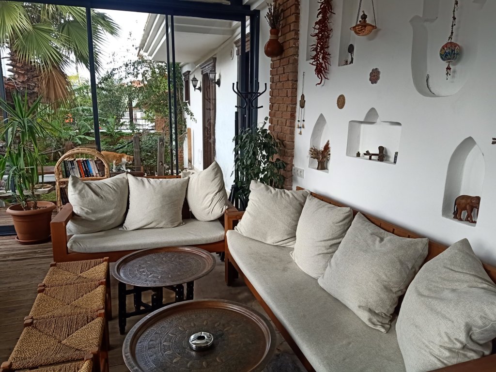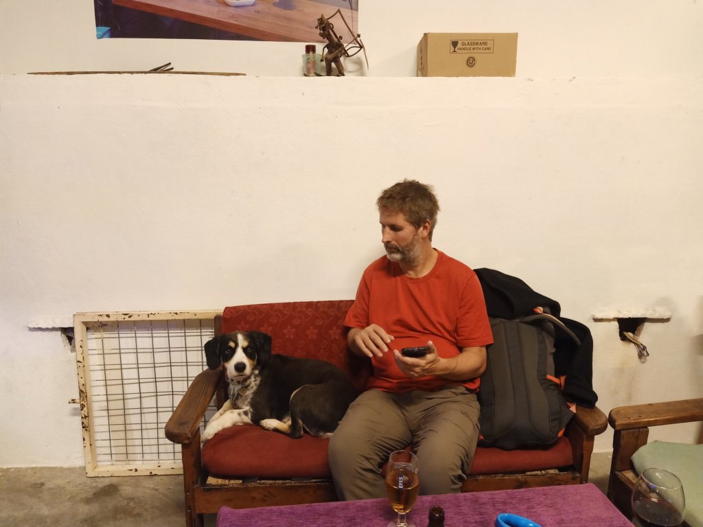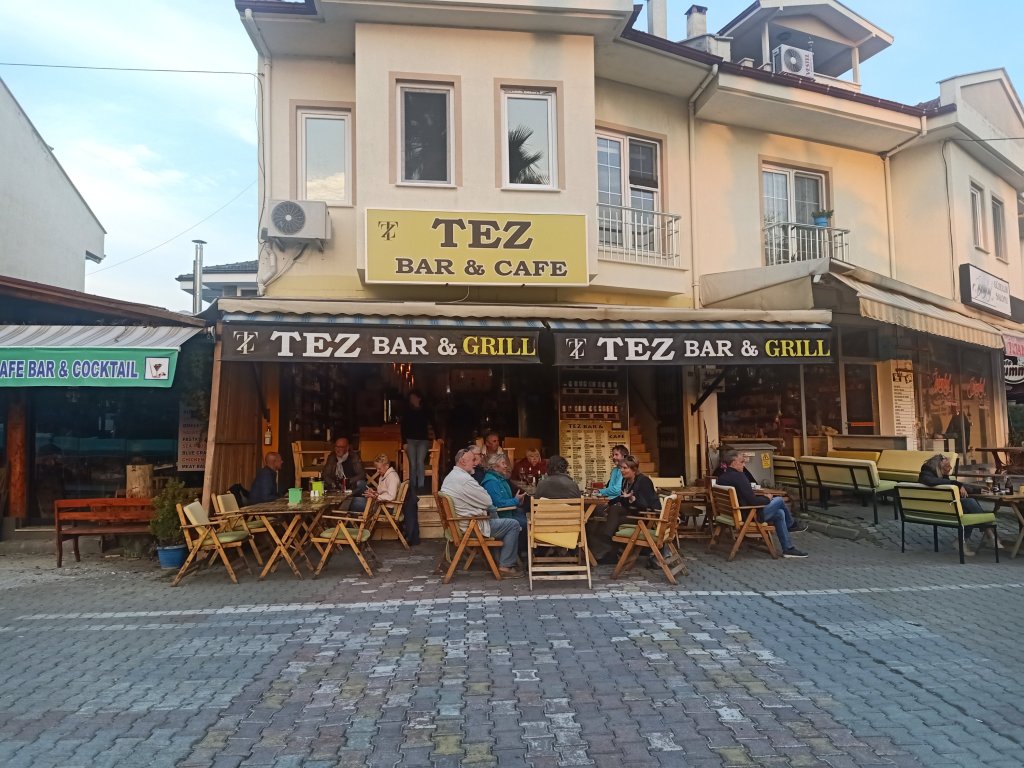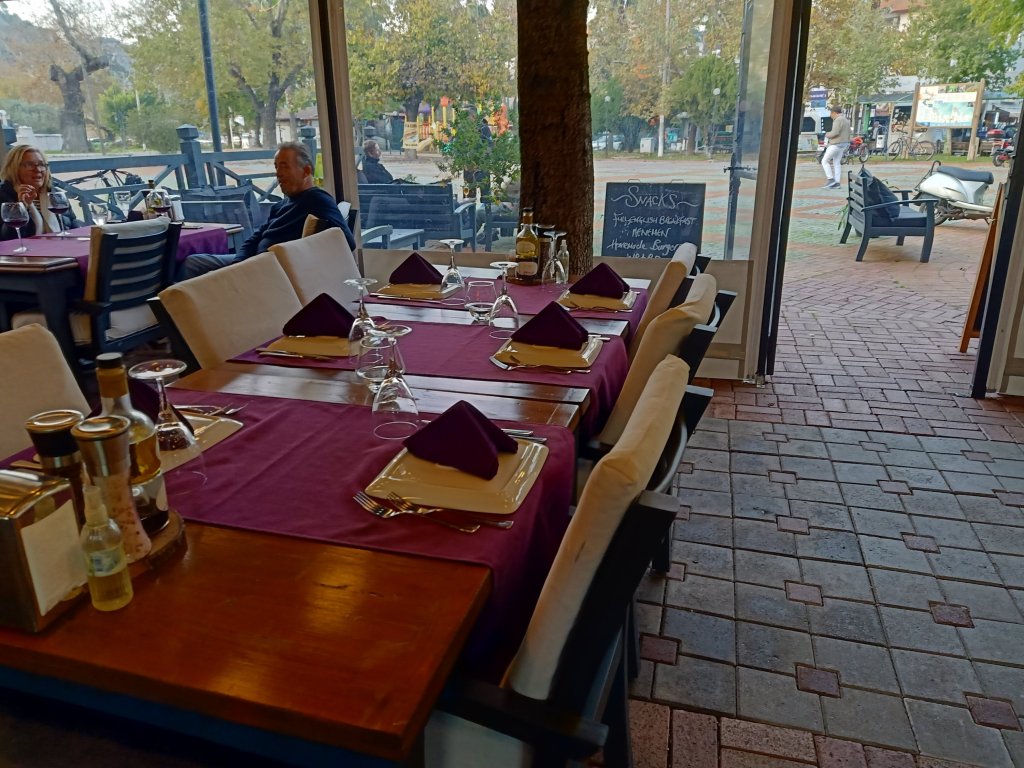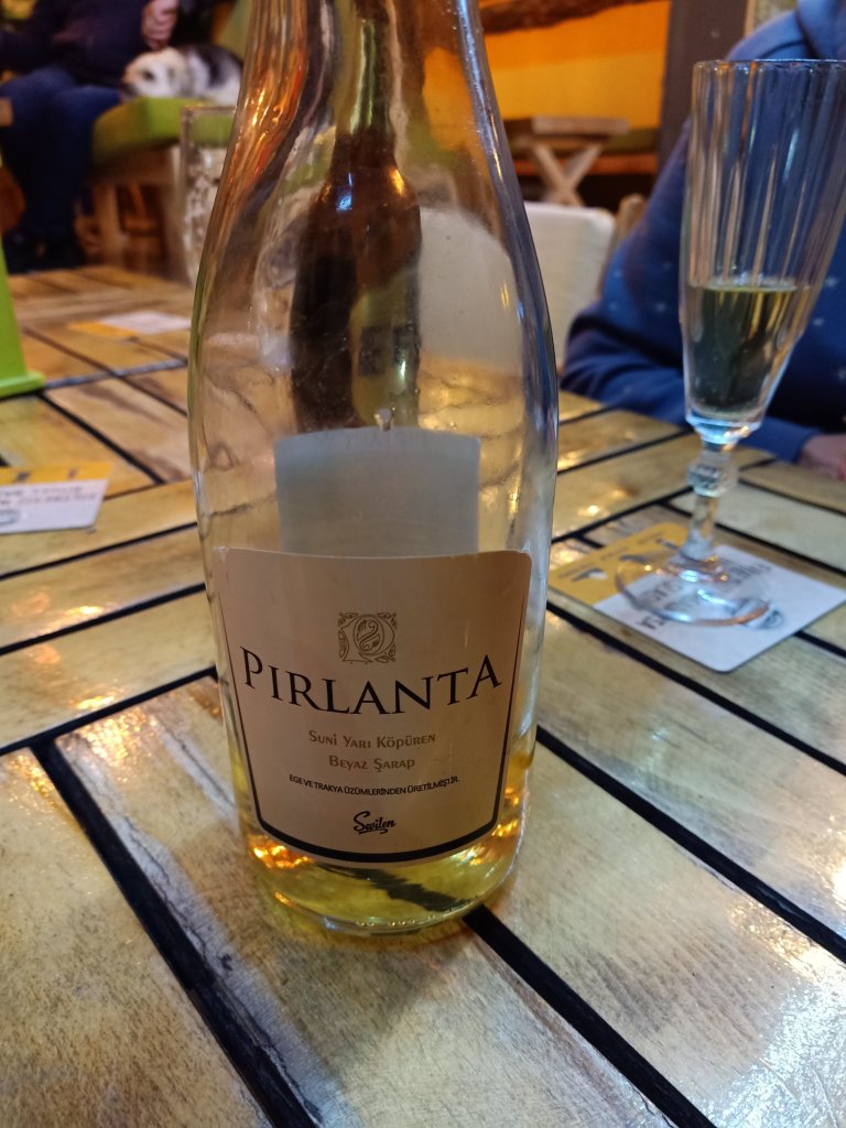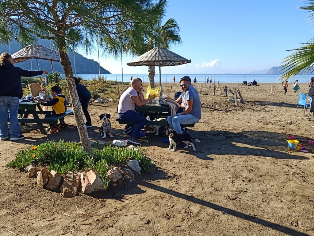 When I finished class I walked over to Bistro Blue which had now opened on certain days during the winter months. It’s one of our favourites in Dalyan so it was good news and my parents were very happy about it too. Captain Caveman, Charlie and my parents were already there and I was surprised to see my Dad drinking strawberry cider. As they had just opened, we got a bit of a deal on the beers and wine which were only 50 lira each (£2.17) – the cider was 70 lira (£3). The owners Selahı and Annie had the place looking good and it had an awning up and heaters inside. We didn’t go inside because we had Charlie who was loving being able to nosey around. It was quite pleasant being sat outside and it meant that Charlie could say hello to some street dogs. As we were leaving, Annie and Selahı treated us all to a free shot of either amaretto or a minty concoction to celebrate their first day of winter opening.