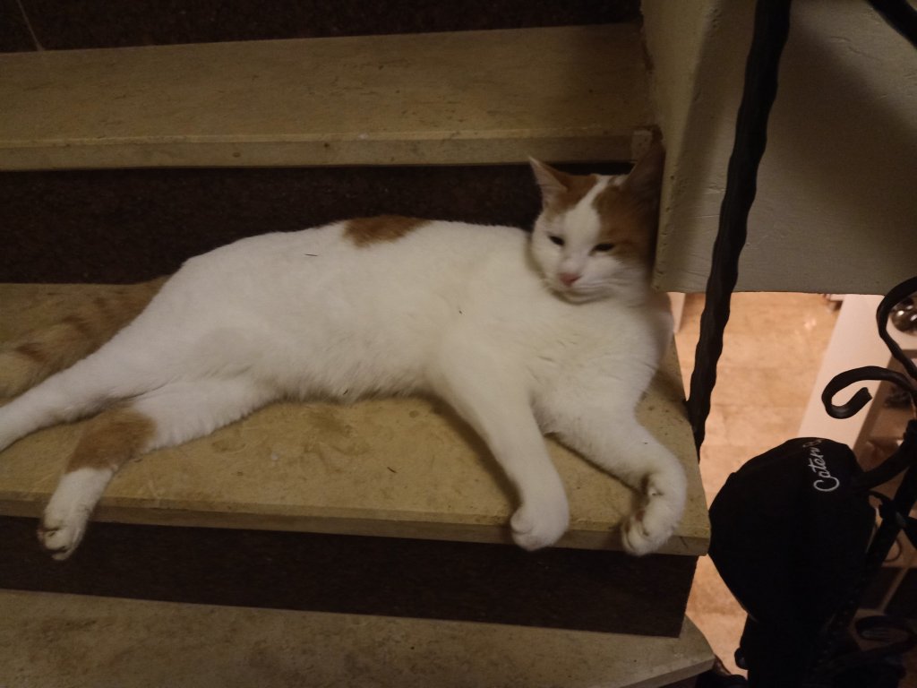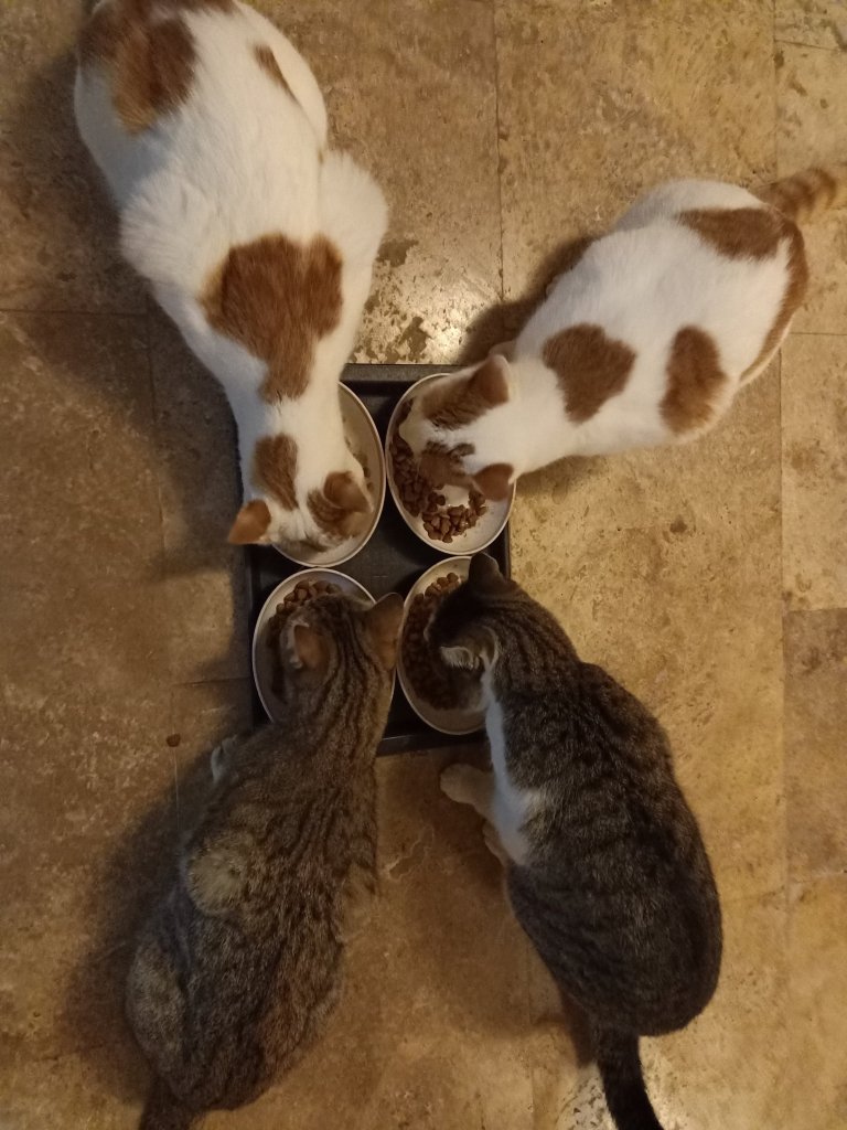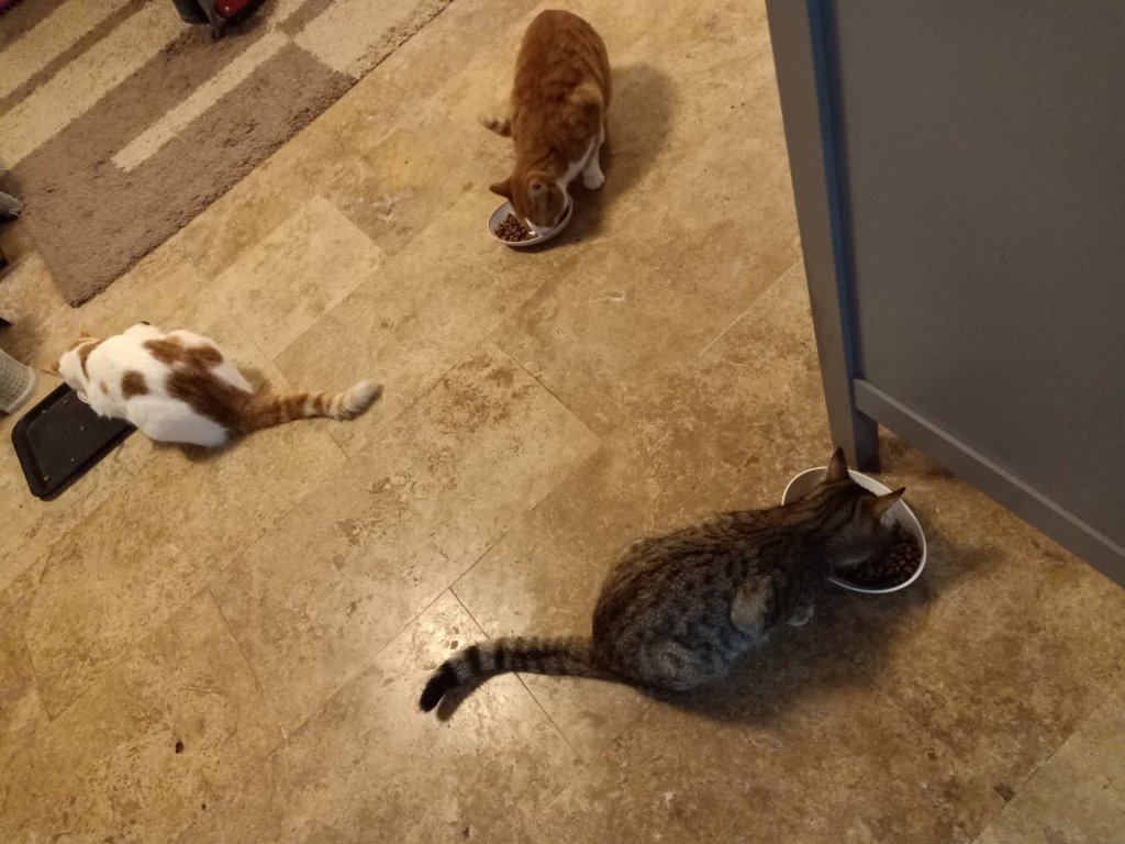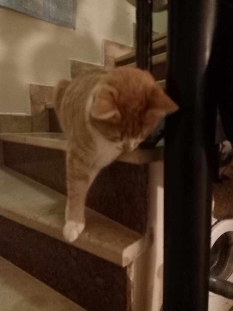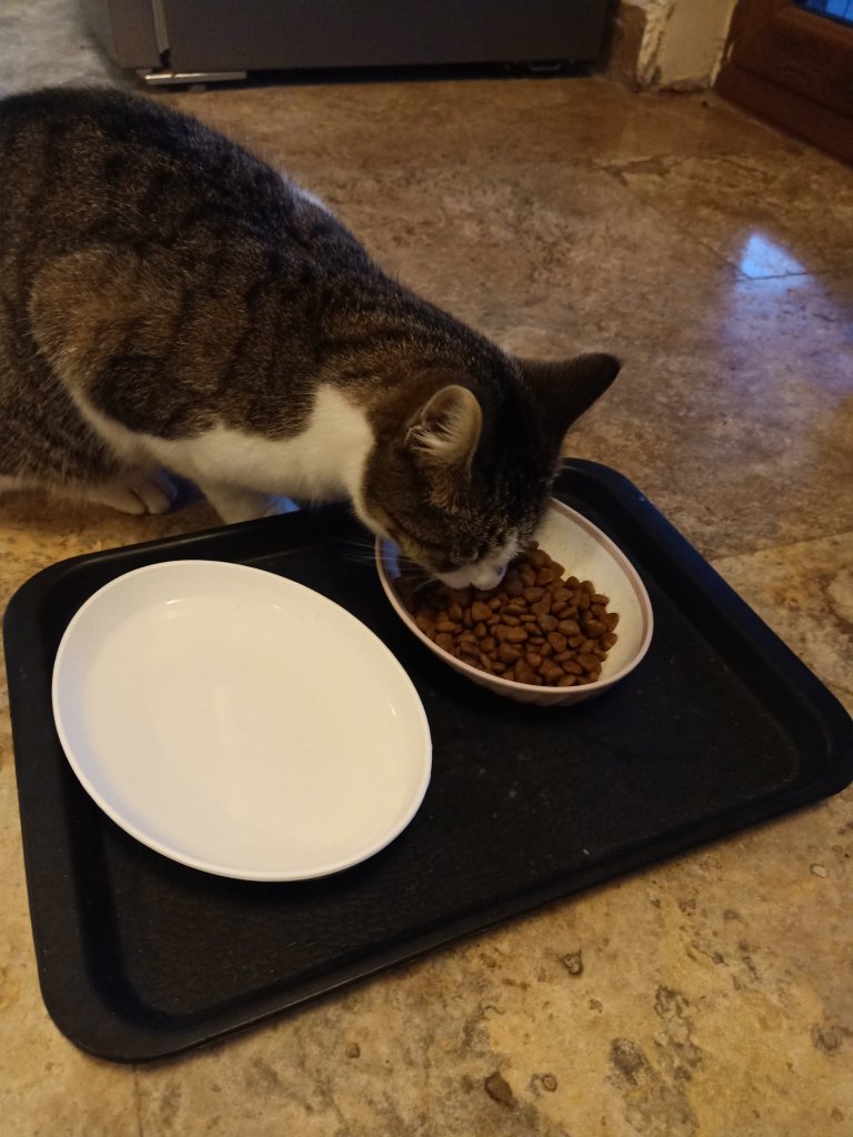 When Captain Caveman got back we had the BBQ chicken from Tuesday but it was a tad dry. I made extra rice to take to Kate’s with me as we now had my rice cooker in the kitchen at this house. Captain Caveman and I had a walk with Charlie but it looked like rain, when we checked the forecast, 9 wet days were predicted. Back at Mark and Kate’s I did a meal plan to try to help with the not being able to get proper diet friendly meals because of being so ill prepared. After feeding the cats they decided to play on the stairs and Casha appointed herself as the gatekeeper of who could pass.