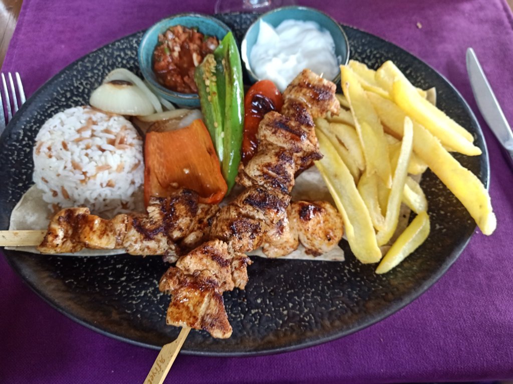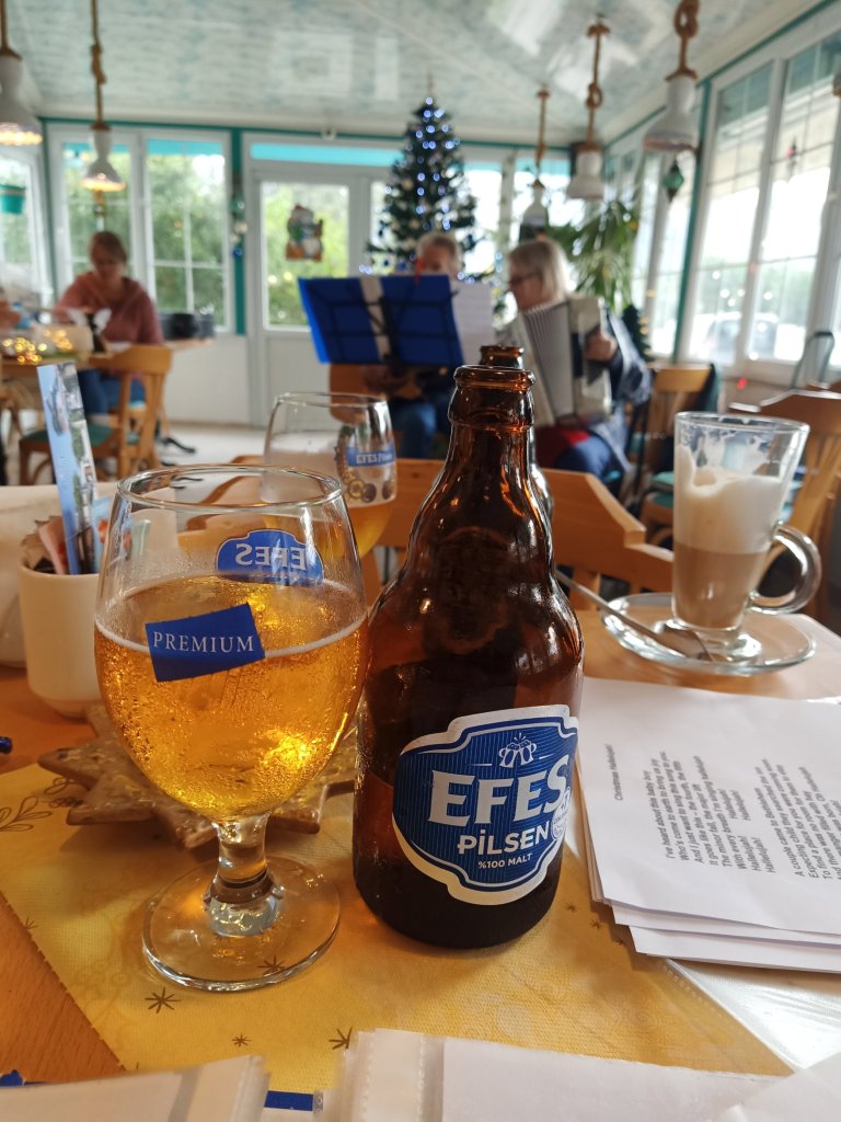 My plan on Saturday 10th December had been to get up early, feed the cats, do a couple of hours work and then walk to Charlie’s or the market to meet Captain Caveman. We’d been looking after Charlie for 10 days now and he really was such a lovely dog. The problem with being in 2 separate houses but trying to maintain a budget is that the food needs to be cooked together then split between the homes. I messaged Captain Caveman but he didn’t answer so I assumed he’d been on his Bridge app until late and was having a lay in. I’d fed all the cats on time and finished the tasks I had for the morning. On the way from Mark and Kate’s place I saw that the nearby building work included putting pipes in to the canals and ditches, it looked a mess and would be awful to walk through in the rain. The 30 minute walk did me good as I didn’t feel as tired once I got there. Captain Caveman was in bed playing Bridge on his phone, Charlie was also snoozing, so there was no trip to the market. I took Charlie out for a short walk round the block to Poo corner then came back for a shower. I could barely get any chat out of Captain Caveman apart from that he was in agreement that we would go to Altın Tava restaurant with my parents for lunch. We’d arranged to meet them at 1.30pm but we were late as Captain Caveman was getting obsessed with playing Bridge on his phone. When we got near to the restaurant my Mom was stood in the street and Dad was walking about a bit further up. Alton Towers, as they call it, was closed despite my mom having checked with them yesterday. My parents didn’t look too pleased as we had been wanting to go to this place for a while but hadn’t managed it. Instead we made the decision that we would go to Bistro Blue for lunch and we headed off there. We sat inside, as we had left Charlie in the apartment, and we were the only ones there. This was only the second day of them being open for winter and there was no menu yet so Ömer, the waiter, took my Mom and Captain Caveman to the chiller to tell them what they had available to eat. My Dad is not a fan of not having a written menu so he didn’t go over and I had already decided I would try to be healthy. My parents ordered steaks, Captain Caveman chose a burger and I stuck with a chicken shish. The food was very good and I would definitely have the chicken shish again. All the food was nice and my parents said their steaks were delicious. We had drinks but I was conscious I wasn’t going to go too mad as I had more work to start tomorrow and I had to walk back to Mark and Kate’s later.