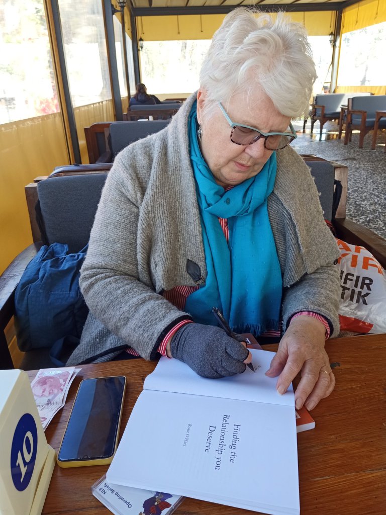 On Monday 12th December all the cats were fed and accounted for by 7.50am but it looked like JC had some swelling on her face. She wouldn’t let me look or touch it and I thought it might have been a bee or wasp sting. I let Kate know in case a vet visit might be needed and we decided to see how she was throughout the day. Casha was fed up of being bothered by Bebek and decided she would sleep in the box of crisps. It was raining so all the cats stayed indoors all morning, except for Kylie. When the sun came out later that morning I decided all the cats but Casha, who was now sleeping on Kate’s handbag, could go out as I had an important appointment at noon. I had to walk to Charlie’s as I had no money on me, Captain Caveman had gone on a long walk with Cath and Keith but not taken Charlie on this one as it might be too difficult for him. He had remembered to leave me some cash which I needed as I’d arranged to meet author, Rosie O’Hara, at the Kaunos tea gardens to purchase her new book and have a quick catch up before she went to cookery class.