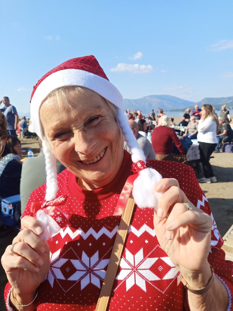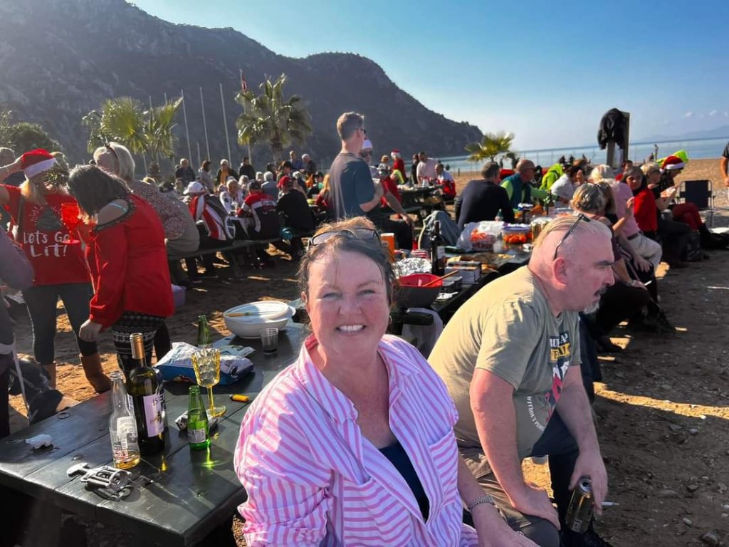 By 1pm I was sat having a gin and a sausage roll with Penny while Charlie snaffled a couple of sausage rolls too. At 2pm Charlie and I took another stroll down the beach with Kate and then I decided to find Captain Caveman and give him Charlie for a bit. I managed to see Nanny Kay, 007, Sabine and Ray while I had a vodka and coke. I noticed Captain Caveman was getting down it, Carol from Fat Club and Vanessa joined us and they were very merry – I needed to catch up as I’d been walking and talking too much!