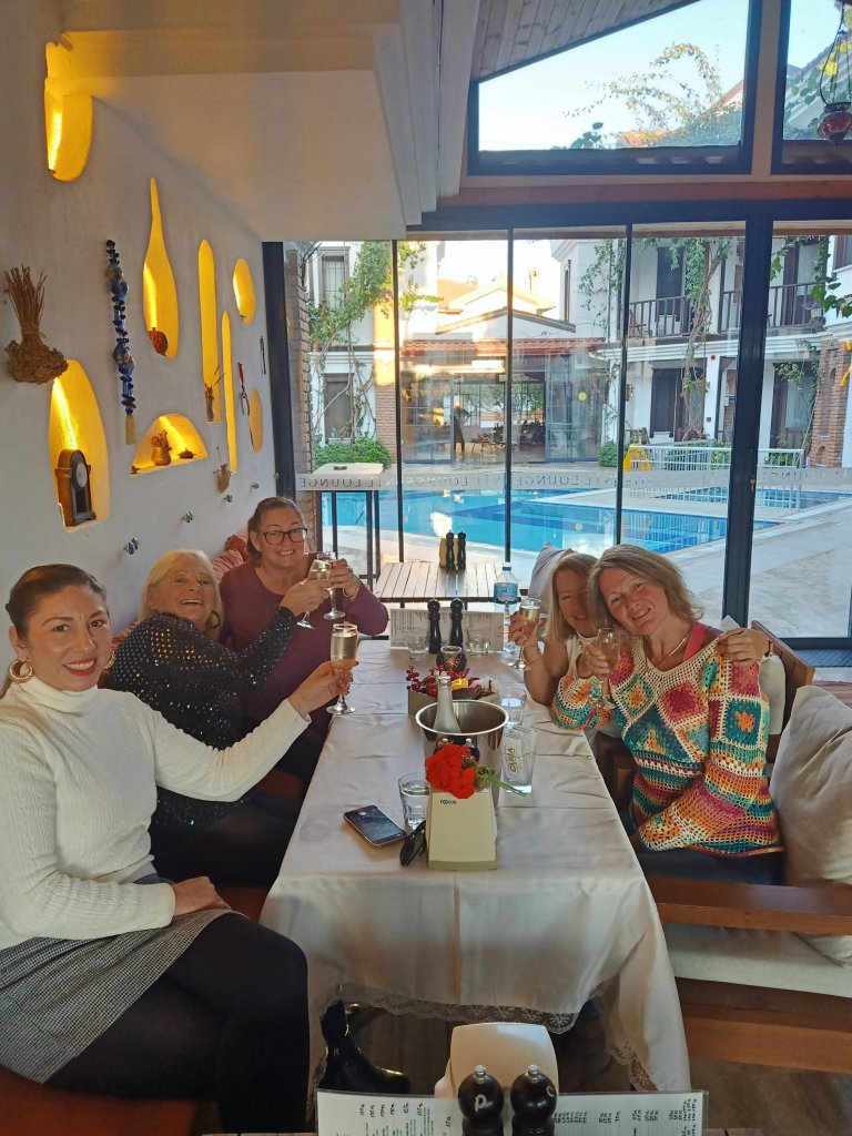 The afternoon started off very civilised but you know you’re in a bit of a pickle when Mark and Josh turn up, to help us all get home ok. During our luncheon a nice Russian hotel guest had bought Ghislaine a bottle of fizz and had it sent over to our table. This was very kind and we got chatting to Atyom who bought us more champers and was very lovely. He ended up buying several bottles but when we asked him to join us for a drink he said he didn’t drink alcohol but he would have a coffee with us before he had to go to Dalaman to meet friends. By 7pm we had asked for the bill and were sorting out who owed what. Kate ordered Fikri’s taxi for Carol, who could not pronounce where she lived, and called her husband to ask for the address. Ghislaine decided to get in the same taxi, despite living at the opposite side of town to Carol, and she forgot to take LuLu the dog home. Mark and Kate went home in their invalidity scooter, Josh and I walked back to Jamie’s and Lulu was invited to stay by the fire at Nil Lounge.