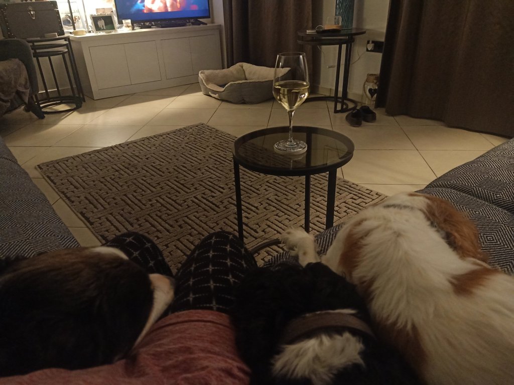 I had a late lunch of leftover curry with steamed rice and played outside in the garden with the dogs. All 3 of them were getting along much better now and they were less jealous of my attention since walking them all together. We watched TV while all 3 dogs stayed near to me and each other, which was sweet. I had another healthy meal of chicken and veg pasta for dinner and I had some of the white wine left over from the other night. When I got off the sofa for more wine the dogs spread out and I couldn’t get back to my spot.