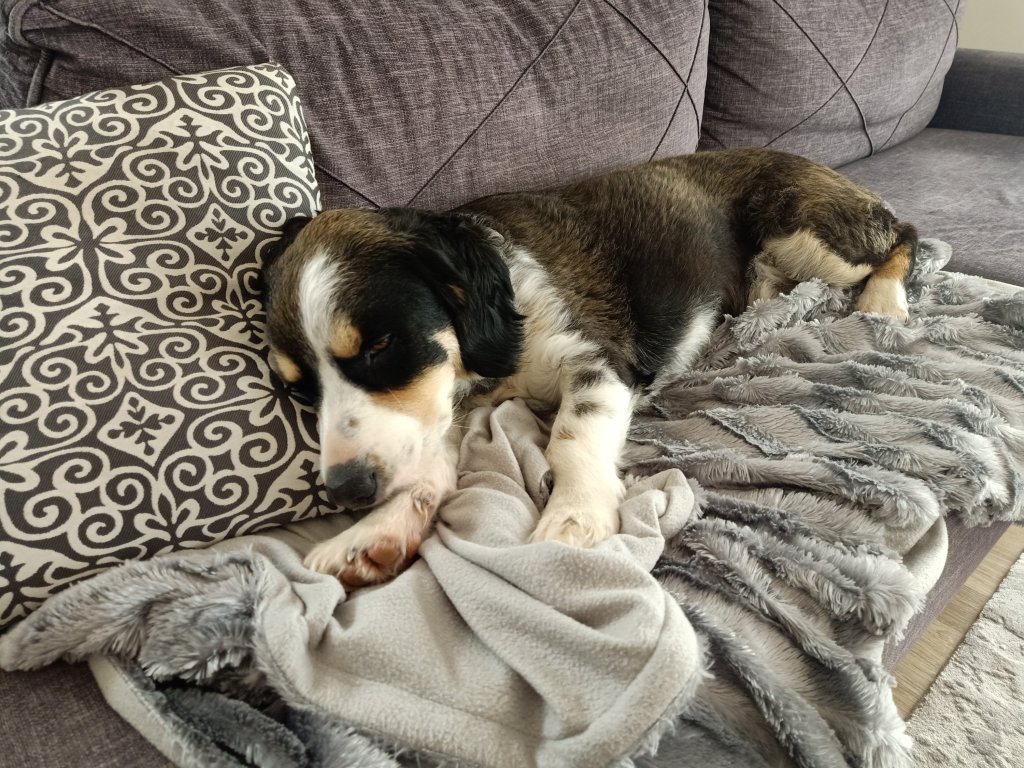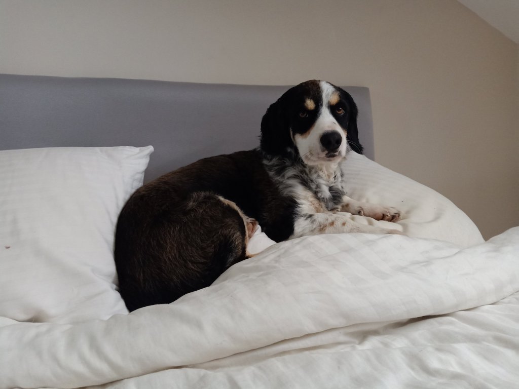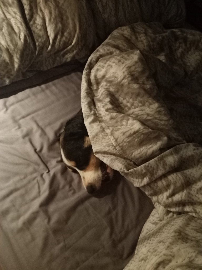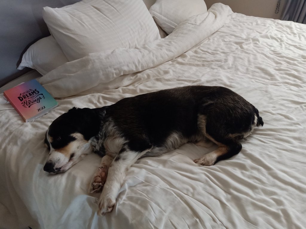 As Charlie and I moved back in to the top floor apartment, Helen messaged me with sad news and I decided to give her home a bit of a spruce up. I took the Christmas tree and decorations down, hoovered up and checked with Katrina if it was ok to use the shower, now that the plumber had fixed everything. Jamie had already said I could use his shower if I needed to, which was very kind, but I could go to Captain Caveman’s place quite easily. Katrina confirmed it was ok to use as the leak had been fixed and she wanted me to try it to check all was well anyway. After putting all my stuff away I went to see what Charlie was up to and I found him on Abi’s bed. We went out on to the front roof terrace and I noticed that the hot water tank was spewing out boiling hot water so I let Katrina and Mehmet know. Charlie seemed to be pleased to be home but was a bit out of sync. I think he was either expecting Helen and Abi to be back or for me to be leaving him, because of all the bags. He even laid on what was Captain Caveman’s pillows as if he was hoping to find him back in the apartment. We had quite a long dog walk around the area that Charlie knows well and then went back ‘home’ for a quiet night in.
