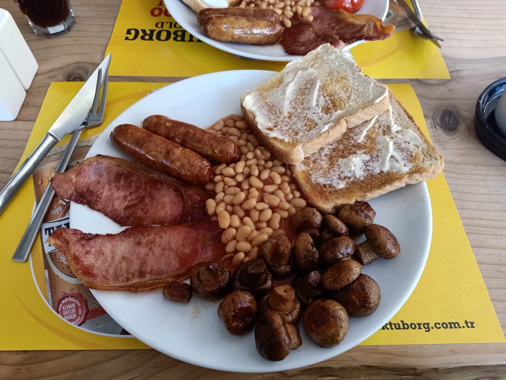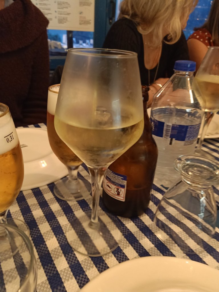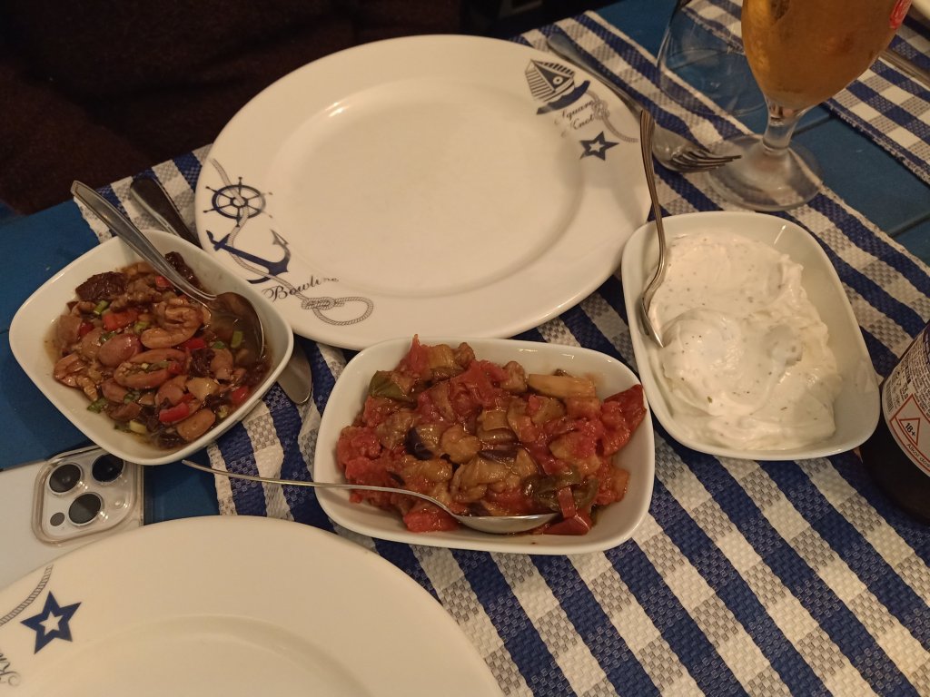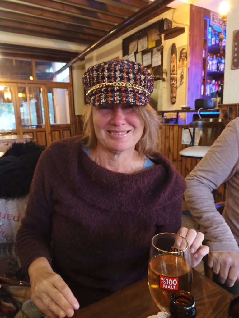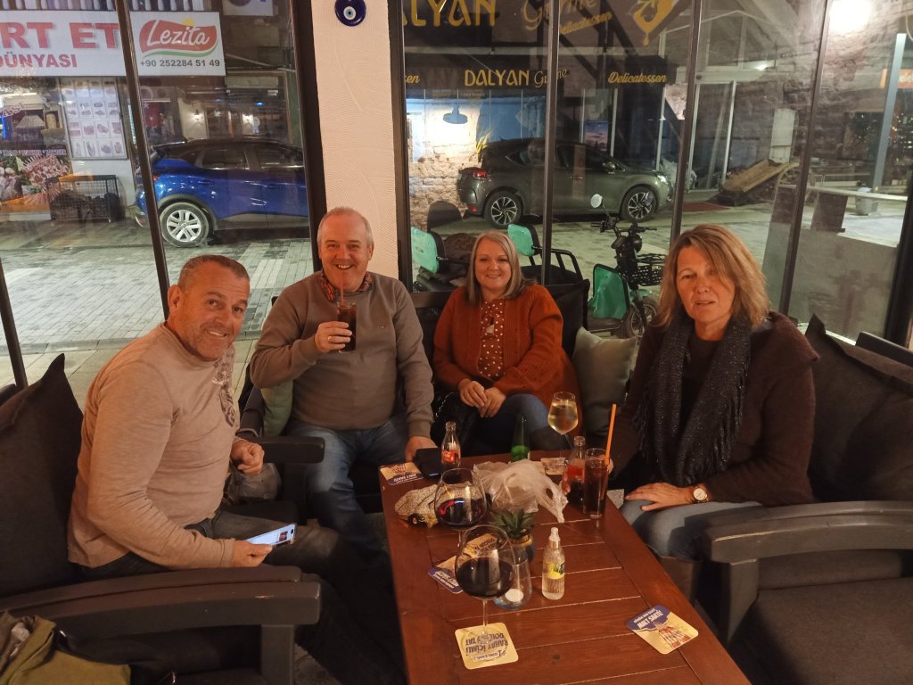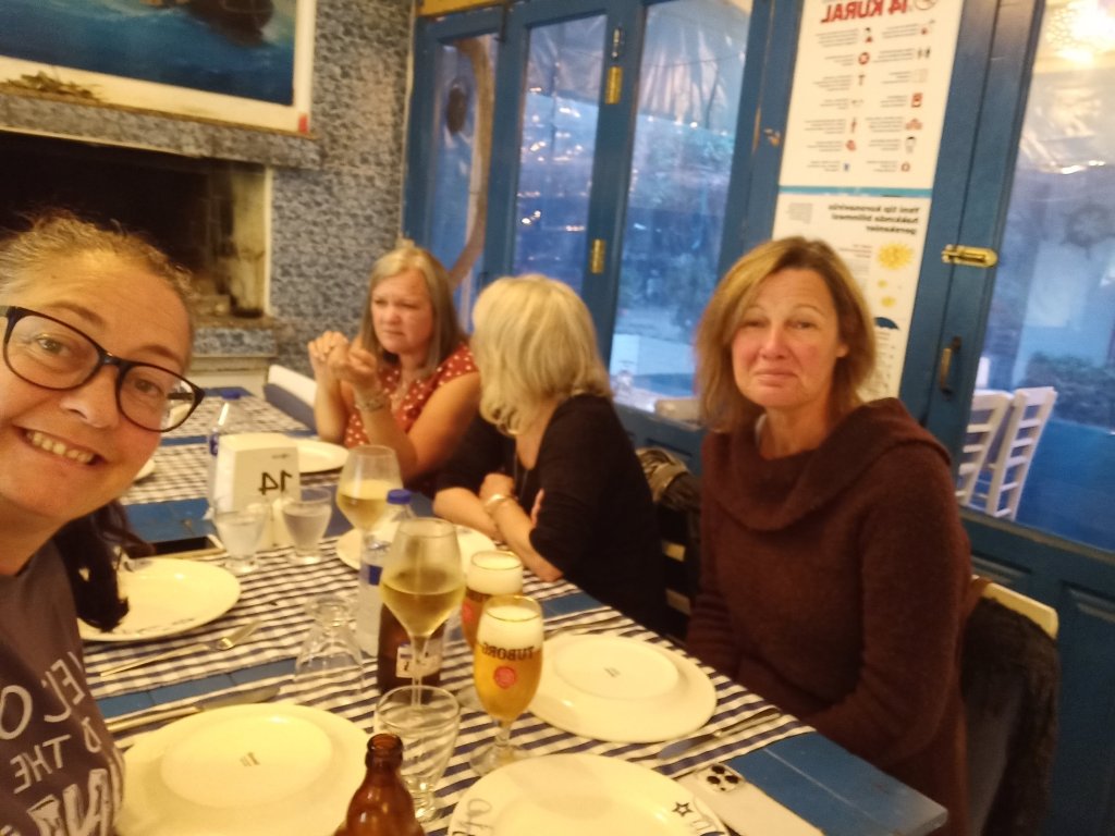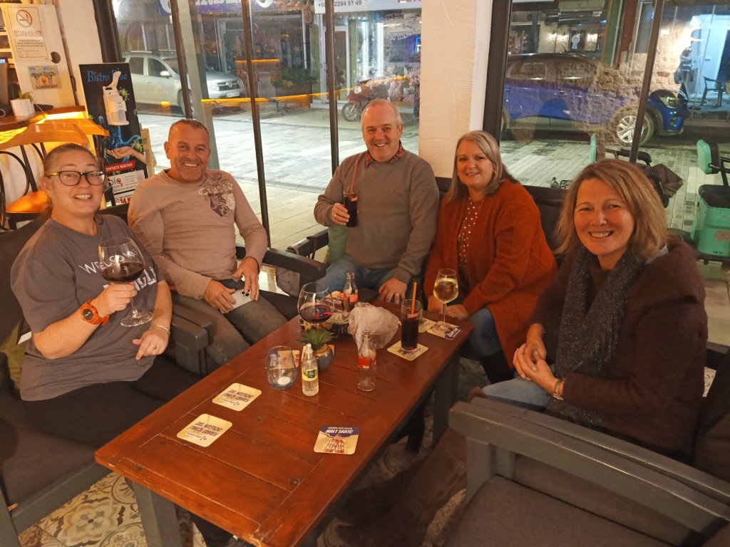 Armed with the dog food and Migros shopping at 5pm, I went over to Jiks where Matt, Vanessa, Janet, Kev, Mark and Kate were having a beverage and they invited me to join them. I had a couple of white wine & sodas and, for some reason, all the ladies were trying on each others hats. We had a good laugh with Vanessa who had told us that Madge had been accusing her of talking too much. Nanny Kay and Becky arrived just as everyone was getting ready to leave and we briefly discussed my belated birthday get together next week. Matt & Vanessa had booked a table at Balıkçım for Thursday night fish and chips. I wasn’t going to go on account of me (supposedly) being back on my diet! I was (so easily) persuaded and, while Matt, Vanessa, Janet & Kev set off across town to the restaurant, Mark and Kate waited to give me a lift on their mobility scooter. This was handy as I could put my shopping on the back and we were there in just a couple of minutes.