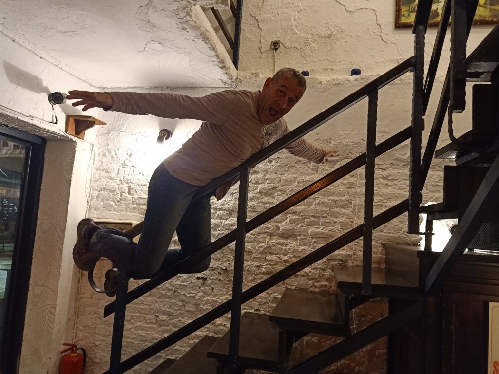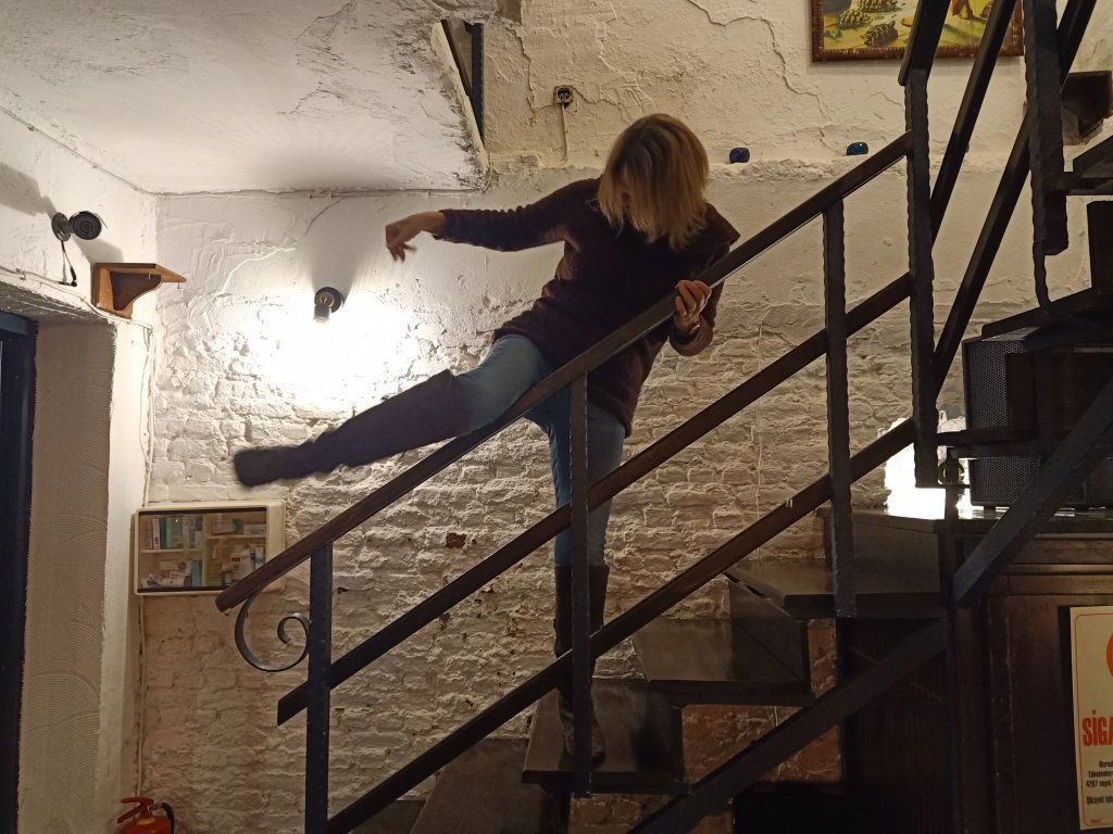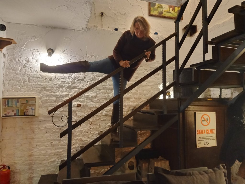 Inside Bistro Blue was nice and cosy at the bar area and it was only 8pm as we ordered drinks. I switched to red wine as I do like a red in Bistro Blue, Mark went from beer to red, Kate opted for vodka and diet coke while Matt had beer and Vanessa had a white wine and soda. The service was good but the music wasn’t as good without Selahı doing his DJing. We had a good laugh and when Matt and Vanessa paid their bill and left, I thought we would also be leaving. Mark and Kate had already said they would give me a lift back to Helen & Abi’s on the Puff Truck, it was on their way home almost and I was conscious that Charlie was on his own for the first time in just over 2 weeks. By 8.45pm Kate was doing some sort of drunken gymnastics on the stairs with the bannister and I was concerned an accident was waiting to happen. By 10pm Mark was also doing banister balancing which in turn lead to Kate having another go. Fortuitously no injuries were sustained and by 10.30pm I’d ordered the bill. I’d had 3 wines, Mark had 5 (we should have bought a bottle) but Kate had excelled herself with 6 vodka and diet cokes plus an extra diet coke. When the bill came it was a reasonable 80 lira (£3.54) per wine and 100 lira (£4.43) for a generous vodka and small bottle of diet coke. Mark and Kate saw that there was an extra 25 lira (£1.11) on the bill under ‘soda’ and argued they had not had a soda. This was actually for the extra bottle of diet coke Kate had asked for when she thought the vodka was a bit strong. I think Omer, the bar man, was happy to take it off the bill just to get rid of us, as Kate tried to pay on card. I paid mine in cash but Kate was too tipsy to be able to get the card and machine to do it’s thing. Luckily, I had cash on me so I paid the bill and took a photo to remind Kate in the morning.