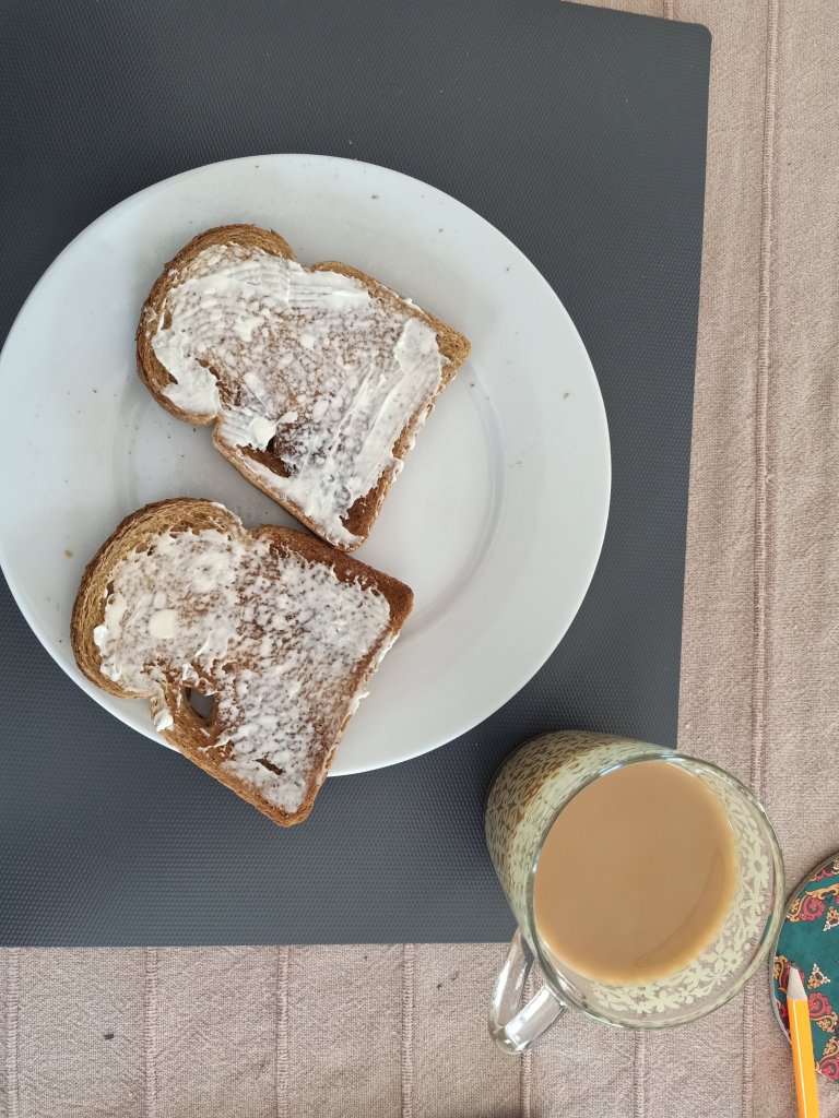 I put the defrosted livers in to a bowl of milk to soak for a bit, this takes away any taste of iron or blood. For breakfast I had wholemeal toast with a cheese triangle and a cup of Yorkshire tea.