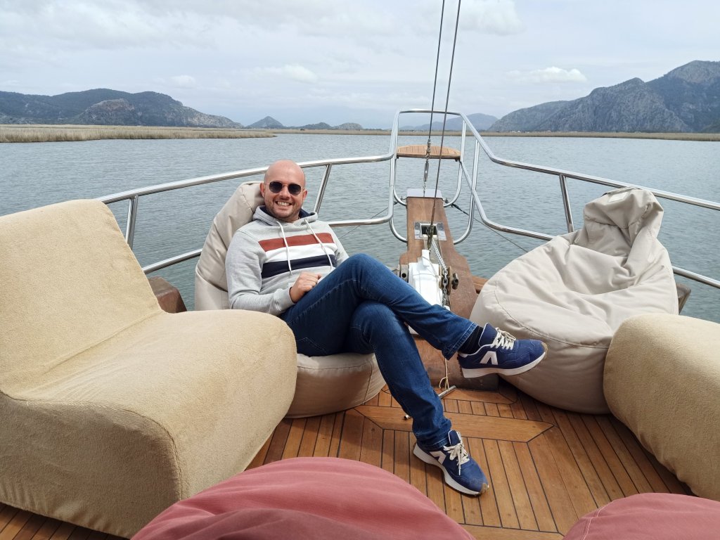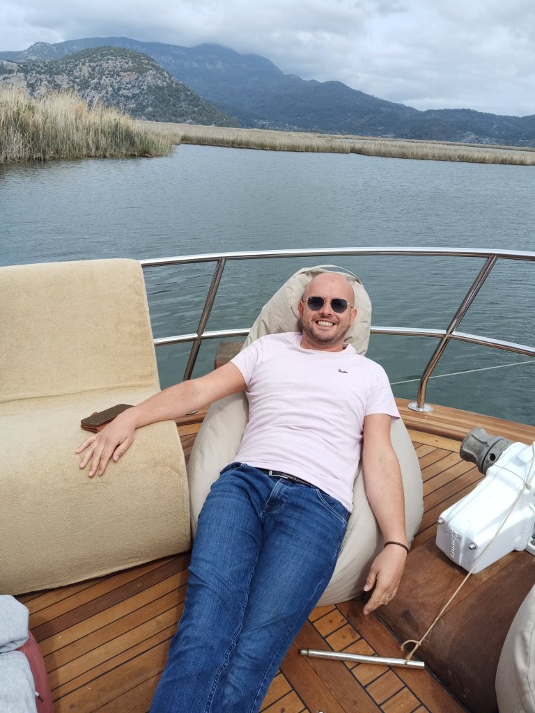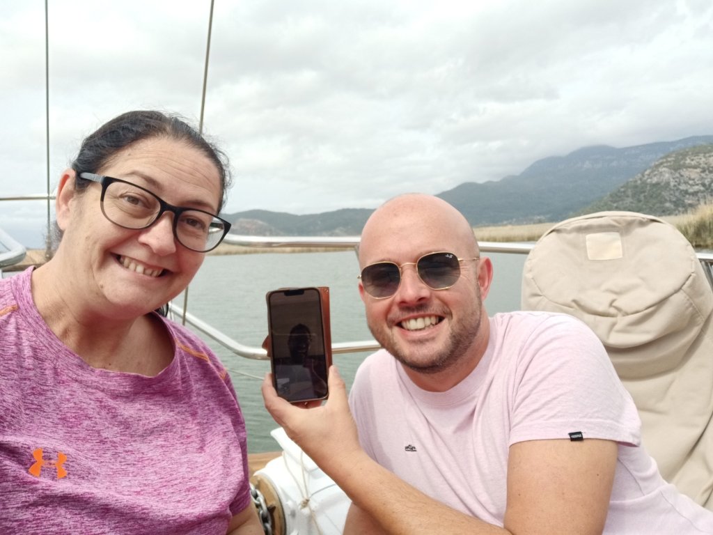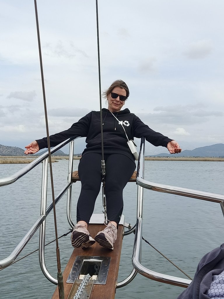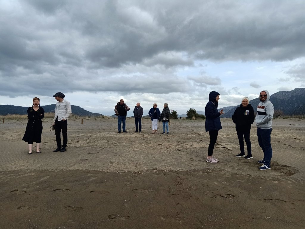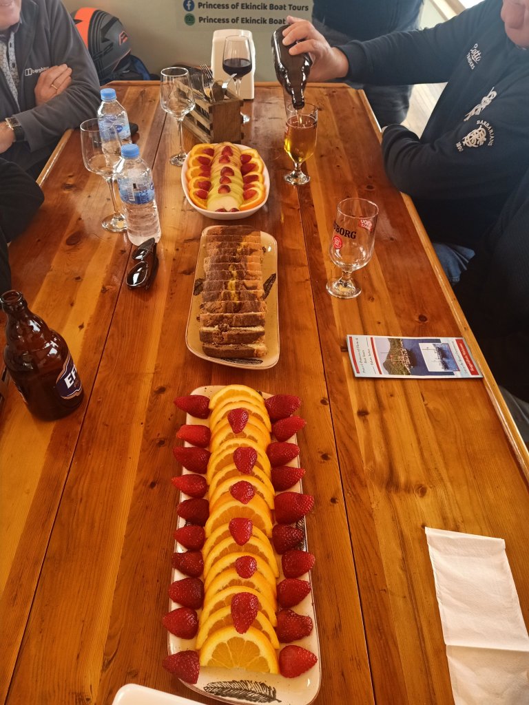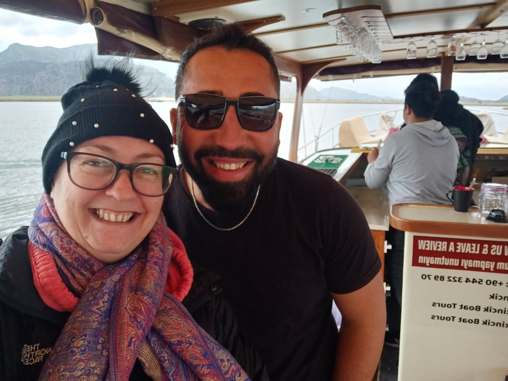 On board Princess of Ekincik with Captain Ismail and his team of 2 young Turkish lads, were Jamie, David, Christine, Nanny Kay, Viv, Paul, Anna, Amanda, Greg and me – 10 of us in total. There was only Anna who I didn’t know previously. Tea and coffee was served with fresh pastries and Ivona’s home-made cookies. We had to be quick with the cookies before Nanny Kay snaffled them as she’d had them before and was rather partial. I indulged and they have got to be the best cookies I’ve ever had. The pastries weren’t too shabby either and I had 1 each of the 3 flavours. My healthy eating was definitely on the back burner for today, although I had already decided that I would curb my wine intake in an effort to limit the damage. Our first stop of the day was at Little Dalyan so that those who wanted to, could go for a walk along the beach or even chance a swim in the sea. It was too cold and blustery for me to chance it and most were content to just be there and have a leisurely walk along the beach. Amanda and I collected shells, Jamie collected glass and it was all rather pleasant. I had a bit of a shocker as I found out that Captain Caveman had lead Anna to believe I was disabled. She seemed rather impressed that I could walk on a beach and asked if I was managing ok. When I asked more, it turned out that Captain Caveman had said I ‘didn’t’ walk because of the leg injury in April 2020, which she’d interpreted as ‘couldn’t’ walk!!