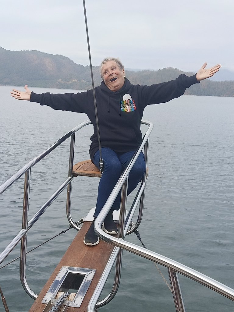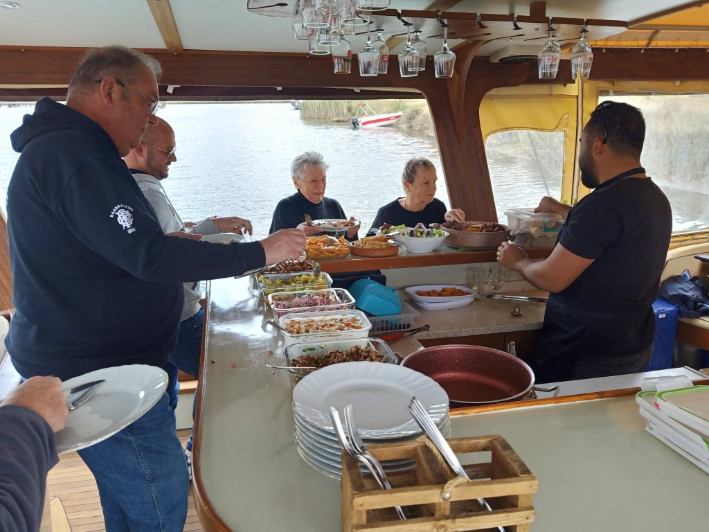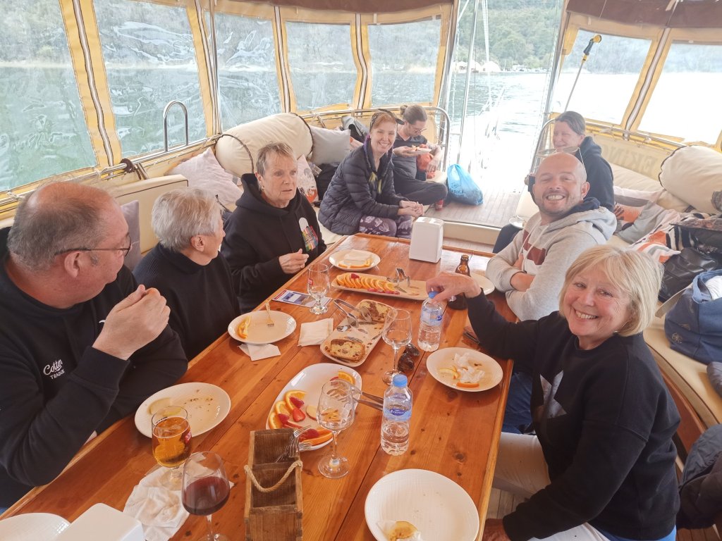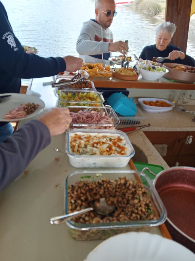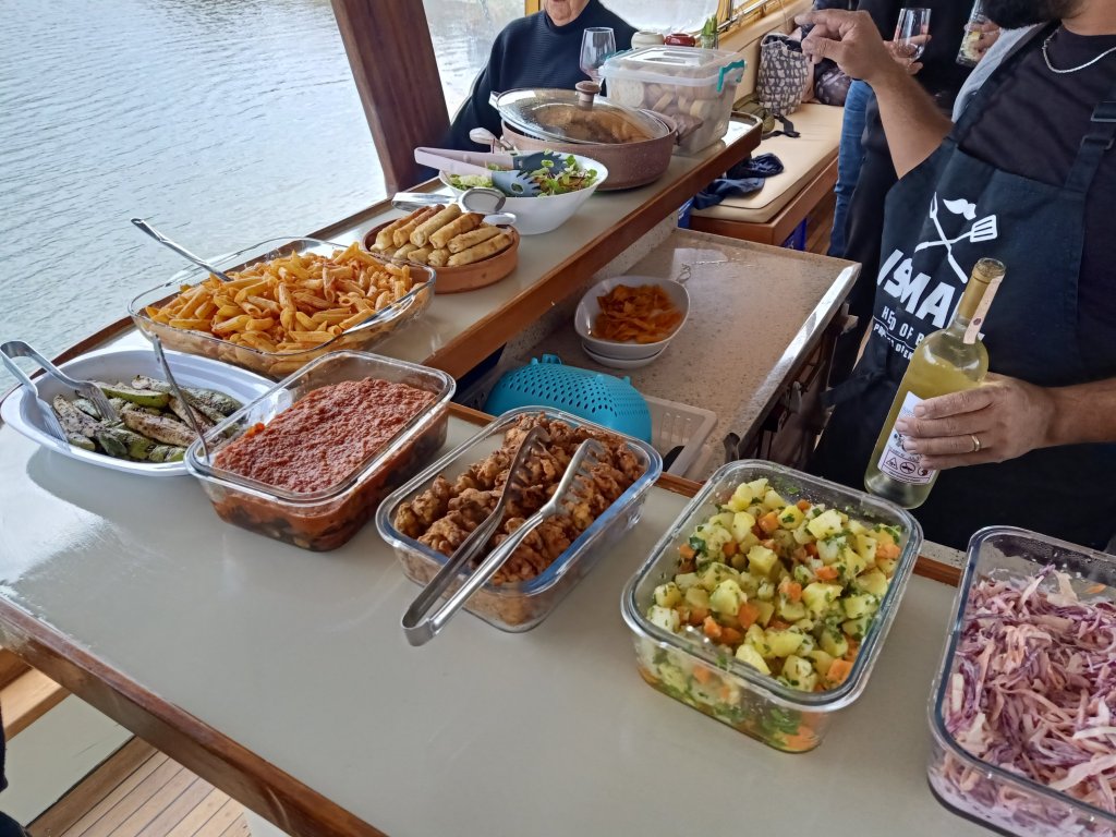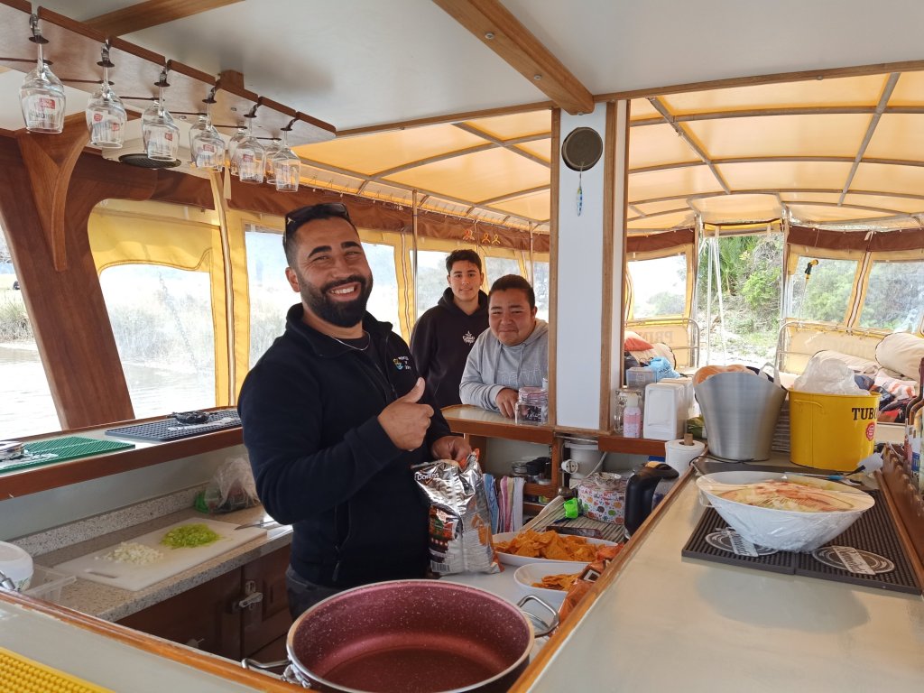 We were back on the boat just before noon and I decided to take one for the team with Jamie and sample the beverages. It was the first trip of the season so we needed to check the beer was cold and the wine was up to scratch – it was. Jamie had Drew on the phone and I tried to get a photo with him on the screen. The sun was out and it had turned out quite pleasant as Ismail was getting ready to prepare our BBQ lunch.