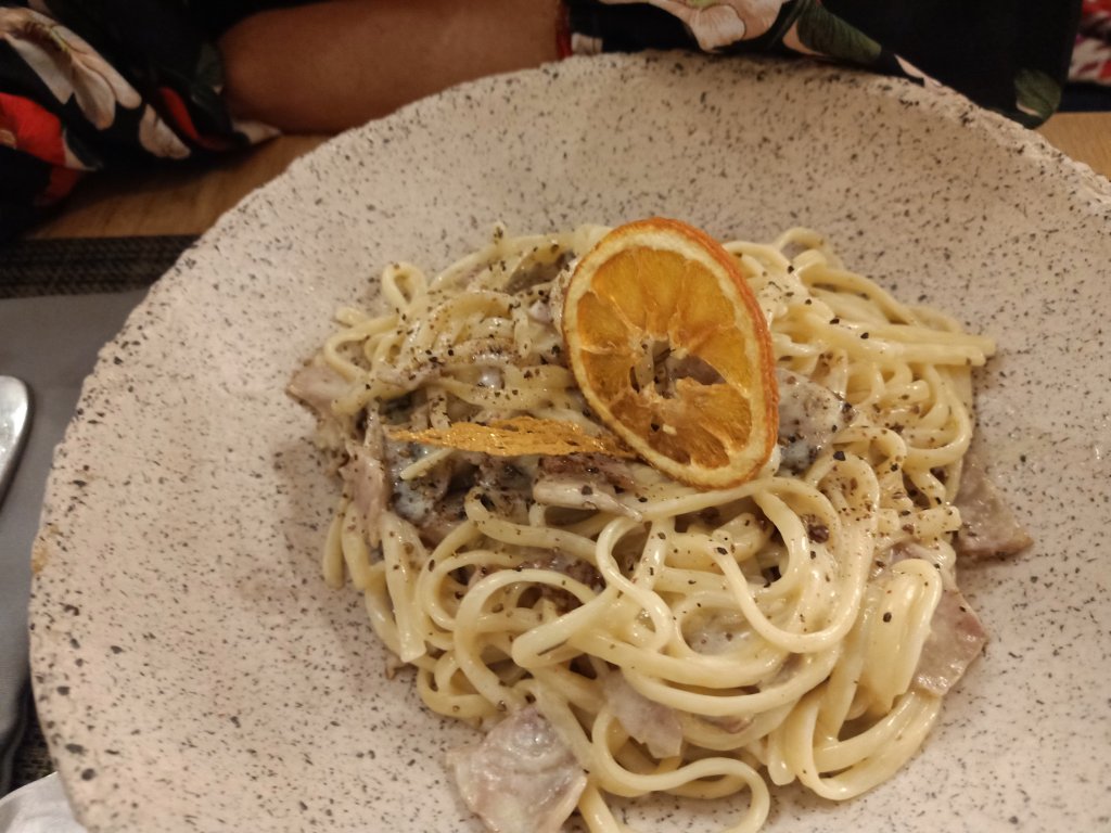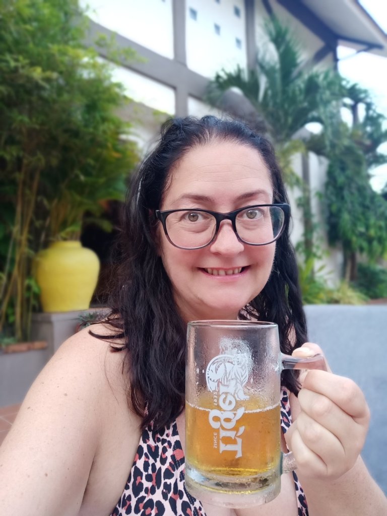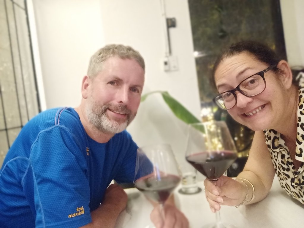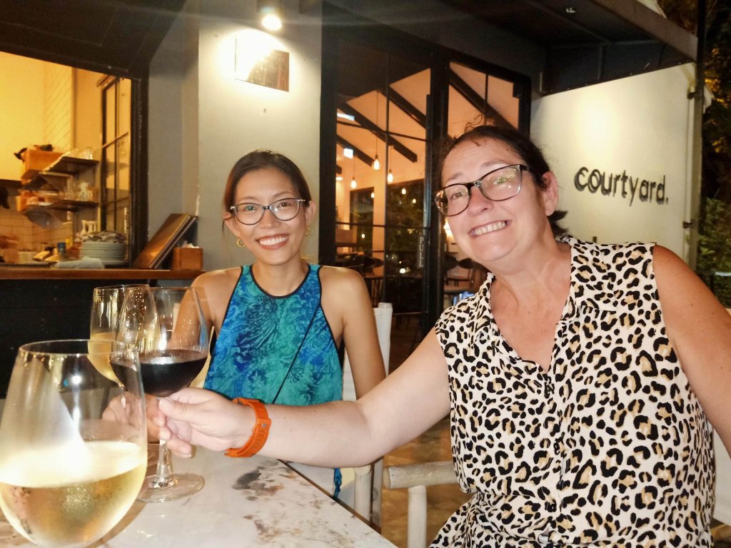 I decided I would work from Victory Road Villas (VRV) in the afternoon/evening when it was ‘cool enough’ to cycle there. Tatas had also suggested that we go for a curry tonight at Ganesh, the fairly new Indian restaurant, so I planned to finish by 8pm. For a late lunch, I ordered fried veggie spring rolls, a mango lassie and some peanuts. I drank water and the staff put the AC on straight away today, which was nice. I had a Bang soda, which is just soda water in a glass bottle, as I finished my work for the day. Tatas wasn’t able to come to meet me as she had work commitments so I stayed at The Villa’s restaurant and decided to treat myself to a glass of white wine and some pasta. The food was good and it didn’t taste spicy but then I found a chilli in the bottom. I did complain because I’m allergic to chillies and it transpired that, although the waitress had told the kitchen, the chef had forgotten.
