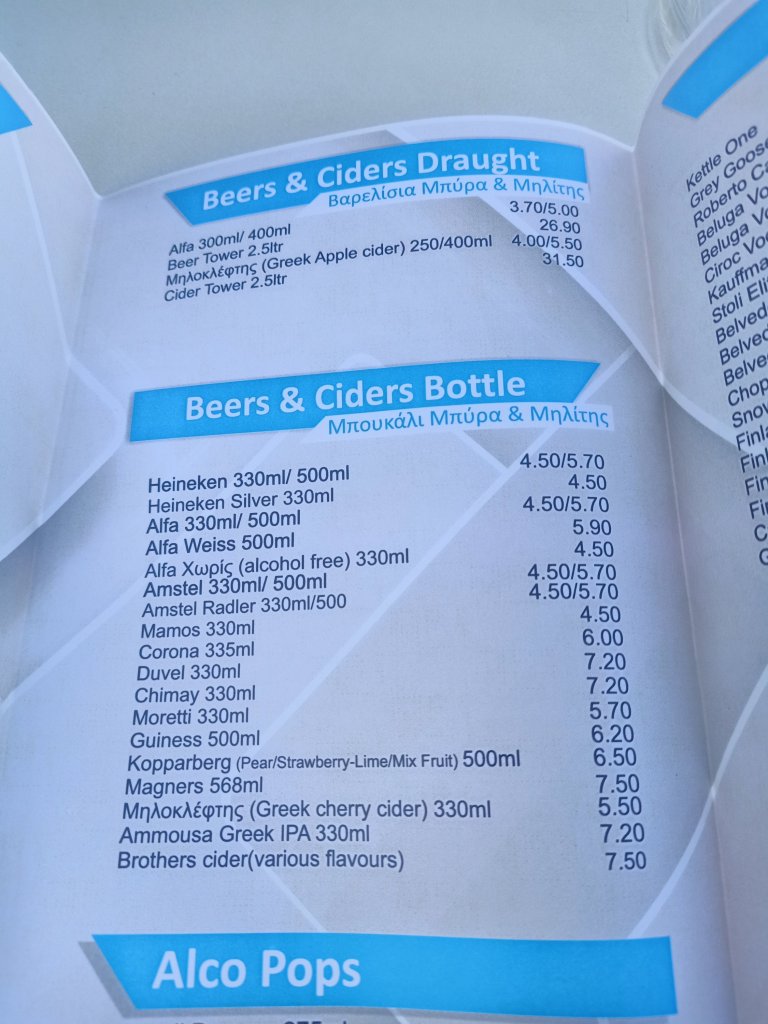 Here’s the food and drink prices, for those of you who like a look and compare to how it would be in your local restaurant.