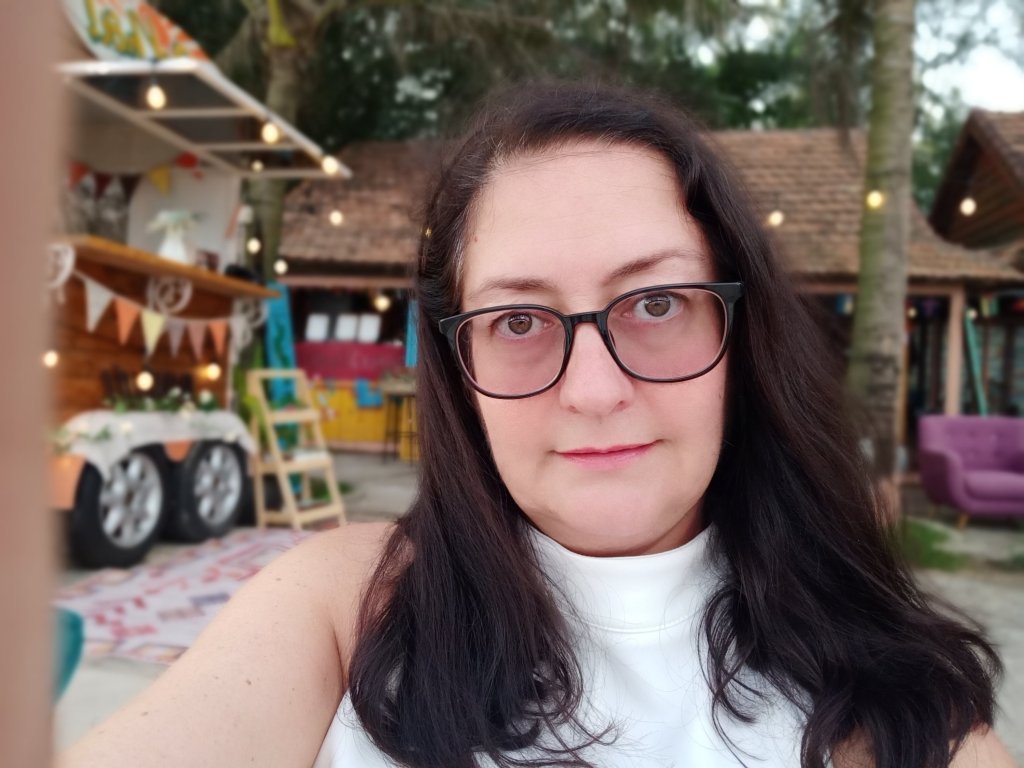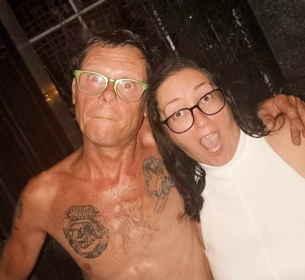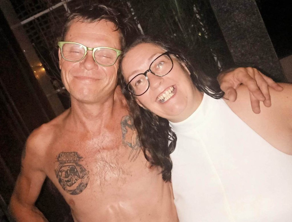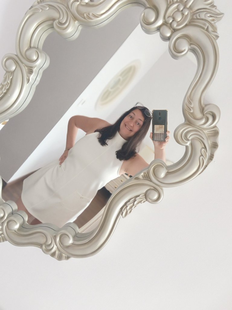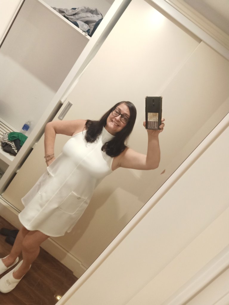 I got dressed, even dried my hair and popped on Carol’s white dress with the marked pocket. We were about to go to an unconventional 50th birthday celebration!