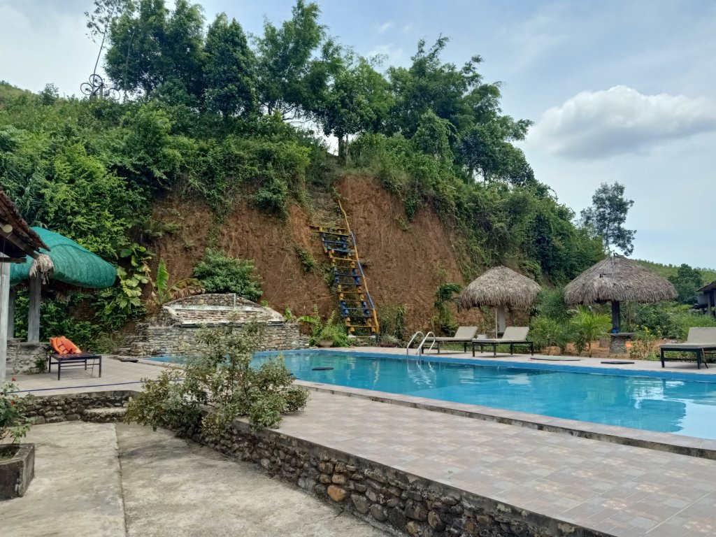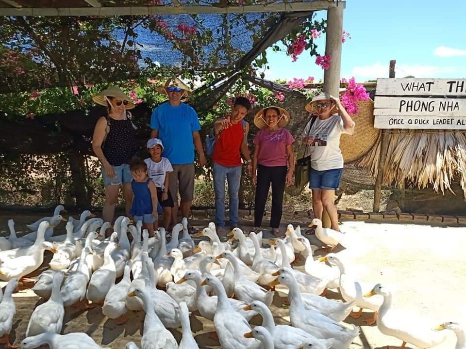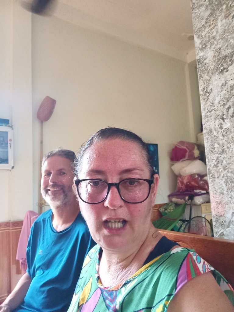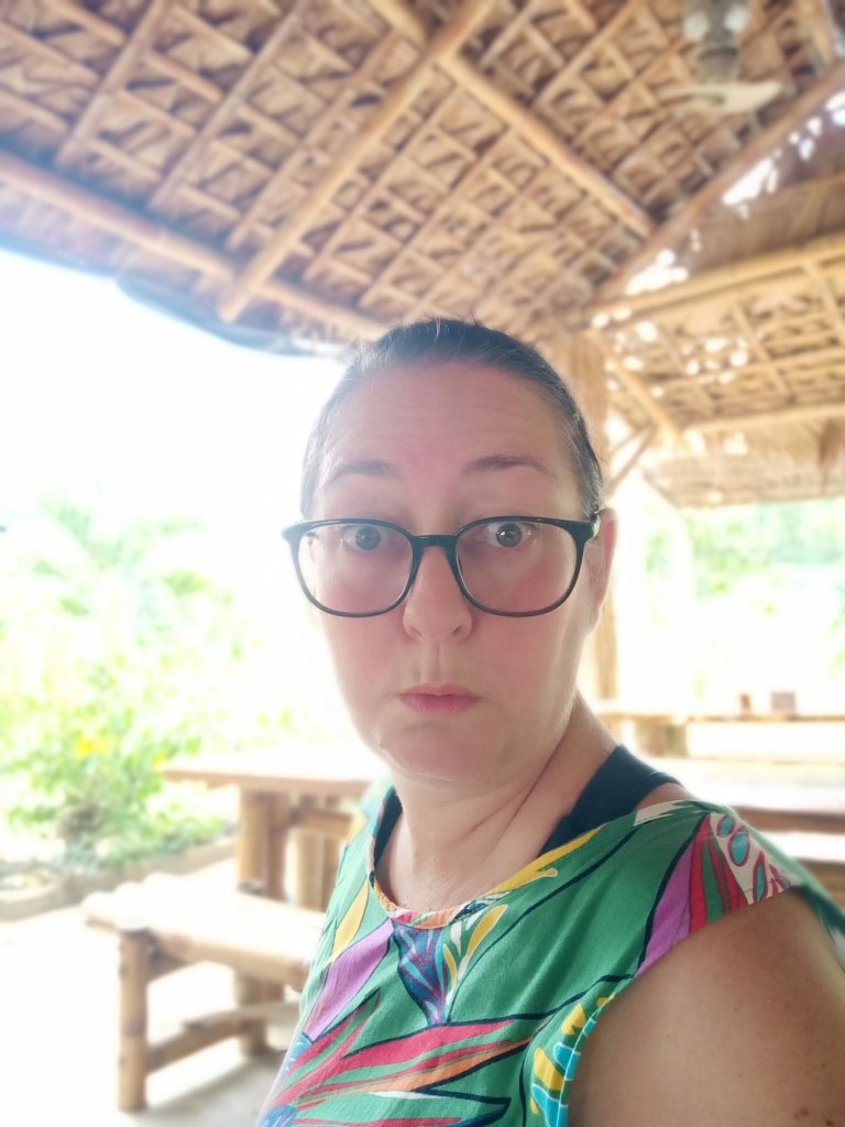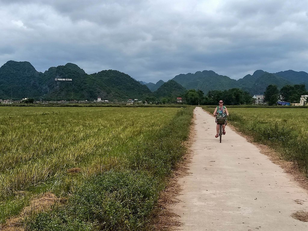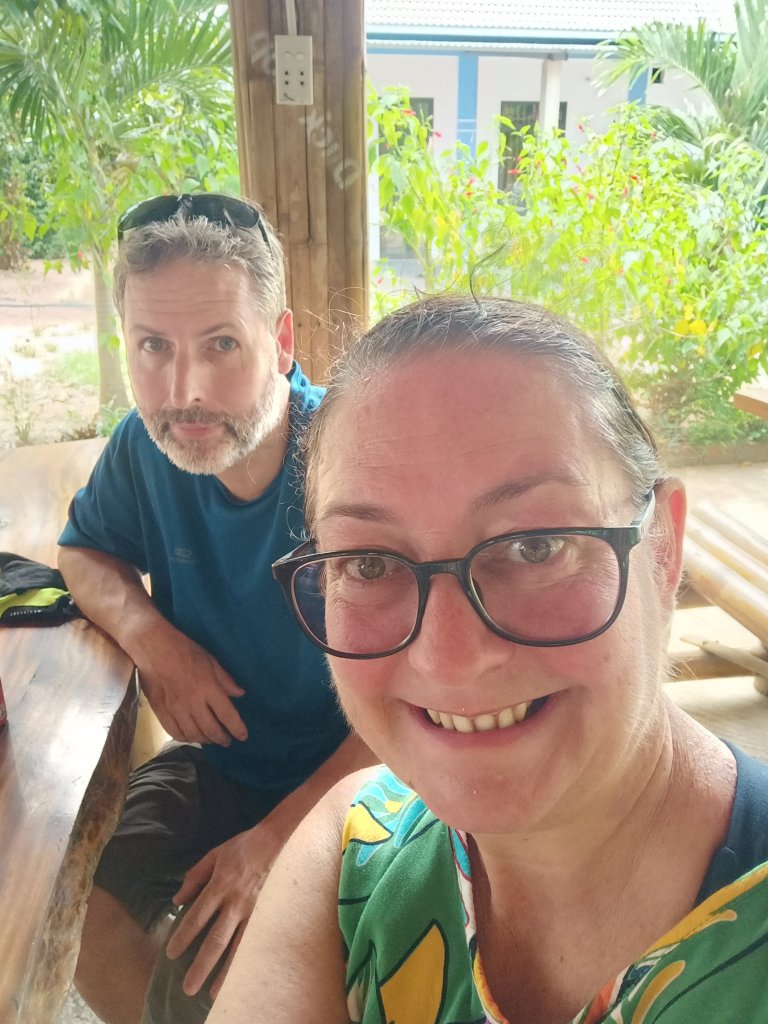 We cycled back through the valley and some of it was shaded which I was grateful for, some of it was steep and I had to push Bluey uphill. We soon ran out of water and I knew I wouldn’t make it back to Phong Nha in one go so Captain Caveman pushed Bluey for a bit and suggested a slight detour. Half an hour later, we were sat in Multi and Diem’s kitchen at the Pepper House being offered rice wine. I declined and had loads of much needed water while Captain Caveman had rice wine and beer (he’s an animal)! There were kids’ swimming lessons going on in the pool and I’m sure they were laughing at my red sweaty face.