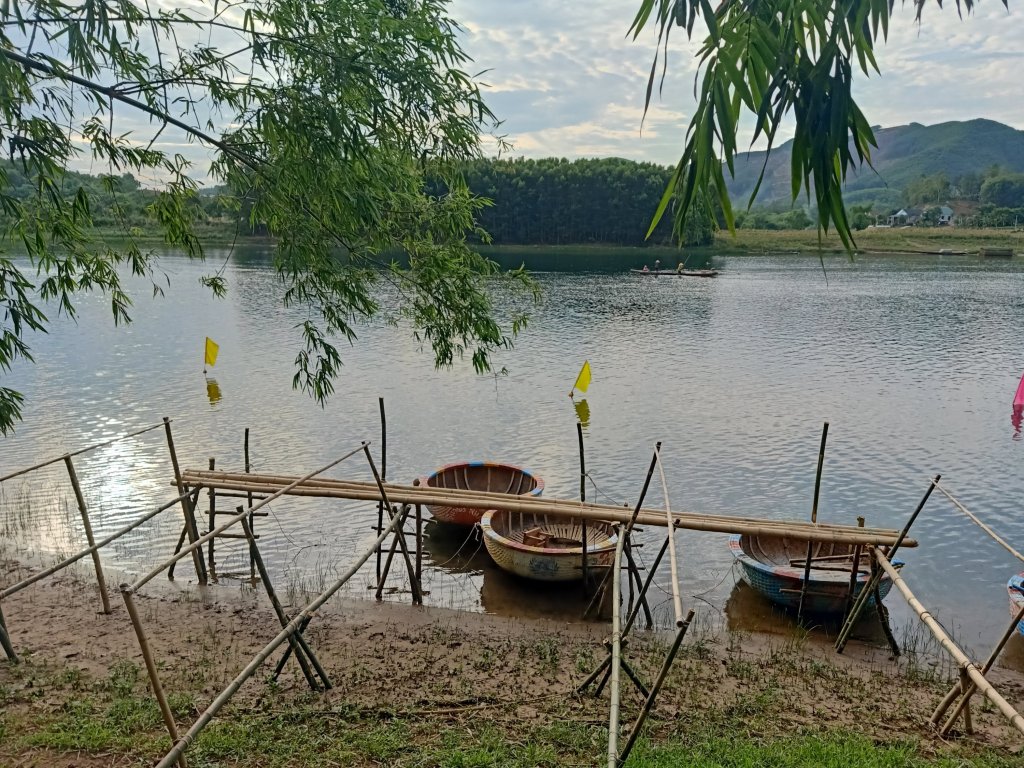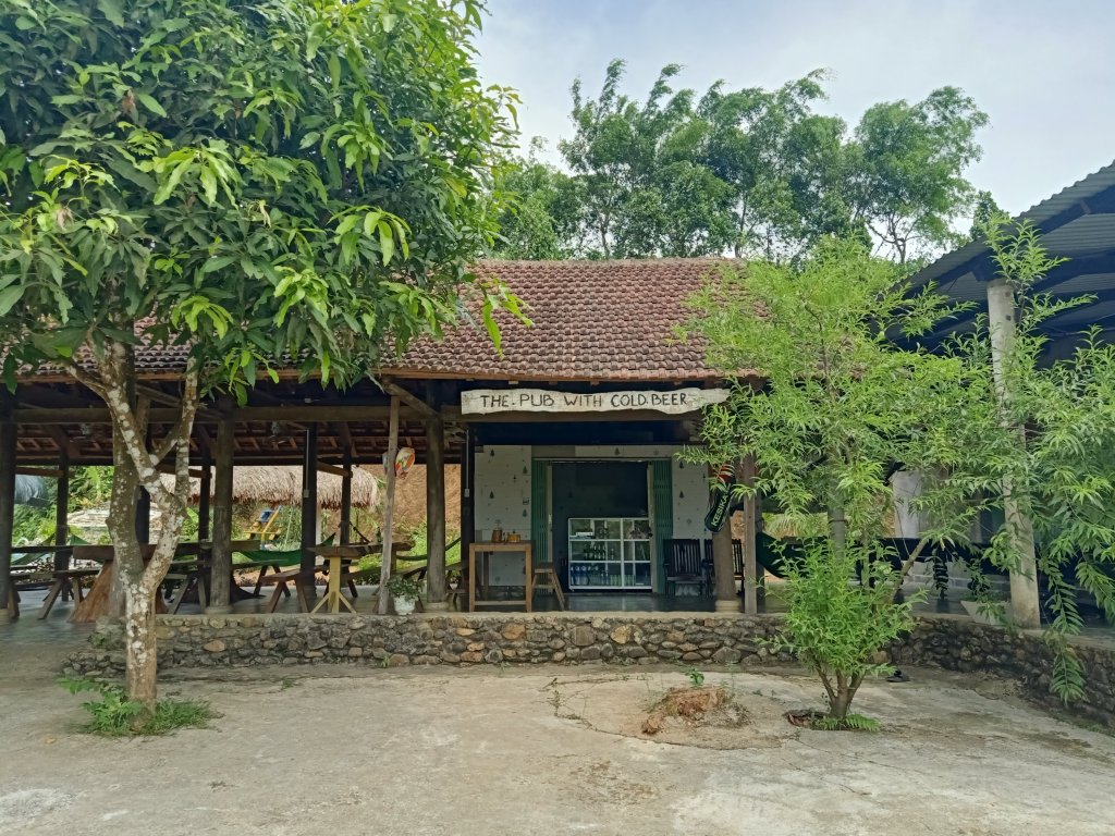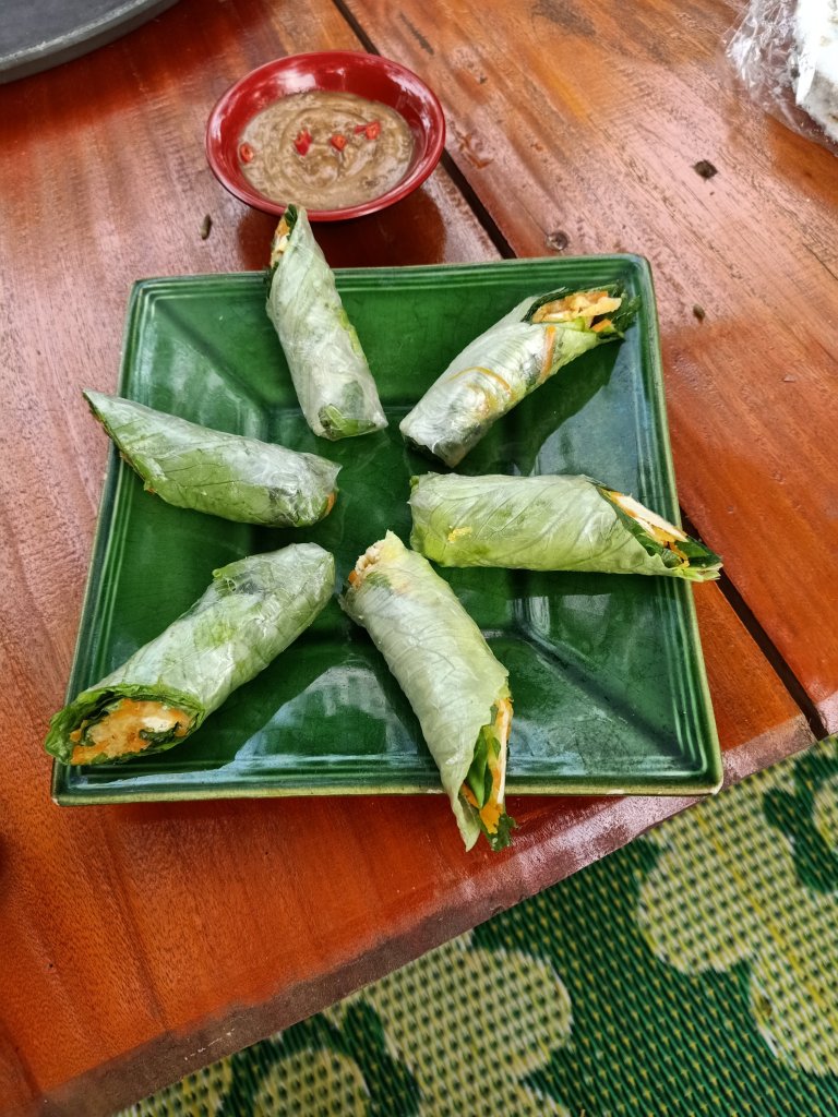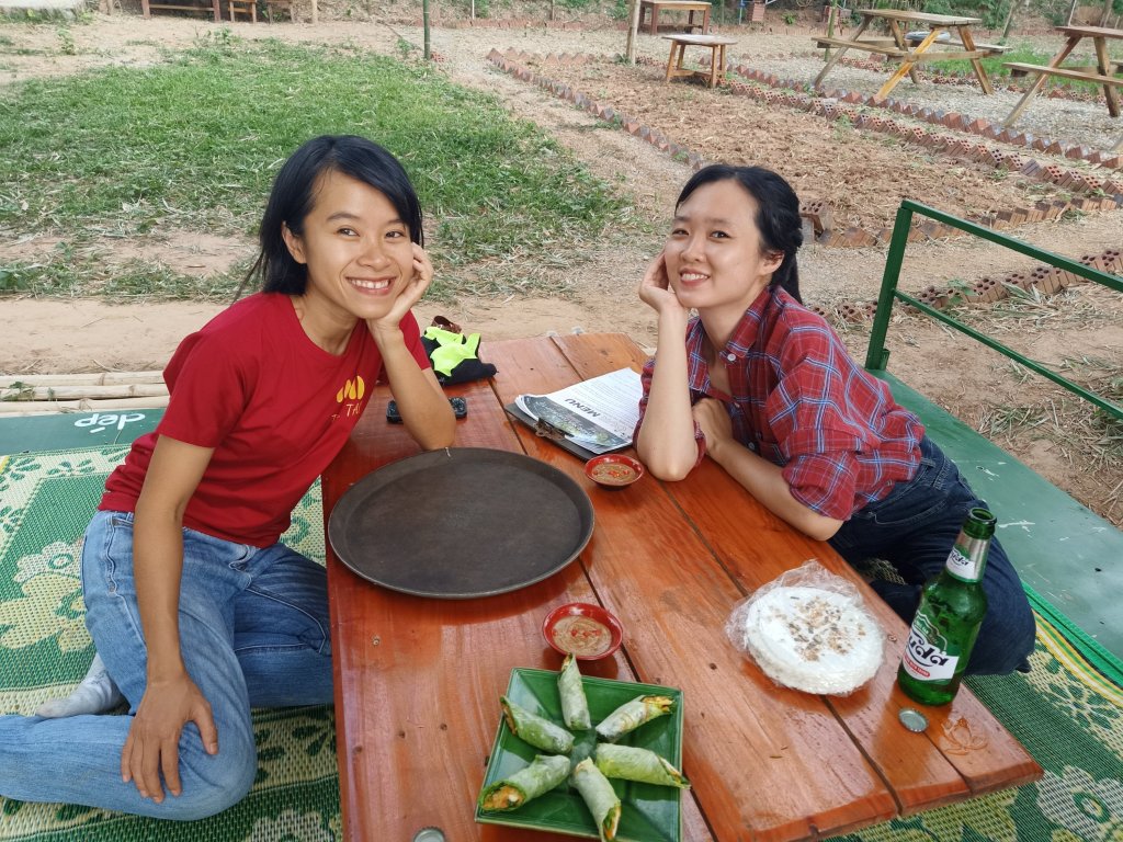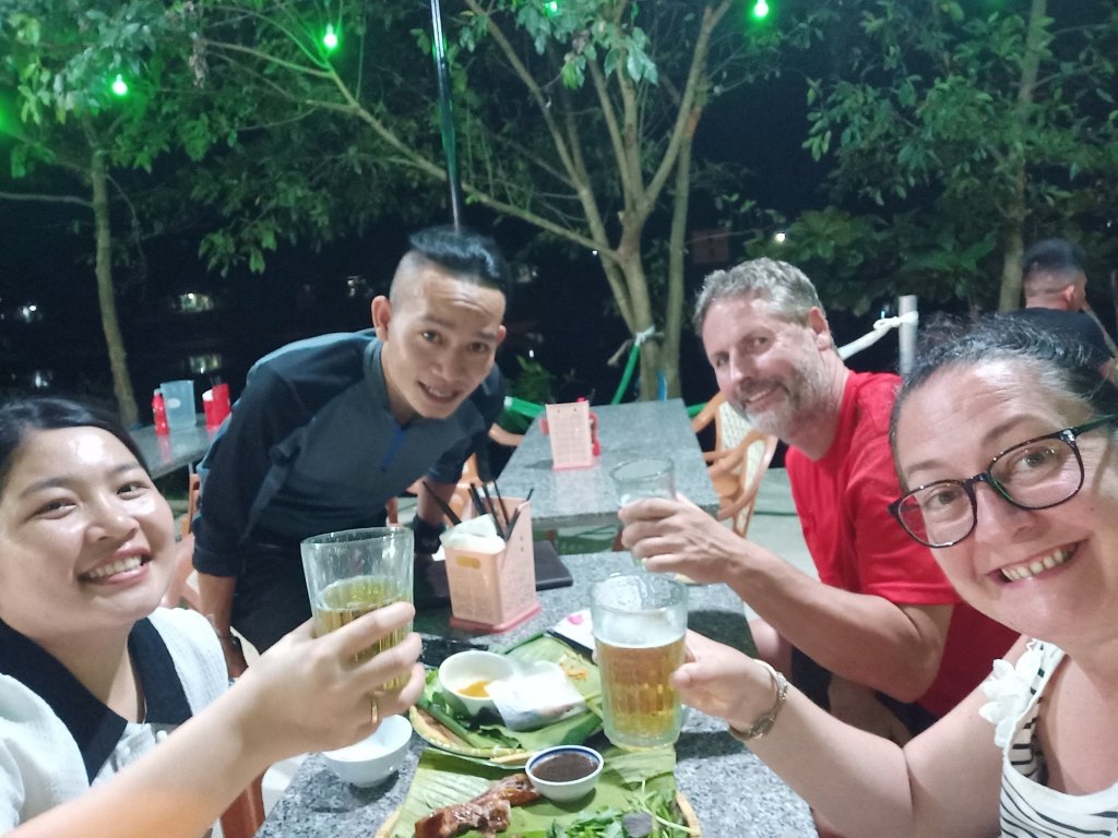 Phong Nha Funky Beach is a new venture owned by our friend, Mo (ex Oxalis colleague) and the previous owner of Greenfield Homestay. We arrived and sat overlooking the river on one of the platform style seating areas. It wasn’t particularly comfy for my achy legs but Mo was pleased to see us and was with another colleague of Captain Caveman’s, Nu, so they joined us. We had a cold beer, Mo brought us some vegan spring rolls and Nu gave us some vegan Banh Ep. Both were lovely but I was a bit distracted as it was already gone 5pm, it goes dark around 6pm and I hadn’t brought any lights. We said our goodbyes after a brief overview of the various activities that can be done there and set back off.