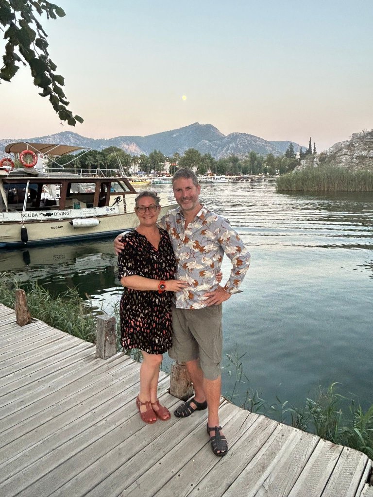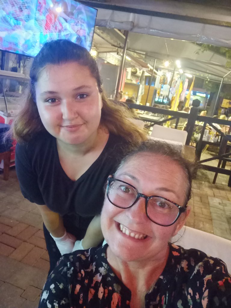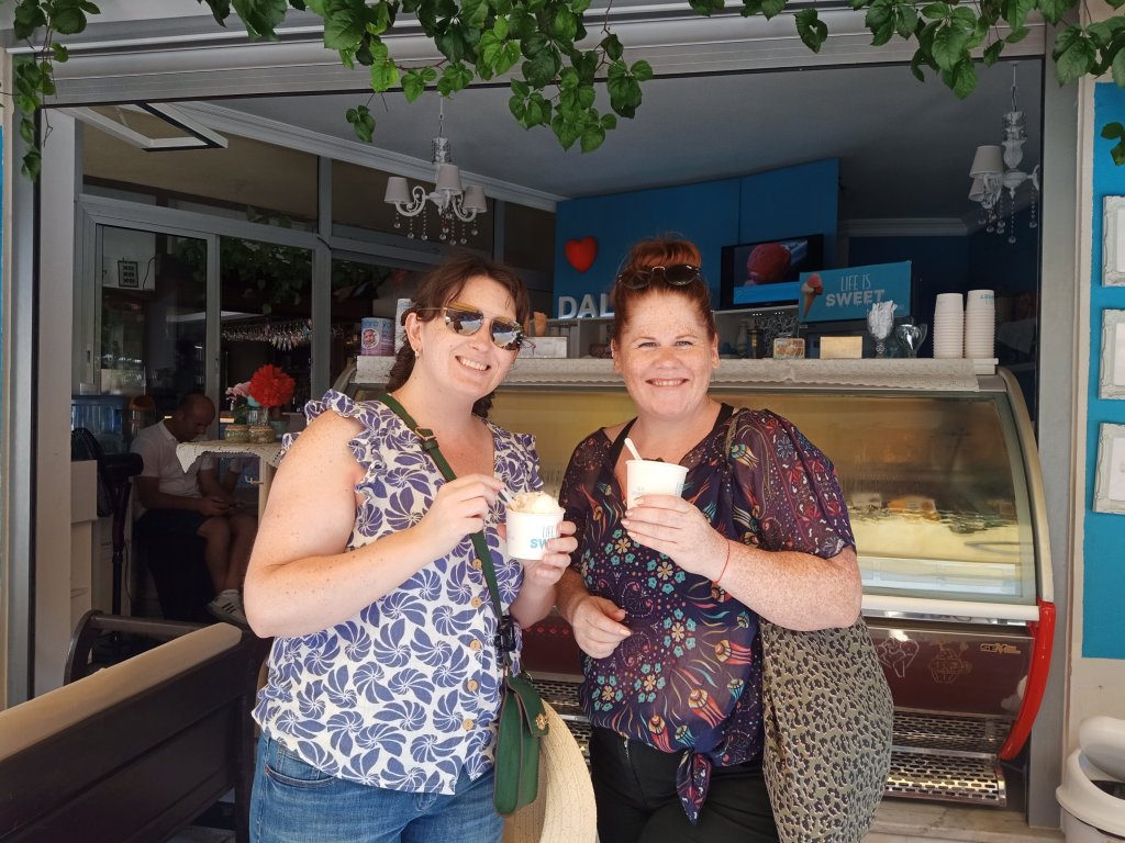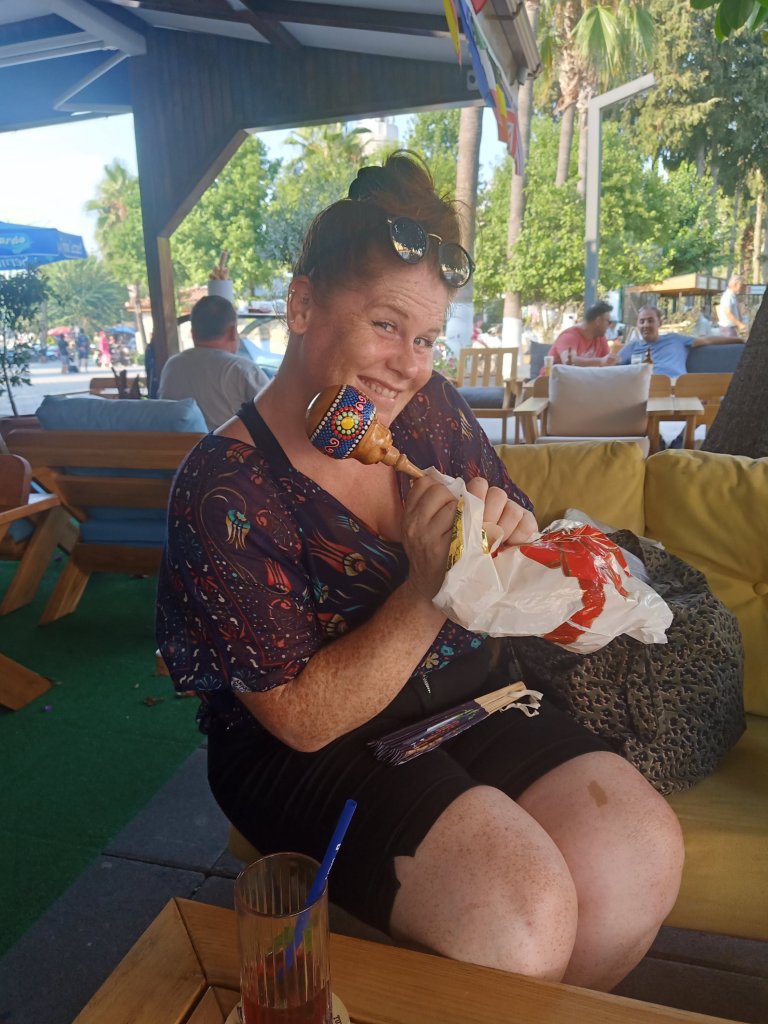 We ate at Bistro Blue that evening where Captain Caveman had liver & onions for a starter and Kelly had the onion bhaji. I didn’t have a starter as I knew I’d be having a big main meal. We shared some Allure rosé wine which went down very well and for mains we ordered a steak with onion and mushrooms for me, a chicken casserole for Kelly, and Captain Caveman chose the chicken & halloumi salad. I loved the food and was very full after eating all my dinner. As we drank more wine, Clare messaged to let us know she had finally landed at Gatwick but she had been one of the lucky ones. I managed to squeeze in the shared dessert of baklava with ice-cream which was delightful and not at all Slimming World friendly. We did a cheers with our complimentary amarettos to our last night together and recorded a birthday message to the other Claire, who hadn’t been able to make it out to Dalyan this time. The bill came to 2,800 lira (£83.58) for the 3 of us. All was well except for the fact that Captain Caveman was able to ascertain that Kelly’s flight was probably going to be cancelled before she got informed of it. The plane was still in the UK and would not be leaving any time soon so it would not be likely that Kelly could get on it from Turkey. Fikri was still on hold though for 1am as we weren’t sure if she was definitely going to the airport or not.