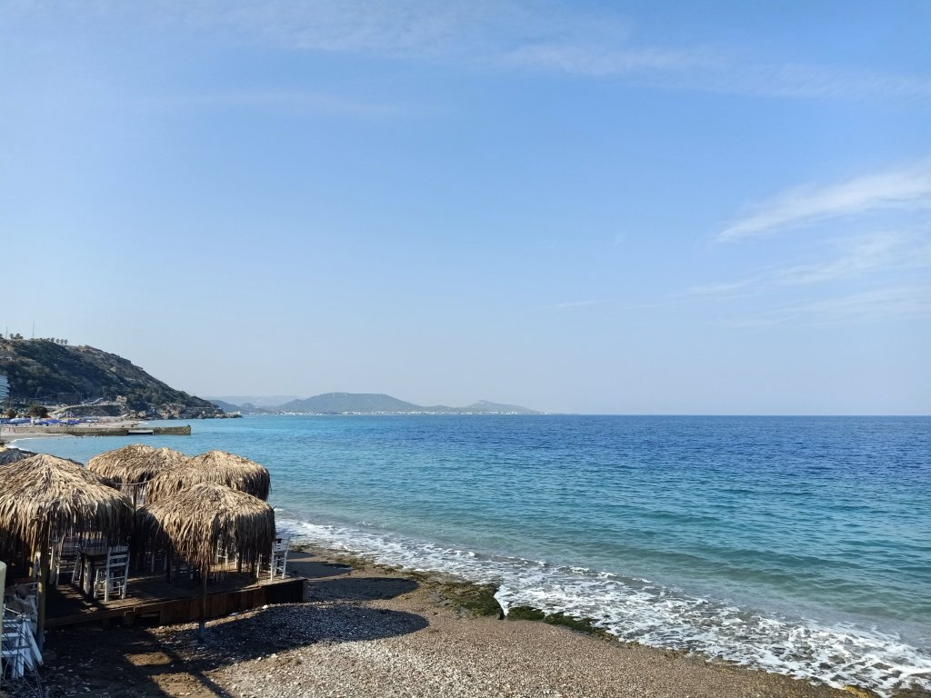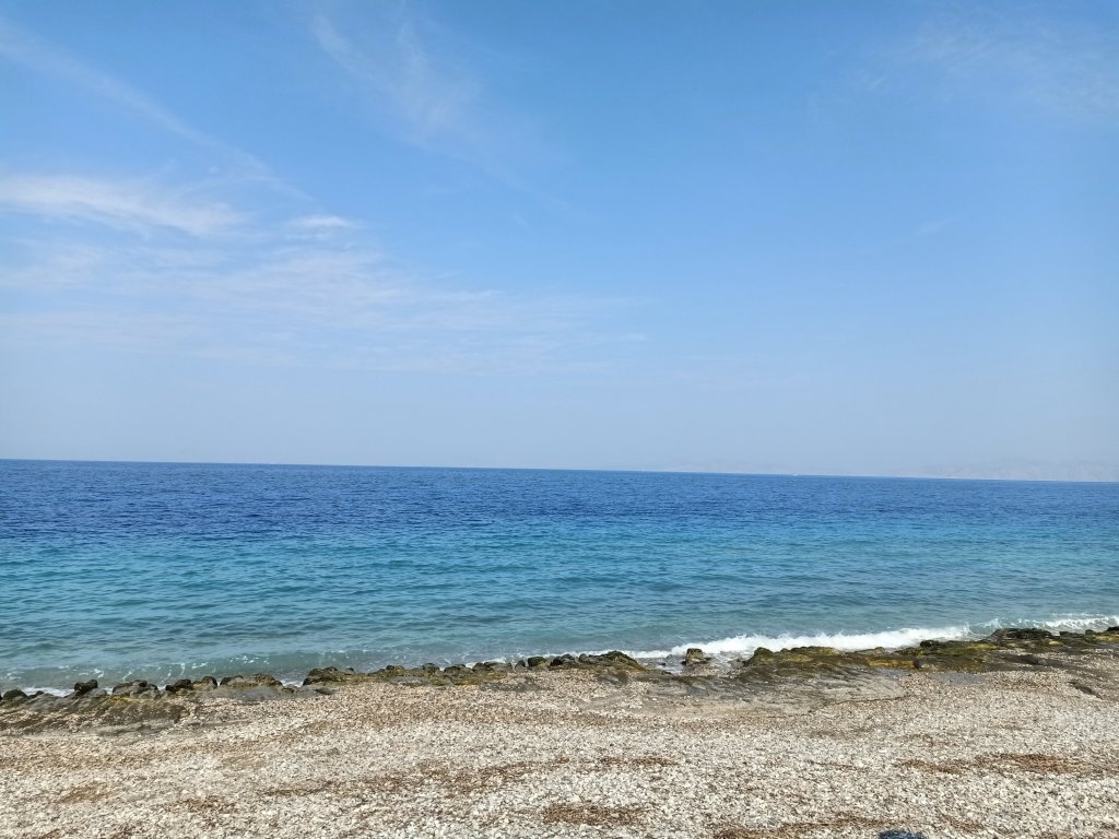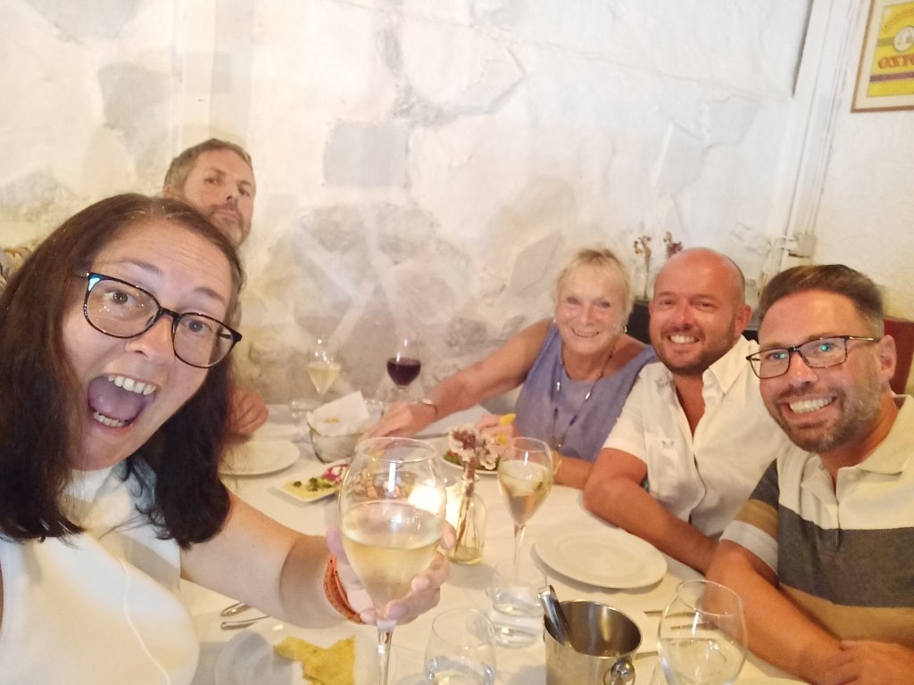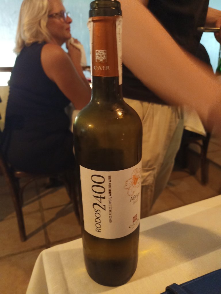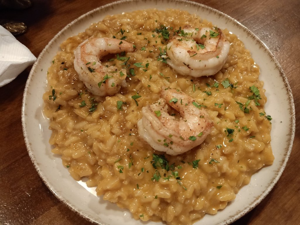 Unfortunately, Jamie and Drew were not impressed with their meal as it was the same size as our taster plate. At €21 (£18.35) just for that course, it wasn’t good value for the size of it. It didn’t help that a storm had started, the restaurant was full but some of it was open to the elements as the rain got heavier and started to come in through the ceiling and the large windows. Our table was getting very wet and we had to move to the bar to finish our last 2 courses but, to placate customers, the waiter served everyone that wanted one a glass of champagne. Then the power went off and the chef continued cooking in the dark on a gas stove. We were assured our risotto would be served soon and given top ups of fizz while Jamie started making his point about his stifado portion being on the small size. The waiter told Jamie he didn’t have to pay their bill, which also included their drinks. Jamie insisted he would pay all or some of the bill (I wasn’t following exactly by this point) and put forward his card. As the storm had affected power, the machine wouldn’t work so he ended up not being able to pay at all. The waiter said it was on him, as they weren’t happy and he probably had a lot of other issues to sort as diners started to leave. Jamie and Drew left just as our risotto came and another top up of the sparkling stuff, which was moreish. While we ate the delicious prawn risotto, we were asked if we still wanted to continue with dessert and our wine flight. We did, even though the storm was definitely getting worse.