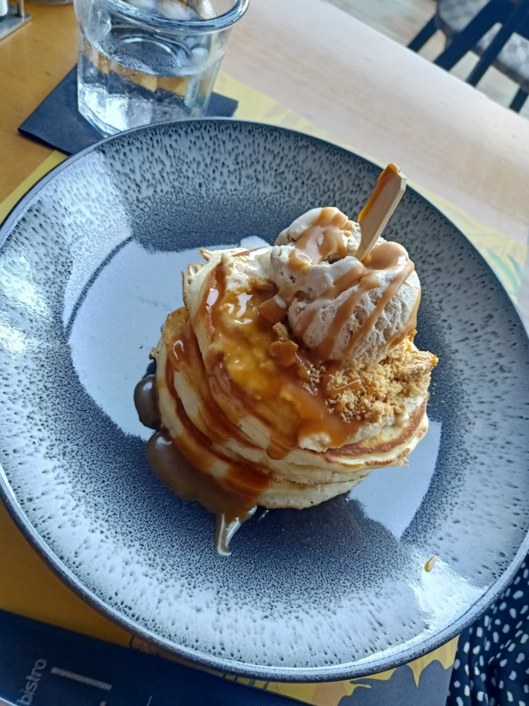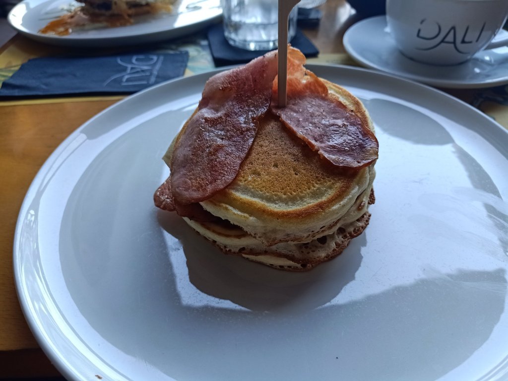 At gone 2am on Monday 4th September I was up needing a wee and to put the AC on, it was over 30⁰C and rather sweaty in our room. I’d also got a message from my friend about dates for a holiday in Rhodes next year so I was mulling over how I was going to be able to plan ahead, knowing I still didn’t have my residency renewal appointment date for this year and wouldn’t know until Sonuç could confirm on the system. Now that I was out of the country I couldn’t access the system for an appointment so would have to wait until I got back to Turkey to find out more. For breakfast Captain Caveman had found us a nearby café called Dali Extraordinary Art Bistro, it had fancy tea and pancakes with some interesting combinations. Nanny Kay ordered pancakes with ice-cream, caramel and biscuits on, Captain Caveman had bacon, cheese, spinach and egg, smothered in a mayo sauce. I had plain pancakes with bacon on and they were very nice.