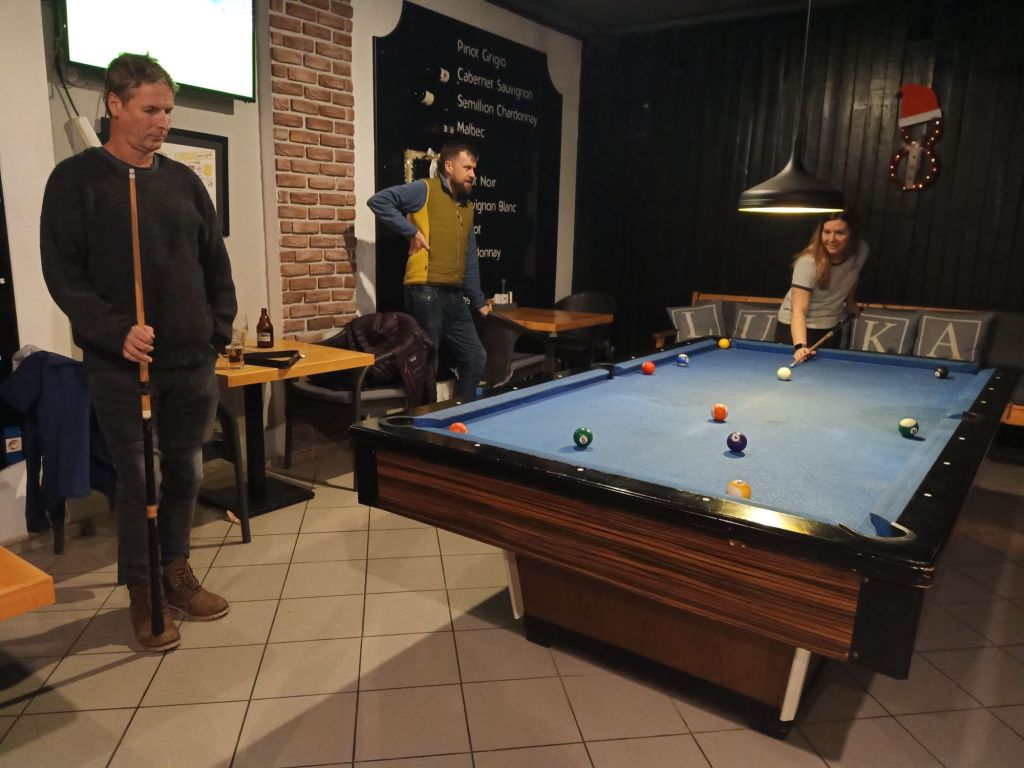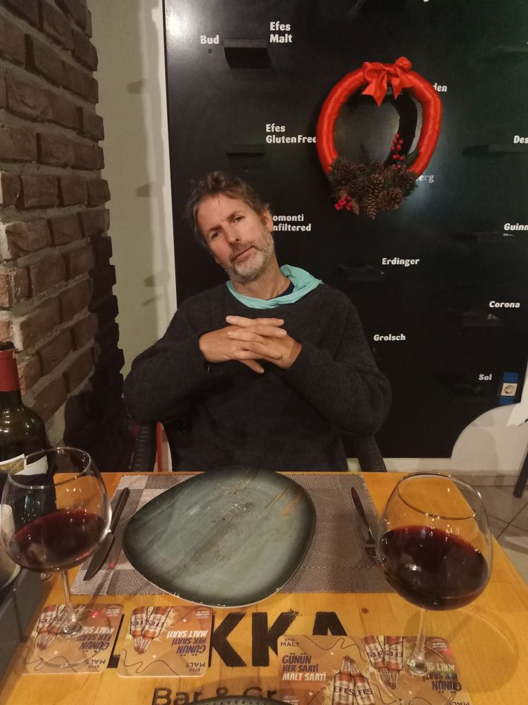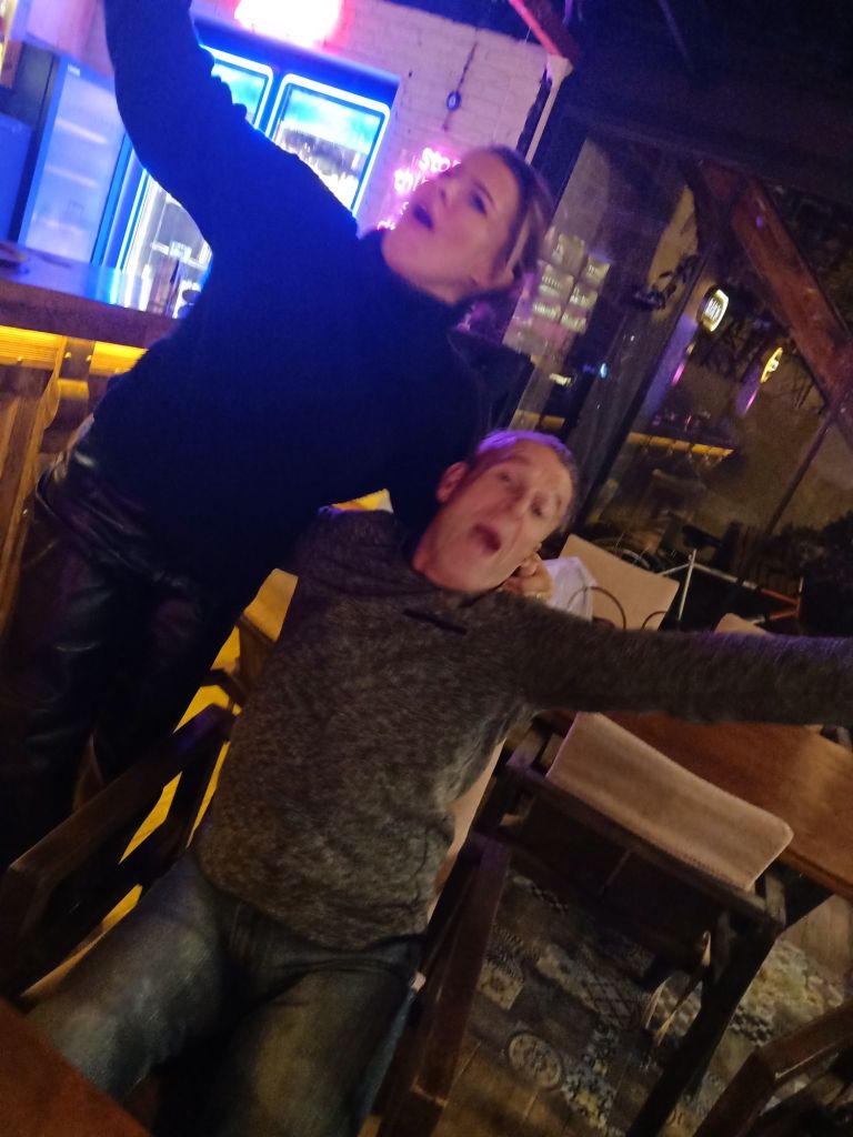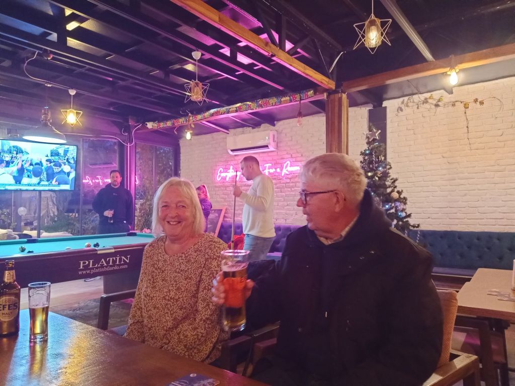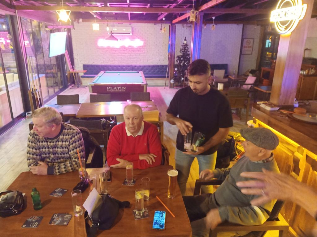 My hair price had gone up to 1,000 lira (£27), he’d dyed it, cut it, added a few layers, blow dried then curled it and I was pleased with the colour too. The cost was still very reasonable if you compared it to the UK but was probably 5 times the cost of where I get it done in Vietnam. It’s always the rule that after a hair appointment, it’s compulsory to go out so, despite it raining heavily, we were off out. We’d arranged to meet Nanny Kay at Lukka bar but she cancelled due to the weather. Instead, we decided to try Filo which is a relatively new place that I’d not been in yet. We walked past Heybe towards Retro bar and found that Filo was closed. As the 4 of us turned around Michele and Nick drove up with the Christmas hat and gave it to Captain Caveman. We went in Lukka bar where we were the only people, the rain meant most people were staying indoors. We played pool and learned how to do some slower and harder shots. I had only one glass of white wine because I prefer the red but I was finding red wine a bit too harsh on my sore throat.