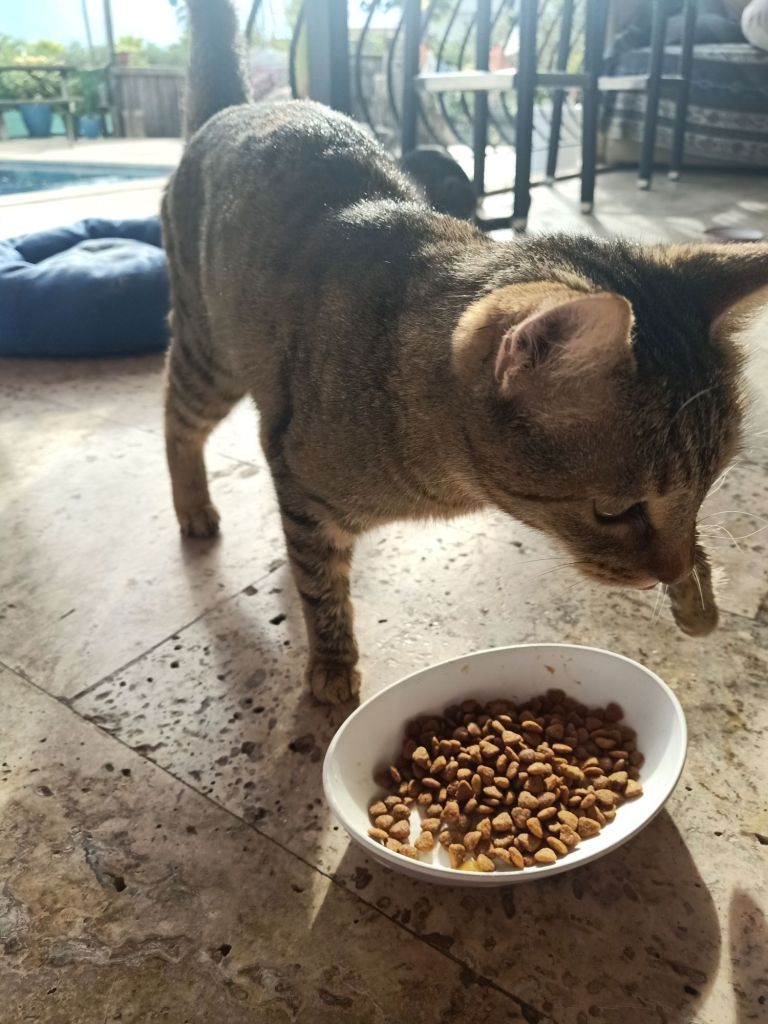 Captain Caveman was doing dinner so I went a bit early to feed the cats, this time only 3 were there when I arrived; Bubble, Squeak and Kylie were missing. I left enough food out for when they returned which was handy as Squeak showed up as I was leaving. She was over at the other side of the flooded road but I coaxed her over and off she ran to get her dinner.
