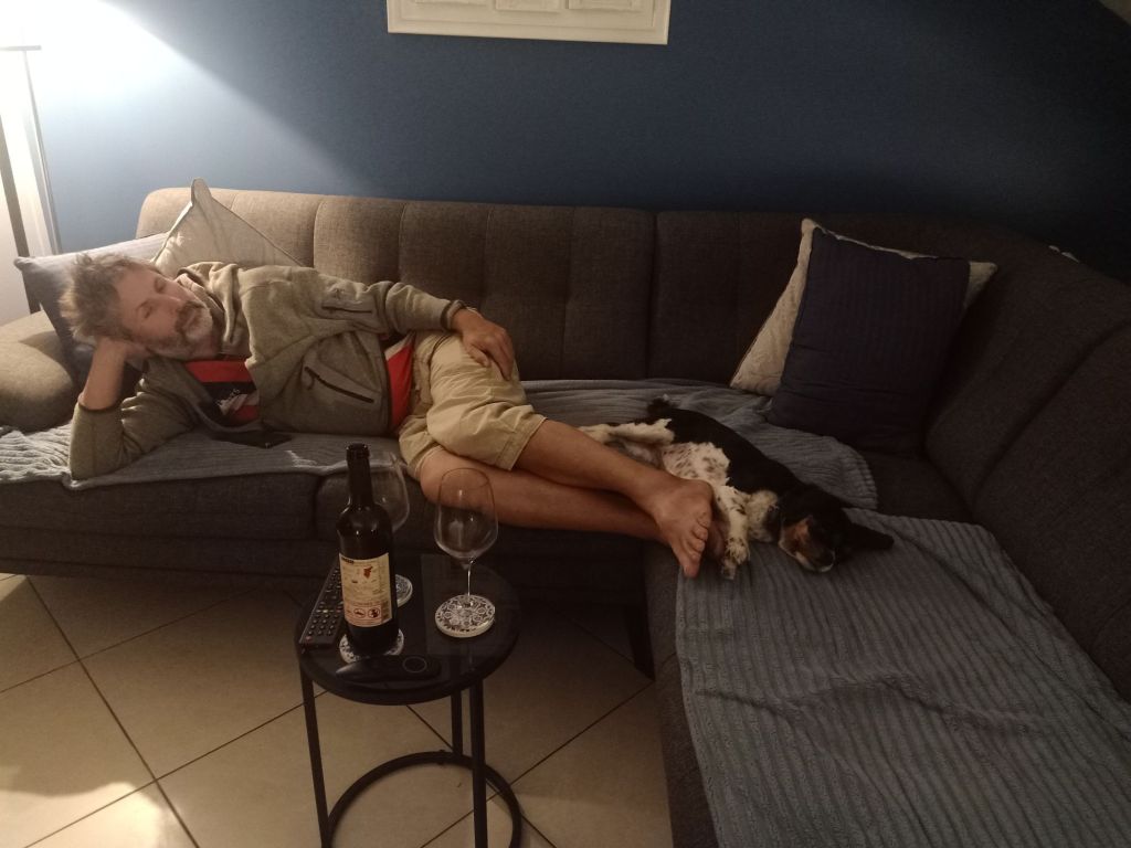 For breakfast I was a bit naughty and had wholemeal toast with kaymak and honey on which wasted 8 syns. I went over to Jamie’s where Norman and Edna were pleased to see me and were looking neatly groomed. The sun was shining so I was sat outside on the patio when Captain Caveman arrived from his Bridge club. I’d browned some sausages (Heck ones from the UK) so we had one in a wrap with onions, ketchup and mustard, more syns! Edna had bought me a couple of bottles of wine with the condition that she got a little bit of it so we had a drink before popping to the shops.