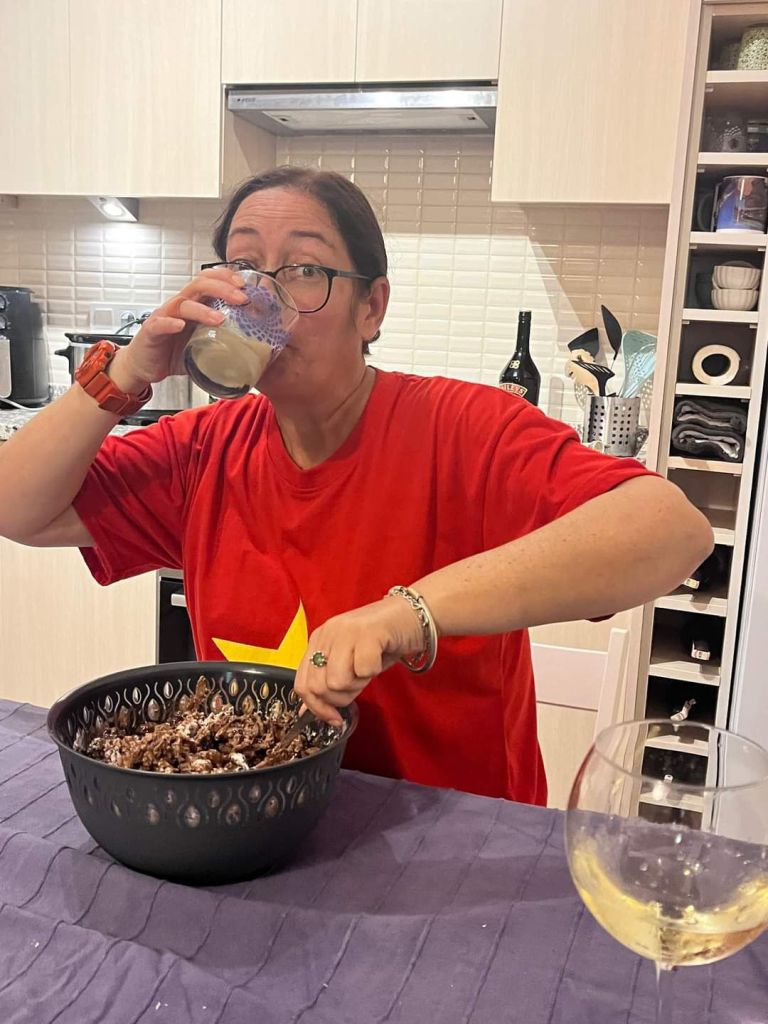 It wasn’t until almost 5pm that I noticed the instructions for the cake said to soak 1kg of dried fruit in the 2 cups of chocolate milk and three quarters of a cup of Bailey’s for 24 hours! Ooops. I popped it in a bowl and then started preparing for a soirée/curry night, a glass of residual Baileys on the go. There were Josh, Martha, Jamie, Captain Caveman and I for dinner so the tables had to be moved to fit the 5 of us in. Captain Caveman was playing Bridge on his phone and got annoyed at having to help move furniture and didn’t see why it had to be done yet. I wanted to be organised so that I could get on with the vegan and the chicken curries, get enough rice in my cooker for 5 and not forget the naan bread. Before putting the Baileys away, I had another one – I’d forgotten how moreish it was.