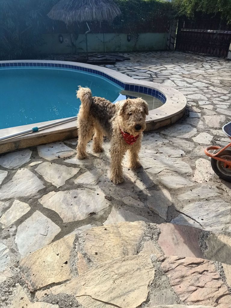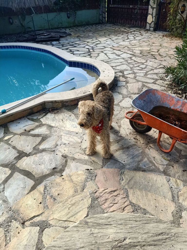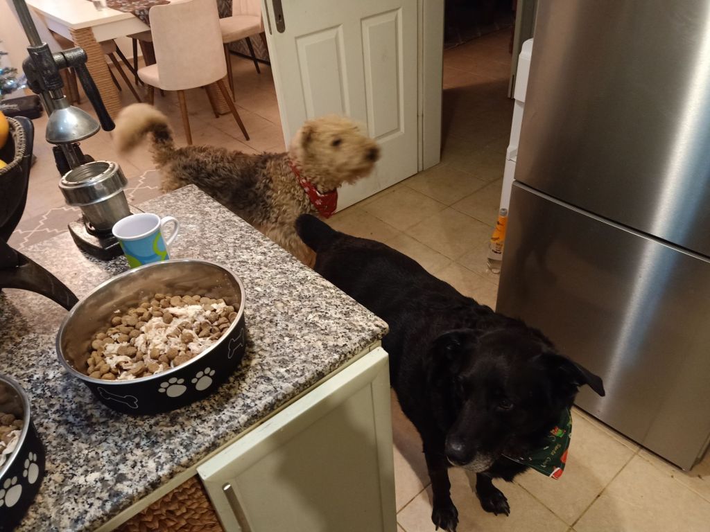 Big Boy, the big black dog, and Lucy, the Airedale terrier, were pleased to see us and were friendly. They really liked Martha and tried to encourage her to share her pack-up for at the airport.