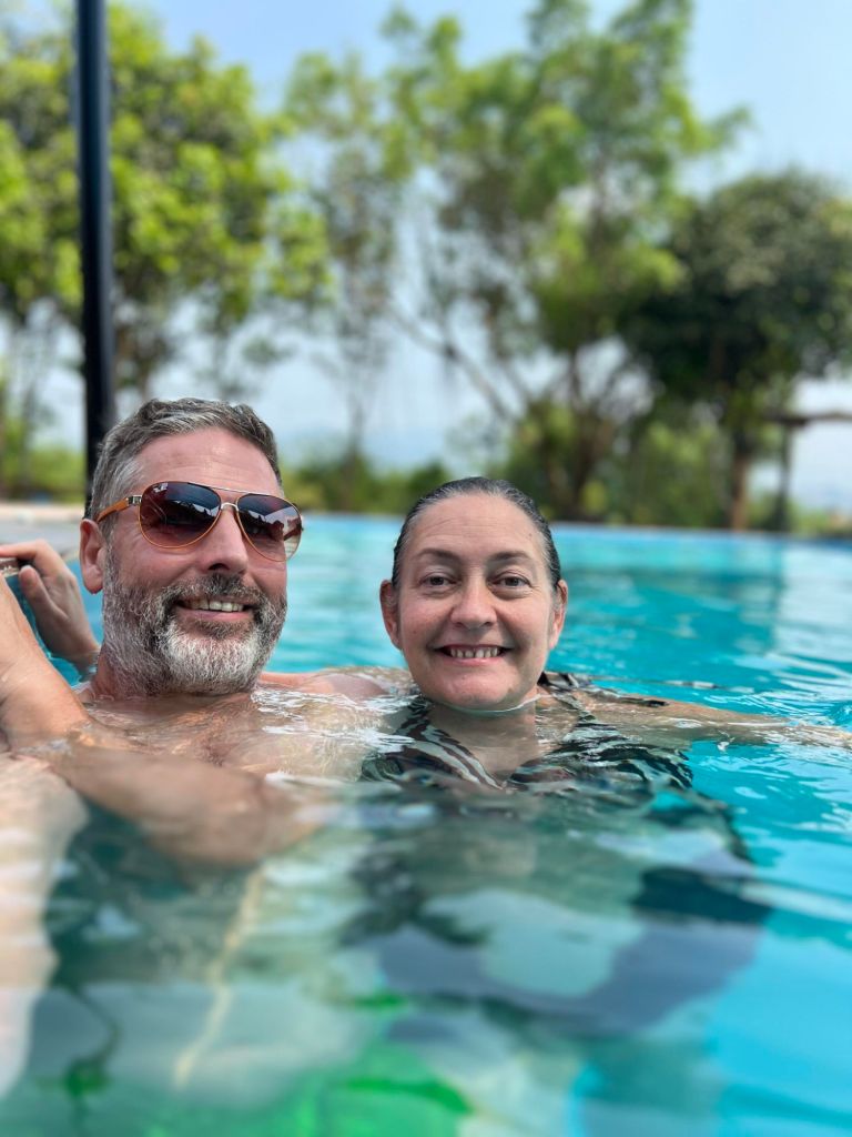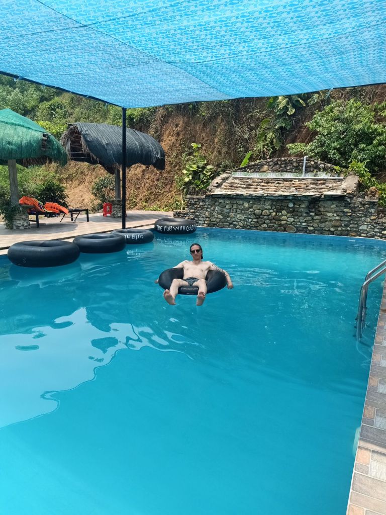 Monday 22nd April was Amanda and Greg’s last full day in Phong Nha and Captain Caveman had a day off so I’d suggested we have a little outing. Our first job was to check out of the Phong Nha Homestay, which had been amazing and it was going to be hard to find somewhere as good for the price. We were moving to a more rustic homestay further out of town and had told Vinh, the owner, that we would be checking in after 4pm. Captain Caveman and I packed our bags and left them in reception, letting them know we would pick them up later. The car picked up the Aussies, then drove down to collect us and was costing just 400,000VND (£12.33) to have the car take 4 of us to the Pub with Cold Beer and then wait for us and bring us back again later. That was an absolute bargain however, it turned out the road was being repaired so the driver could only take us as far as the suspension bridge. We had to walk over it but both Amanda and I were scared of walking on the metal mesh surface which you can see the river below on. It was very hot but we were glad to get to the Pub with Cold Beer where we were welcomed by Nhat. We ordered the famous BBQ chicken, which is charged at 250,000VND (£7.71) per 1kg of the alive bird. There is an option for you to pick, catch and kill your own but we did the more practical option of having the owners do that part. We chose rice, morning glory and plenty of peanut sauce to go with our meal and then waited about an hour or so for it to cook. We were in no hurry as there are hammocks aplenty for lolling about in and a lovely pool for a refreshing swim. I noticed that they now offer to accommodate people who want to swim but not eat or drink for a fee of 50,000VND (£1.54). It’s still one of our all time favourites and we always love to see Nhat and her family as they are so lovely.