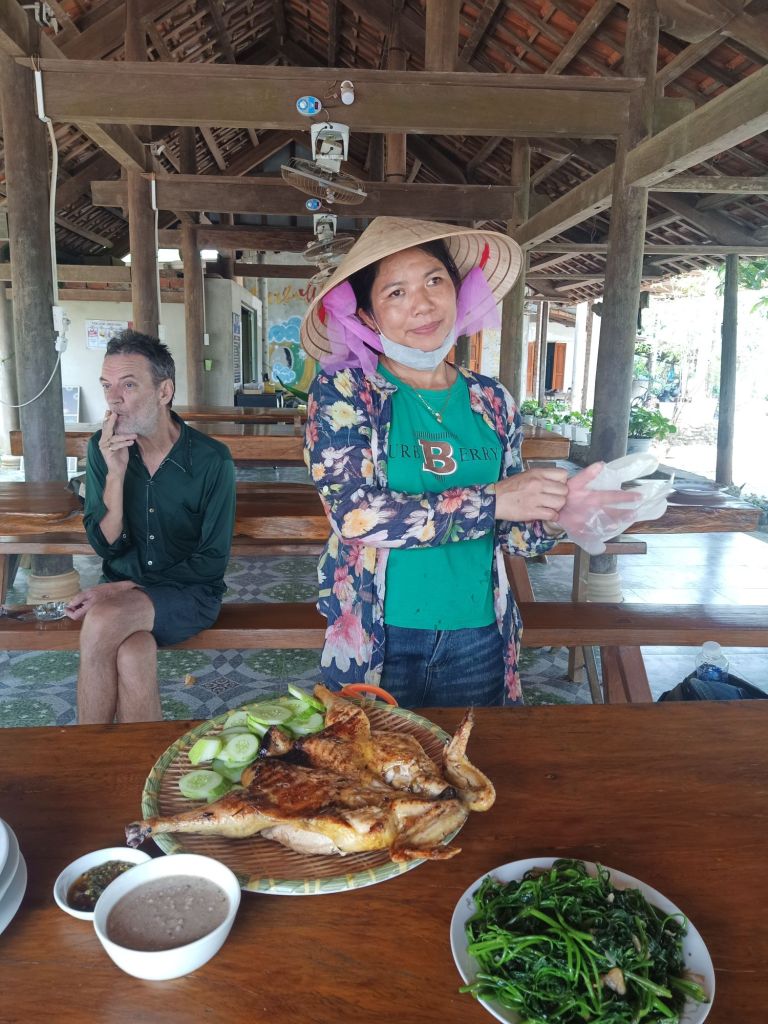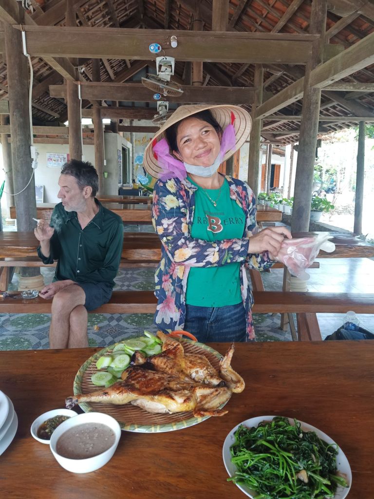 Instead of a cold beer, which I would normally have several of, I had a fresh coconut at 40,000VND (£1.23) and a litre of water at 25,000VND (77p). Multi came to join us but didn’t eat or drink any alcohol, he just had water and plenty of fags! By 12.45pm we were tucking in to a very tasty feast in a delightful place. Captain Caveman had several beers which are also 25,000VND (77p) each and are always very cold!