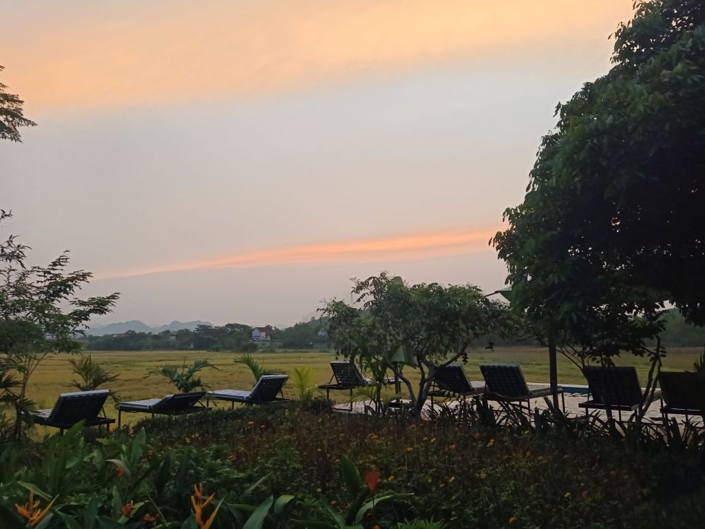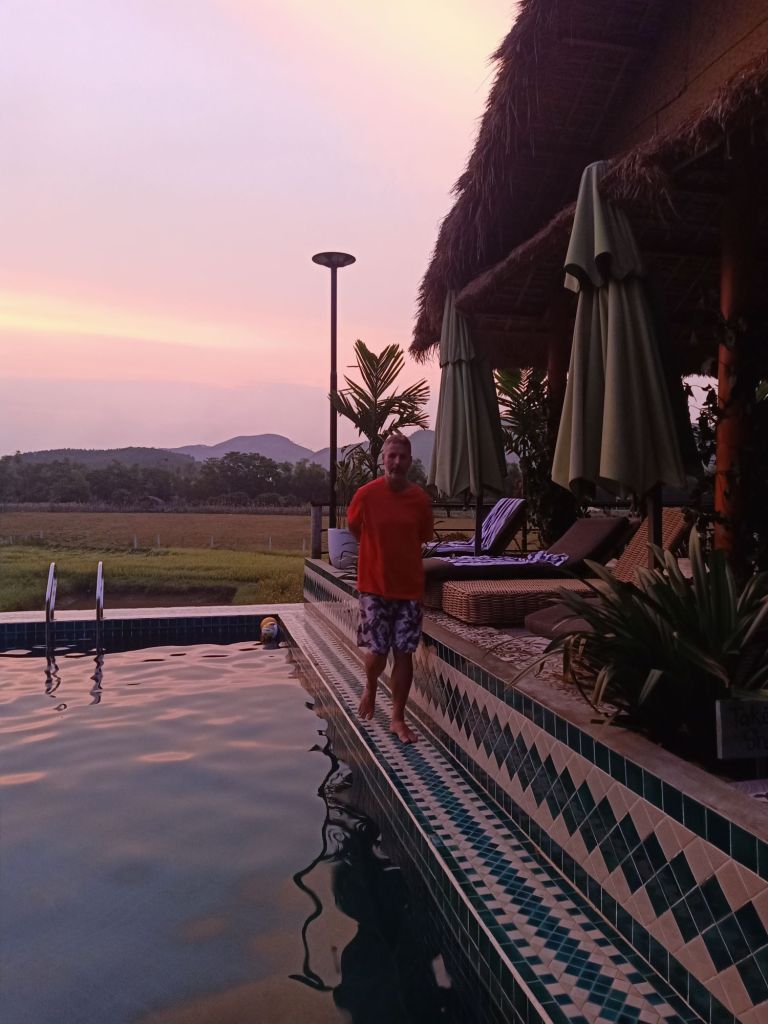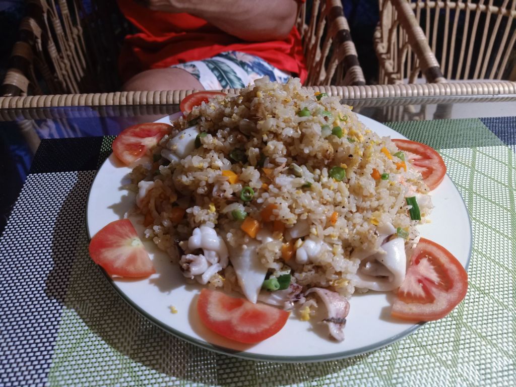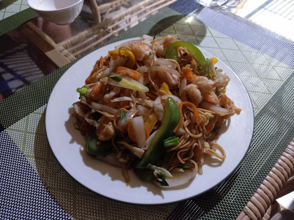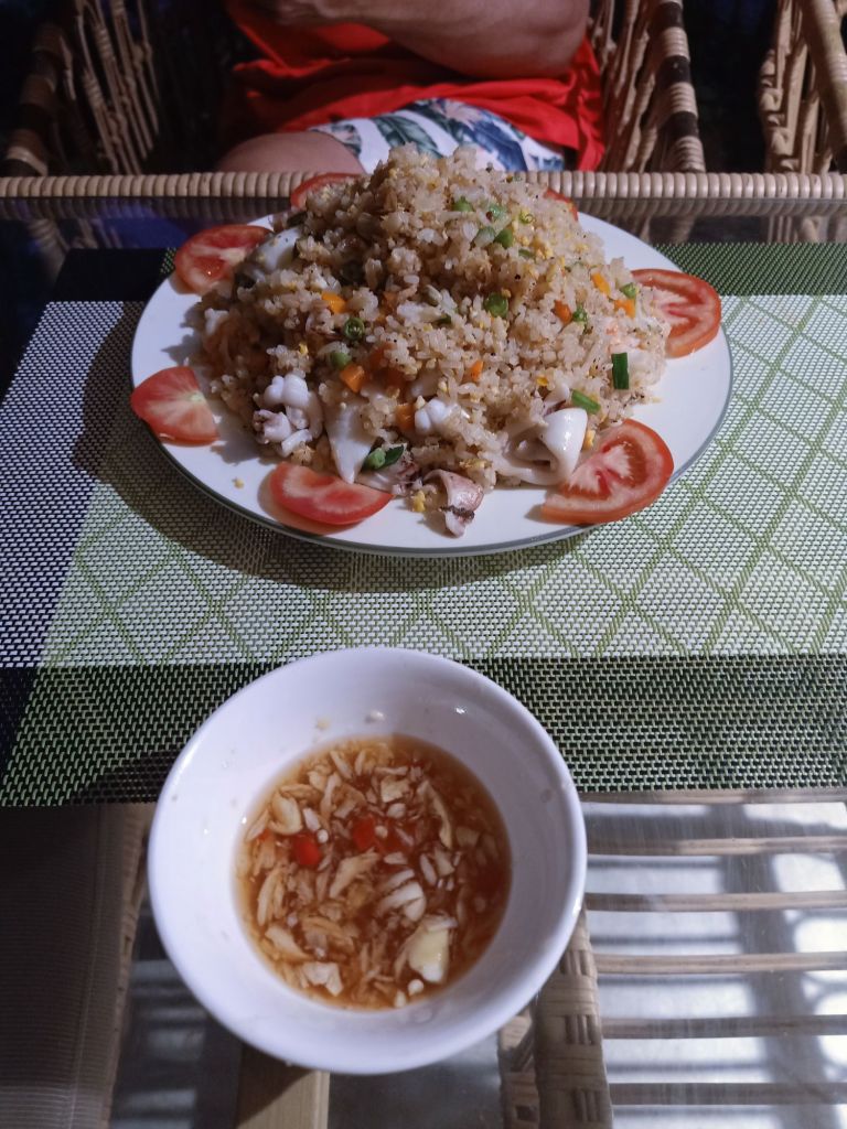 I had a swim before sunset and got ready for dinner, still feeling a bit unwell. For dinner Ngan had prepared fried rice with squid for everyone else, but I’m allergic to it. I was served a lovely alternative of prawn and vegetable noodles in a generous portion which I really enjoyed. I also had some white wine and Captain Caveman had beers.
