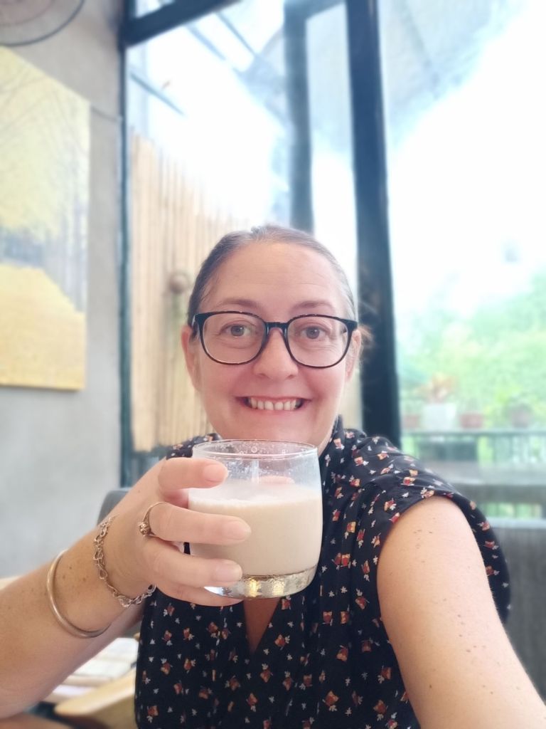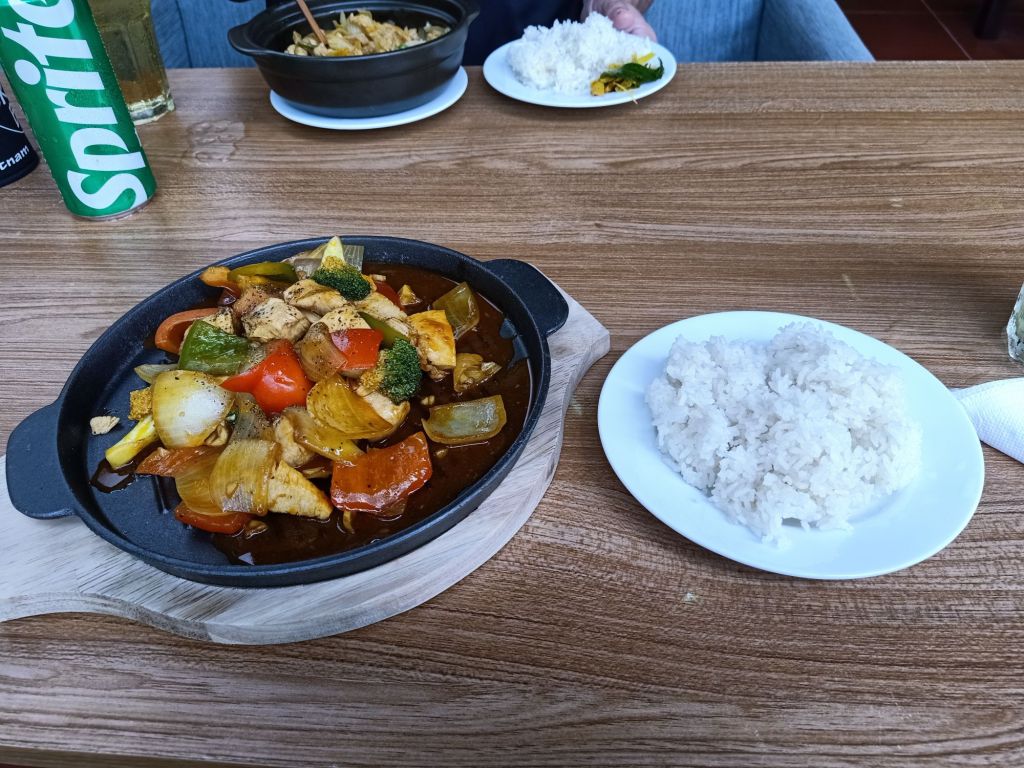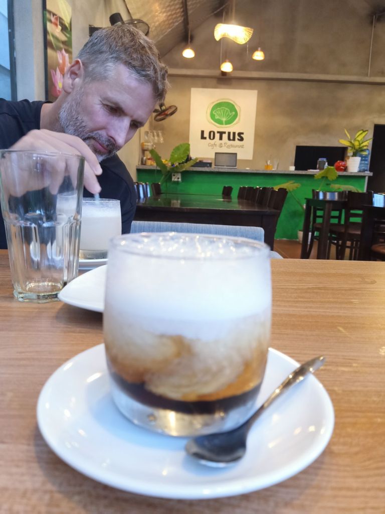 Just before lunch time, Captain Caveman and René were convinced it wasn’t going to rain so we decided to venture out. I’d already said to Hoan and Chung that I wasn’t feeling well enough to cycle to the Vegan today too and they said they might pop over to visit me tomorrow. Captain Caveman borrowed a bicycle and I took Bluey to Lotus restaurant. I had a lemon juice and Captain Caveman ordered a shandy. It started to look a bit black o’er Bill’s mother’s as we decided to order some lunch. Captain Caveman chose a pork and lemongrass dish and I went for a chicken Luk Lak, an old favourite. As we were eating, the rain started to come down with a vengeance and we had to declare ourselves stranded. We attempted to get the bill a few times when we thought the rain was easing off but alas we had to have a cocktail. The White Russians were very good and stronger than I’m used to so I got extra milk in mine. Because of the continued rain, we spent about 5 hours at Lotus restaurant, where the staff really looked after us. Here’s what our bill looked like after submitting to the cocktails;