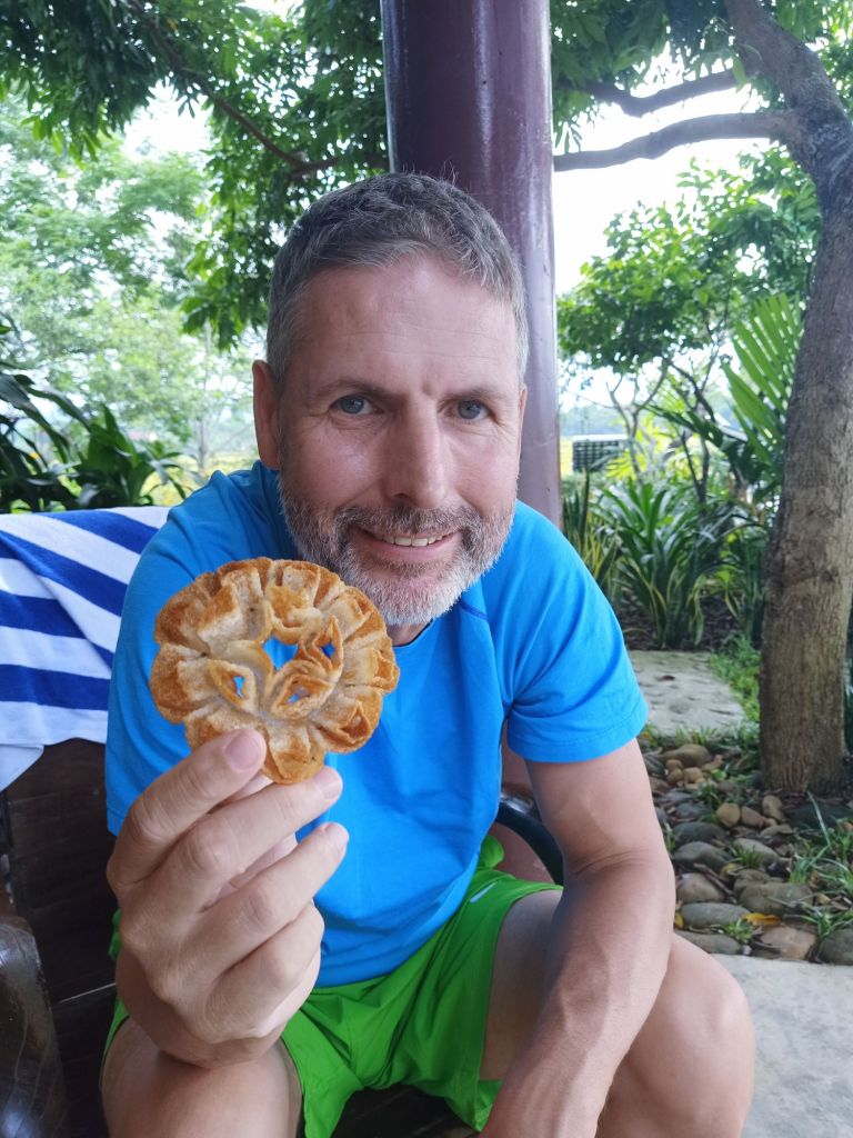 I was about to get in the pool when Chung and Hoan arrived, with fruit and snacks. Hoan brought a watermelon and Chung brought Banh Hoa which is like a doughnut mix in a crispy snack, shaped like a flower and rather moreish. Our friends had a soft drink and a look around the pool area, Chung picked a fruit from the tree near the pool and ate some.