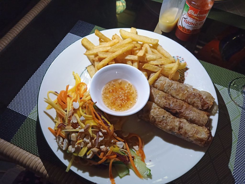 Captain Caveman had been playing Bridge since just after breakfast, with a couple of swim breaks. But at 3pm the rain started and it was time to move in to the bar area. By 6.30pm, because of the rain, the temperature was down to a chilly 28°C and it felt amazing! At 7pm we sat down for dinner with a glass or 2 of white wine and Ngan’s rather delicious home made spring rolls which came with salad and chips. It was such a lovely day and I was feeling very relaxed by the time we went to bed.