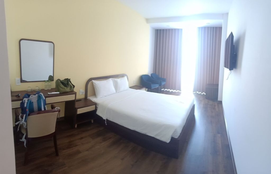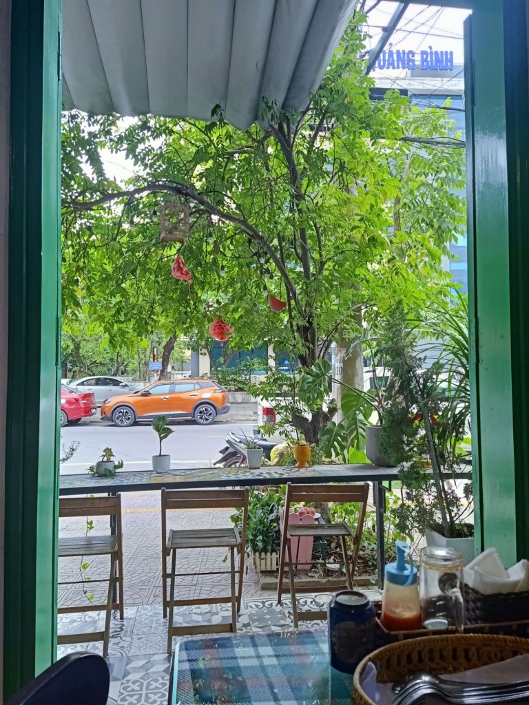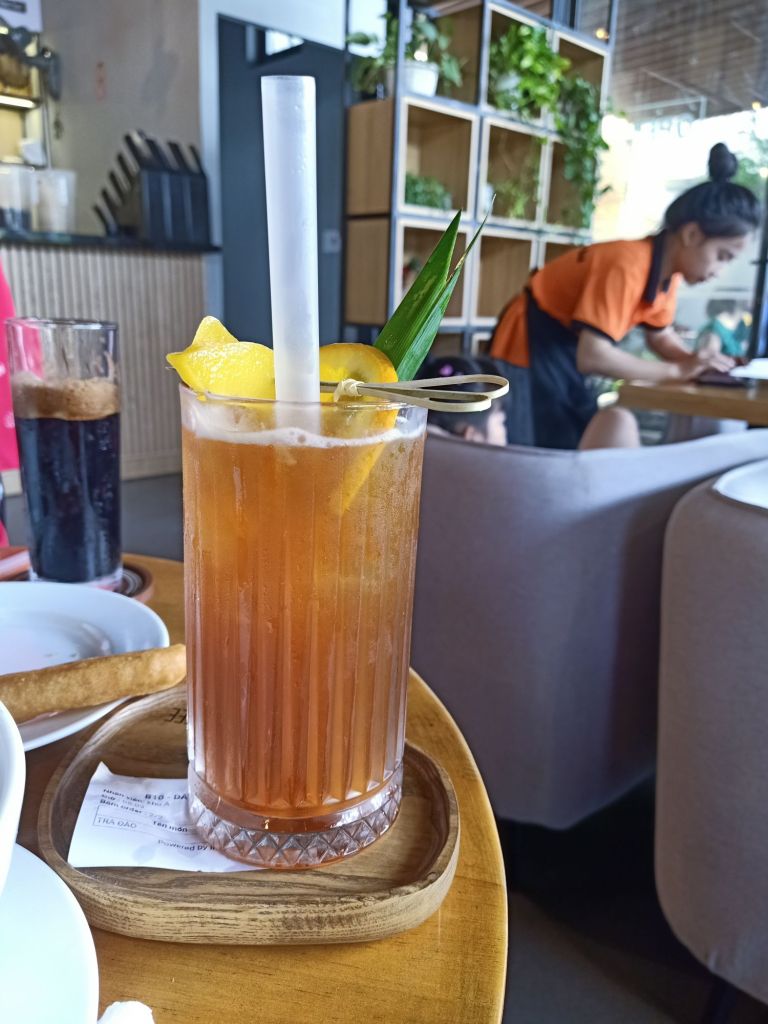 By 2.30pm, just a couple of hours later than expected, I was off the train and walking to a cafe where I could order a Grab taxi from. The taxis at the station have been known to rip me off so I decided, as I only had a couple of bags, I’d find somewhere down the road. I went to Vevy on Hai Phong and ordered a peach tea for 33,000VND (£1) which was really good. I’d not eaten the leftover pizza as the train was that hot, I felt it might not still be ok to eat. I was hungry but decided to wait until I got to the hotel.