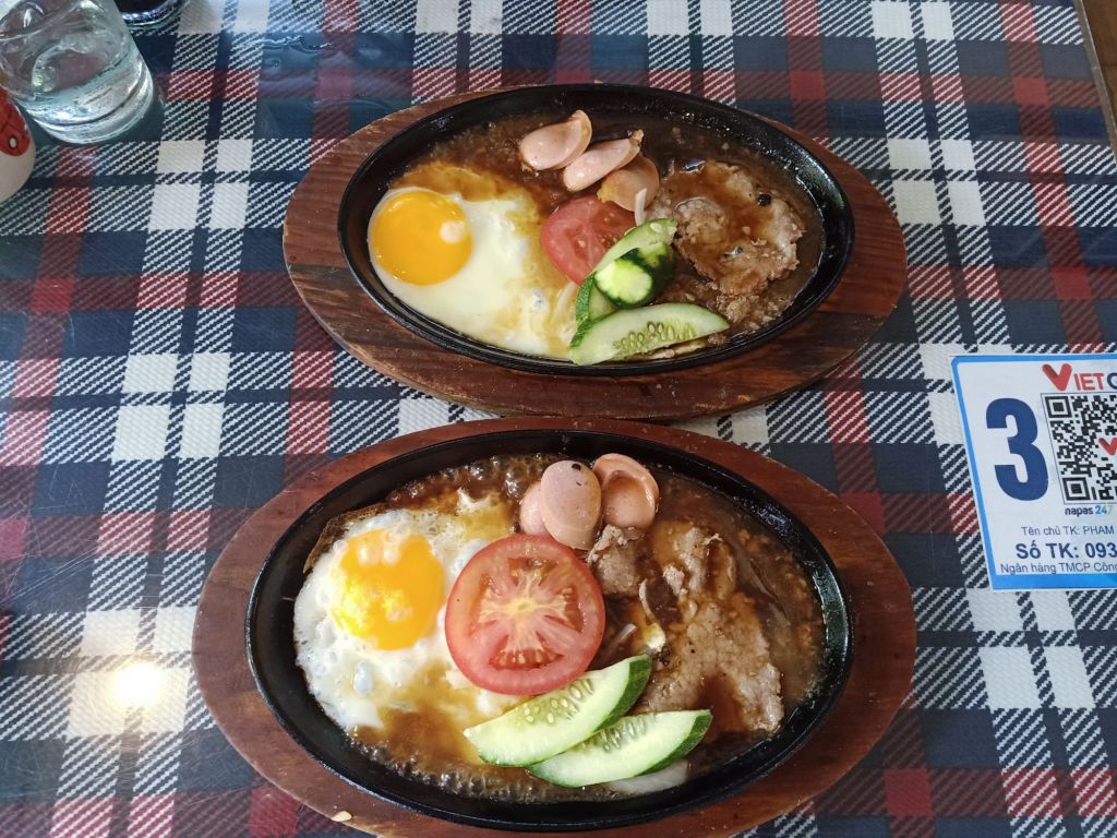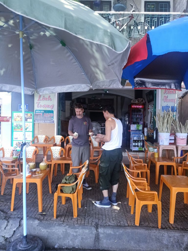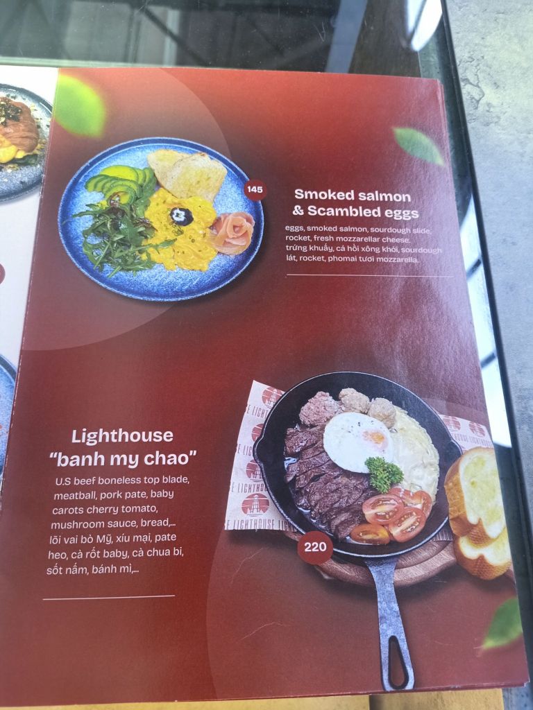 Captain Caveman was due to arrive at Danang train station on Saturday 22nd June at 6.06am. He also was delayed a little but by 8.30am we were off in search of a launderette and some breakfast. Captain Caveman dropped our washing off and was told to pick it up in the morning, we then got a Grab taxi to Lighthouse in Son Tra. It was pretty plush and I was starving so here’s what we had, prices in Dong;