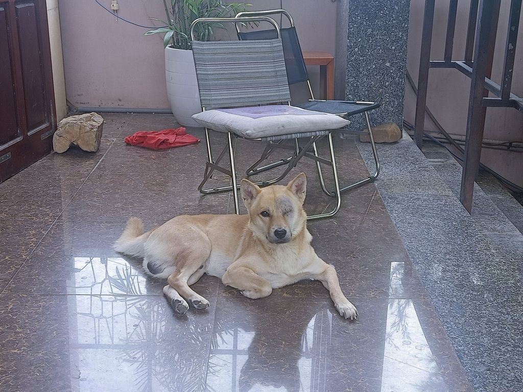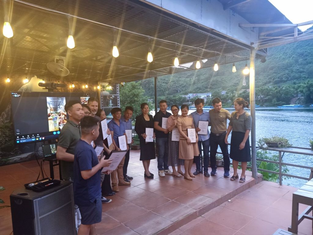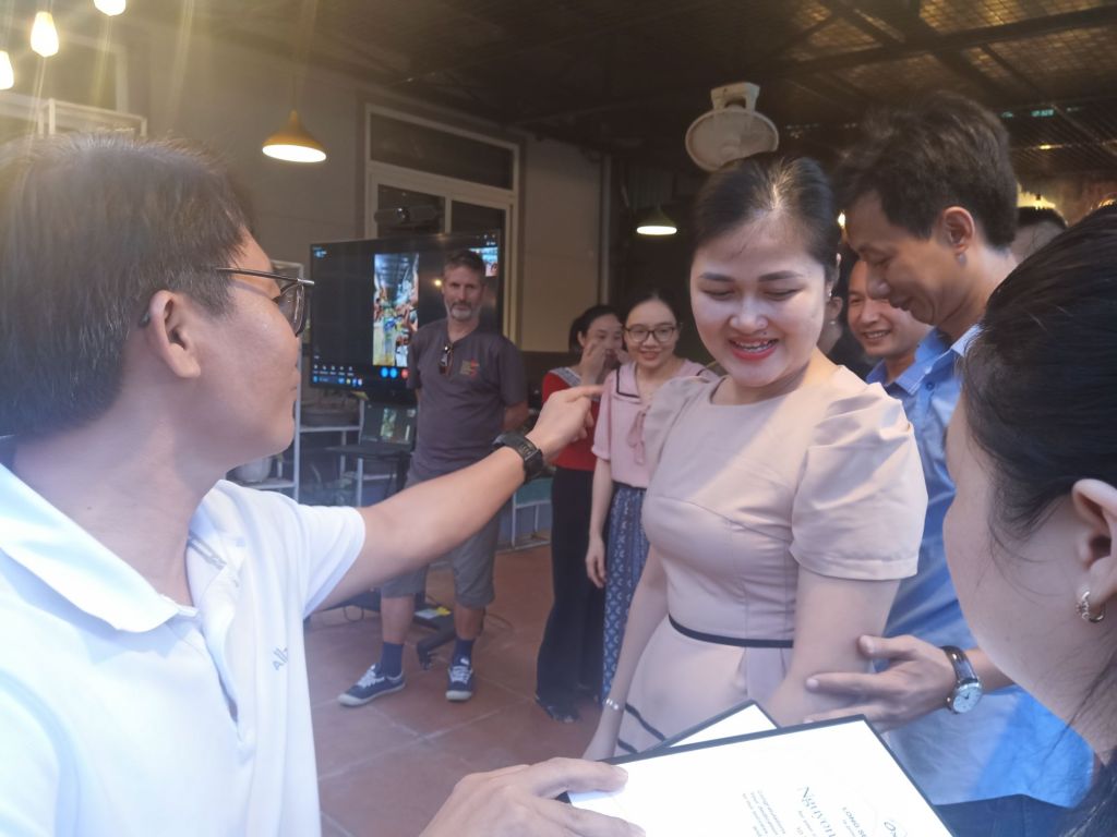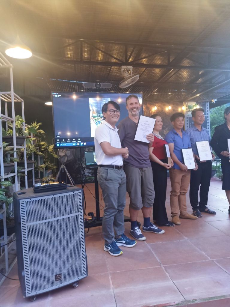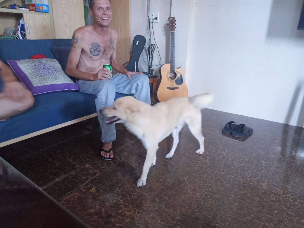 We cycled to Oxalis just in time to join the anniversary party where it was good to see staff being recognised and rewarded for their continued service. As Oxalis was very busy with tours there wasn’t everyone there but I saw a few familiar faces. Chau, the owner, was on a TV link up from Saigon, having left his brother in charge of the proceedings including the certificate and gift presentation. Luckily, it wasn’t a late one and we got a lift back to Dong Hoi with some of Captain Caveman’s colleagues. At 10pm, after letting the dogs out (still separately of course) we were in bed. I fell asleep on the sofa and Terror made some progress as he started to give me licks. Rodger was my new best friend and he came to sleep in our room easily, he even let me give him a stroke.