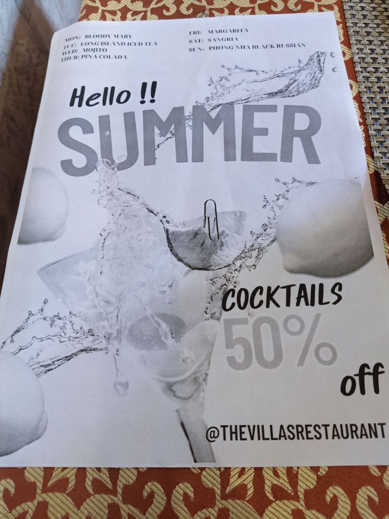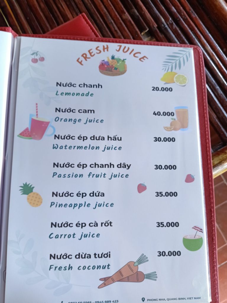 We were awake early on Tuesday 18th June as Captain Caveman was off in to Son Doong and I said I would see him off before I started work. It was probably the last time I would see him this year in Phong Nha and I was feeling a bit sentimental about that. Captain Caveman doesn’t do emotional stuff so it was just another day to him but at least he posed for a photo while we waited for a coffee and a watermelon juice at Son River House Homestay. We agreed that I would travel by car to Dong Hoi on Thursday, he’d booked me a room at the Dolphin hotel for that night and a train for Friday morning to Danang. He would get the overnight train after his gala dinner on Friday night and see me in Danang on Saturday morning. We would have our final celebrations in Danang before I flew back to Turkey on Tuesday. We were all organised so that it would go smoothly. Captain Caveman took himself off for spicy fish noodle soup for his breakfast, probably to escape my emotional goodbyes and me still being upset about May, the dog. Chung could see I needed a bit of support and told me to come back to the homestay once I’d seen Captain Caveman off on tour from Ho Khanh’s. I saw Mr Nghia who works on the porter team and is Ha’s (from Phong Nha Vegan) dad. He was holding Ai’s baby who is super cute and so I took photos. I also found a creepy crawly to match his Oxalis shirt which turned out to be poisonous and had a twin nearby! Luckily I moved one to the shrubbery but then it got moved again to further afield. We said bye and Captain Caveman got on the bus with the next tour group, who also didn’t get off for a photo. Back at the homestay, I waited for Chung so that we could go to Phong Nha Vegan for brunch. I took photos of the Son River House Homestay menu which looked very comprehensive.