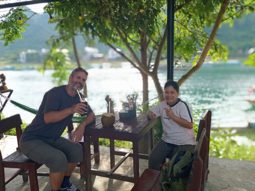Of course, we should have got on our bikes and cycled to Oxalis for their 13th anniversary party, however, we were beckoned over by the disabled family across by the river, who own the small cafe. We were joined by shaky-hand girl, so called because she loves to shake hands with people for the longest time and is very friendly. Captain Caveman had a Vietnamese drip coffee and I had a fresh coconut and then we decided to visit Tuan on the floating boat restaurant and bar, as we were in the vicinity.