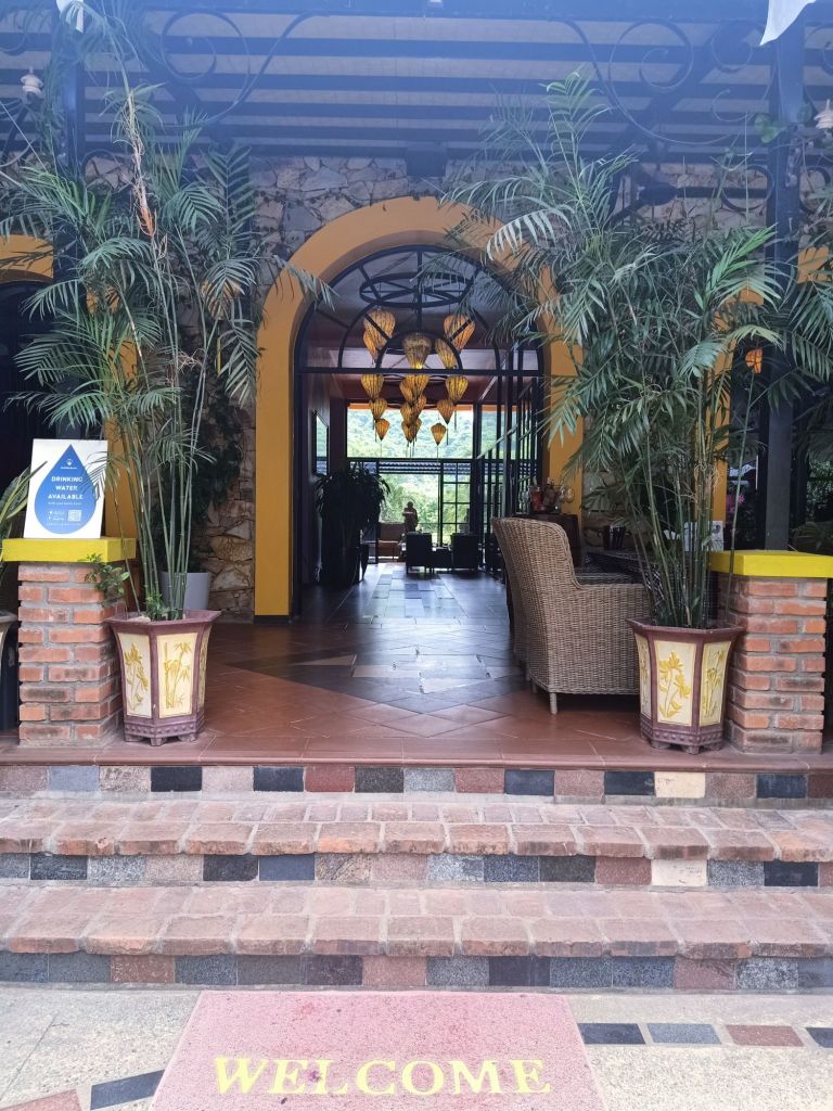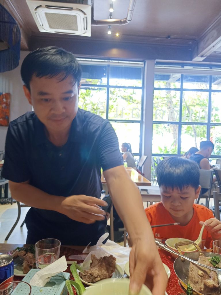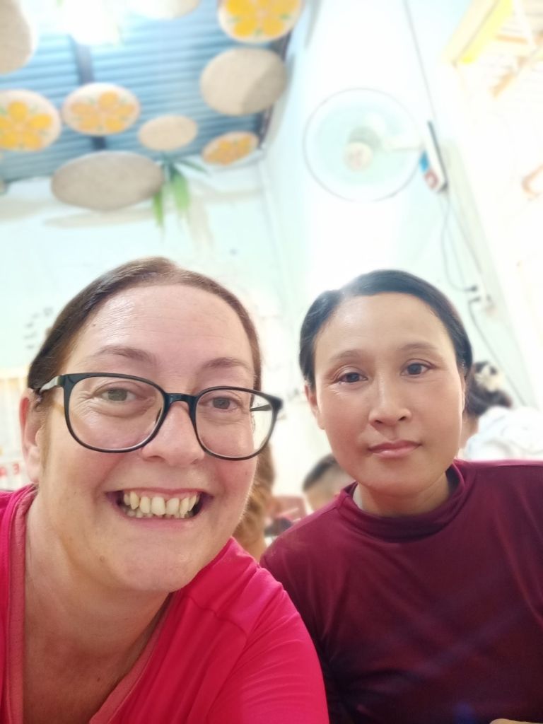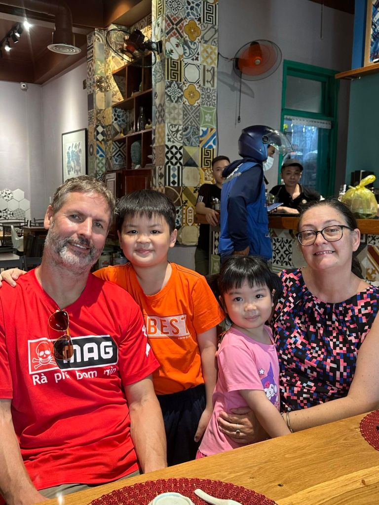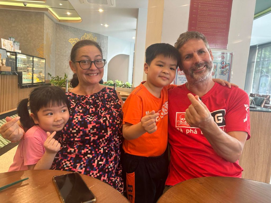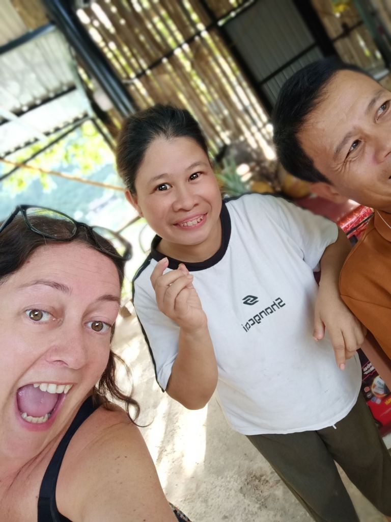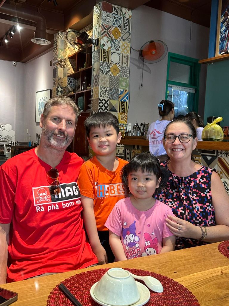 Captain Caveman and I took a Grab taxi to Thuy’s new premises in Dong Hoi just before lunch time. There were lots of plastic shower shoes on the steps to swap our shoes for, but Captain Caveman’s feet were too big for any of them to fit. We waited in reception and Thuy came to meet us to show us around her very impressive physio business. I saw the lady who worked at the old place who used to make the heated wraps and she had helped me get to the toilet a few times while I’d been having the numerous hours of physio. She was really pleased to see us as we walked round, Thuy proudly showing us all the amazing rooms and facilities. When we had completed the thorough tour of the building, we had a few photos outside then Thuy called her driver to take us to her home. Since I’d last seen her, Thuy and her family had also moved house, and it was really nice and fancy. We were given some water, fruit and yoghurt while the rest of the family got ready. I met the children, Tin and Su, who I used to spend time practicing English with, before Covid. Tin was super confident and fluent in English now and Su was doing very well as Tin chatted on. Thuy and her husband had invited Captain Caveman and I to join the 4 of them plus Thuy’s sister for lunch. This time we were not going to the bird restaurant, which I was pleased about.