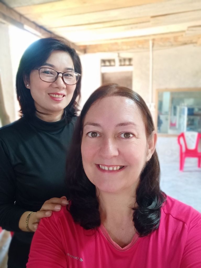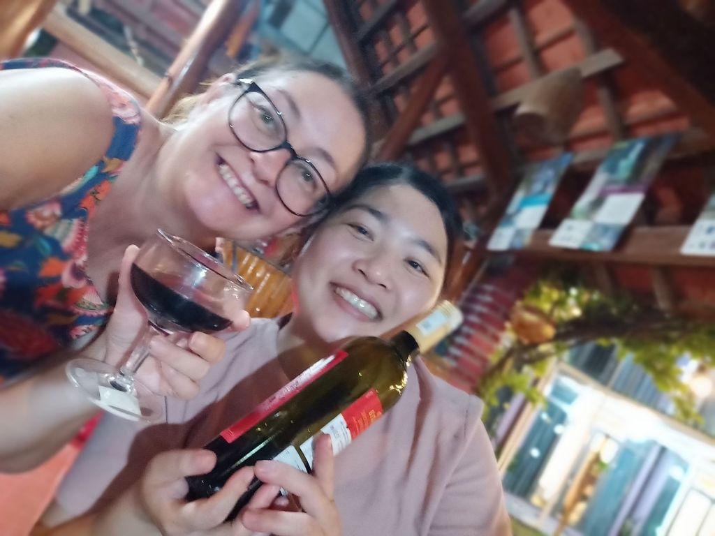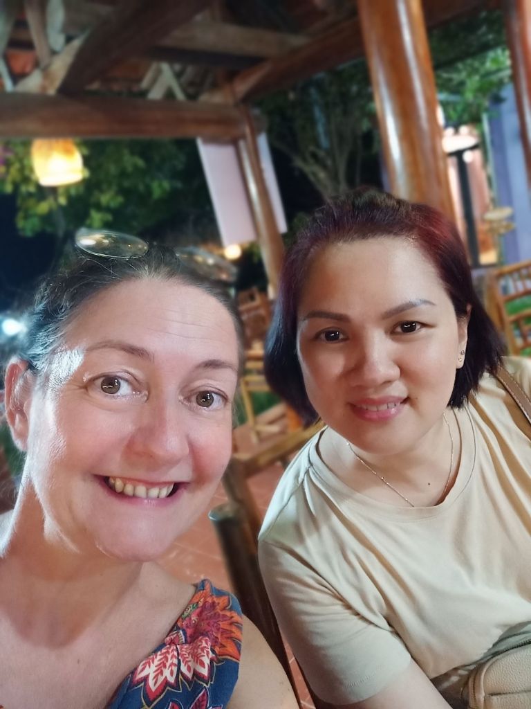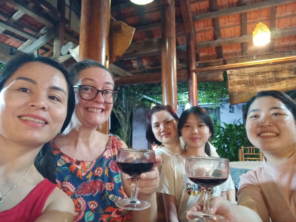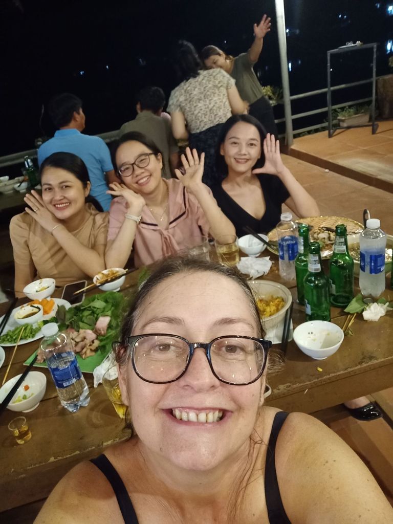 Wednesday 19th June was not only weigh day, but it was my last full day and night in Phong Nha. I had arrived in Vietnam 15 weeks ago and would be leaving after 4 months in the country, longer than I’d expected. I was up early so that I could be ready for an appointment before work and I did my measurements. My bust was the same as the previous week, I’d lost 1cm from my waist but had put 1cm on my hips. I made a note to get weighed later when I went to the vegan. I cycled down to see ‘Onion’ the hairdresser as Captain Caveman had booked me in for a cut and dye at 8.30am. She is actually called Nghien but it’s kind of pronounced like onion and that’s what a couple of the older cavers had called her. When I arrived, it was already getting hot, there was no sign of her. I bumped in to a young girl who was wearing sunglasses, a mask and a hooded long sleeved coat. This ninja-looking female spoke a little English and told me her mom was in town having coffee with friends. I’d also messaged her to say I was there but the reply came to the daughter to return at midday. There was no way I could take the midday heat while being in the hairdresser’s building so I asked for the same time tomorrow. The daughter didn’t understand so I just left and said I would message. Tomorrow I was leaving to go to Dong Hoi before lunch so that might be a bit of a squeeze, anyway. Disappointed, I cycled down towards The Villas and as I arrived Onion turned up saying I could cycle back to the hairdresser’s. By this time I’d already rescheduled my work and confirmed lunch with a friend. We agreed on tomorrow at 8.30am so I would just have to get up early. I worked from The Villas for the rest of the morning and drank a lot of water as the AC wasn’t on yet. At lunch time I logged off as I had invited Khanh Linh to join me for a catch up. We shared a Momma D’s pizza and a garden salad which was very filling. A member of staff popped the AC on and looked confused as to why it wasn’t already on. I had to try the Pina Colada as it was 50% off those on Wednesdays. It was very nice and I had a lovely time with Khanh Linh, who bought me a gift of a pair of jelly shoes. When I tried them on I was surprised to find they fit very well, too. Khanh Linh, who works at Jungle Boss, had to get back to work and it was very hot and humid outside. I also went back to work but finished before 5pm so that I could hurry back to Son River House Homestay for a shower. The plan was to be back at The Villas to meet anyone who was coming to help me celebrate my last night.