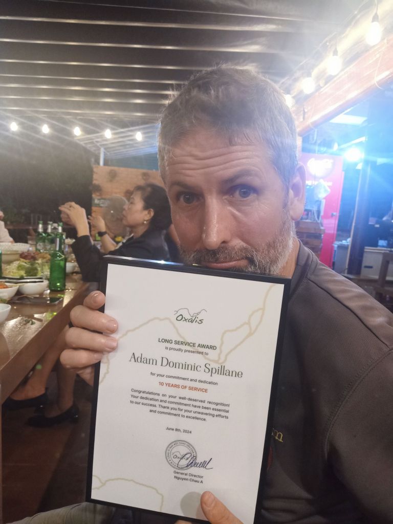 There was an Oxalis 13 year anniversary party which Captain Caveman and I had been invited to. He was going to be getting a certificate to commemorate 10 years with Oxalis (it was actually 11). The drive to Phong Nha involved picking up some flowers for the party and we waited in the minibus. We got dropped off at The Villas, as that’s where I’d left Bluey just over a week ago. I had a sensible cup of tea to start with but then we realised it was half price margaritas on Fridays and we just had to indulge. We were peckish by this time so we ordered lunch which was rather filling. I had the chicken and bacon sandwich (with chips) and Captain Caveman ordered the salmon.