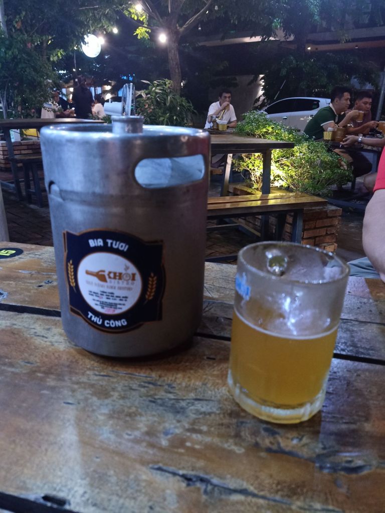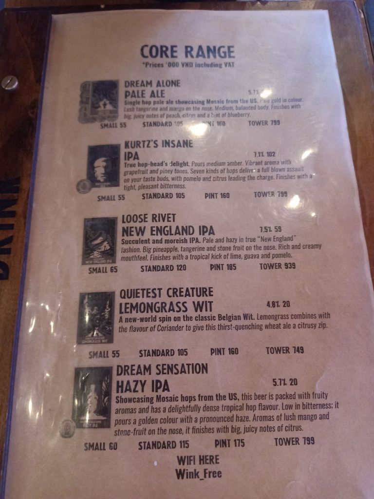There was a weather warning so we stayed in the AC room for the afternoon and I did some work while Captain Caveman played Bridge then fell asleep. I booked my flight from Istanbul for next week which included a snack, 25kg hold luggage, a specific seat and the Turkish Airlines lounge for about £80. In the evening we popped out to a Heart of Darkness beer place where I inadvertently ordered a lemongrass and coriander beer. It turned out to be really nice and we shared some salted edamame beans which I loved. For just 105,000VND (£3.25) for a pint of Belgian wheat beer in Vietnam, we decided to have another before walking to a restaurant.