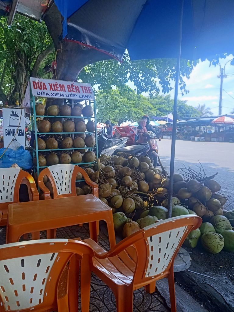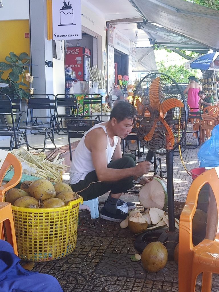 At the WinMart Captain Caveman bought bread, crisps and 2 bottles of cheap Italian wine for when Stu and the boys arrived later. They were due back later than expected so we tried the Banh My place next to the gold shop, as recommended by Duc at Cang’s vintage clothing. It was cheap and tasty and didn’t have all the pâté in, that I don’t like. After the sandwich, we ventured in to the market just as it was starting to get quite sweaty. Captain Caveman wanted to get something specific for his cousin’s wedding which we were going to in July. Our next stop for a bit of light refreshment was our favourite coconut stall and coffee shop. The man there is super friendly and hard working so we have been going to that particular guy since we were recommended him by Thao a few years ago.