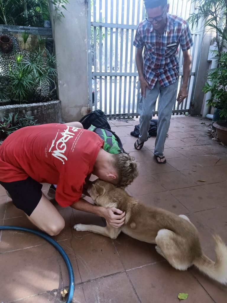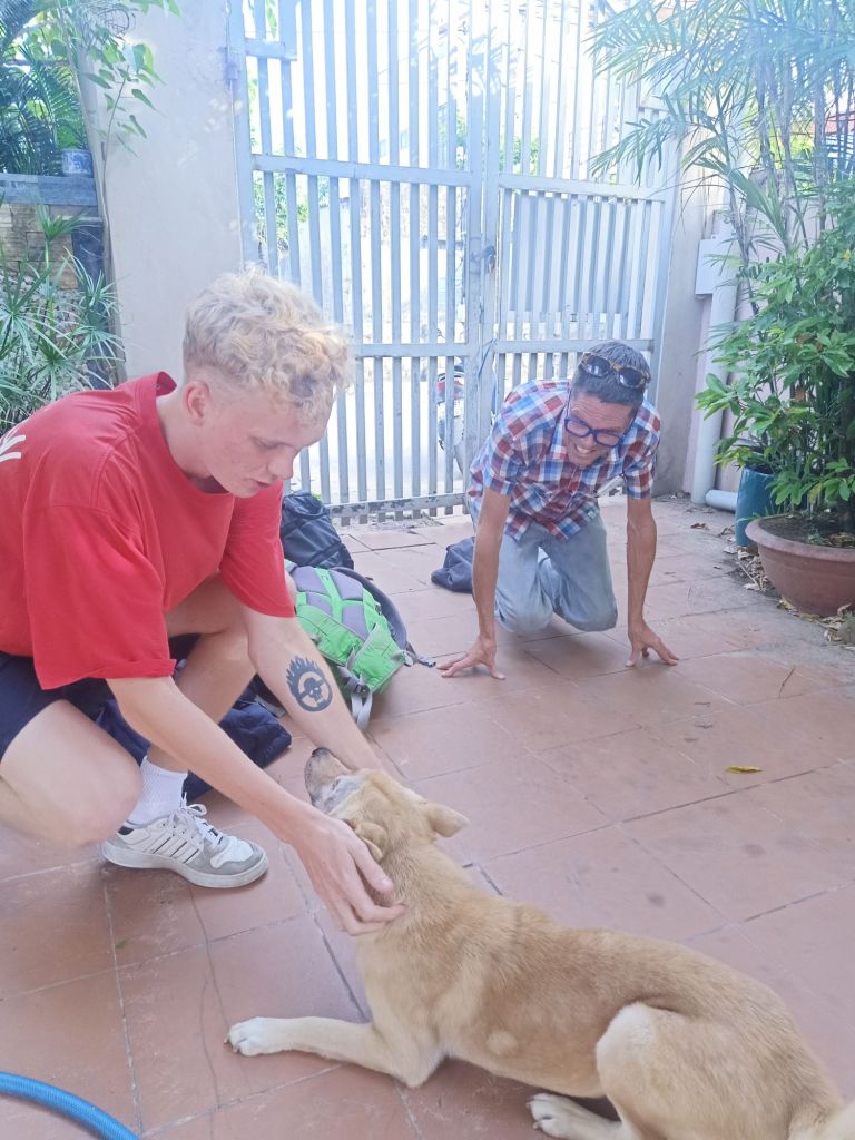 Back at the house, Captain Caveman was in charge of kitchen cleaning and feeding the dogs while I had the sweaty job of hoovering up. We cleaned the house as best we could before having our cheese sandwiches for lunch. I told each dog (separately) that their family was coming home and I think they understood. Over the 10 days we had been looking after them I’d gained their trust by telling them short stories about dogs who were scared of the people looking after them. Stu and the boys were due in around 5.30pm but I couldn’t wait to open the wine and had started celebrating their return without them. Rodger had always listened to my stories but Terror was having none of them, until today when I told him a story about a dog who’s owner had returned from a holiday and was very excited to see his pets. Terror jumped on to the sofa and licked my face and he knew his family was coming back. When Stu and Max returned (Jack had gone straight to meet someone at the airport), they took it in turns to greet the dogs. Rodger was first and was so excited he did a wee while Terror whined to be let out of Jack’s room. When Jack returned briefly they got excited again and were very pleased to have the boys back. The boys drank beer, I had a bottle of red wine to myself and we ordered takeaway from Oregano, of pizza and potato gratin. It was a good welcome back, we decided to stay over one more night and Max gave us his room again. Tomorrow we would head back to Phong Nha where I had just 10 nights left before I started my journey back to Turkey.