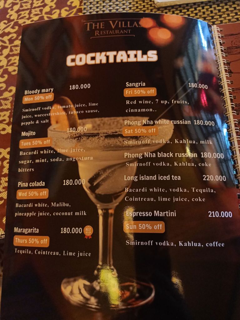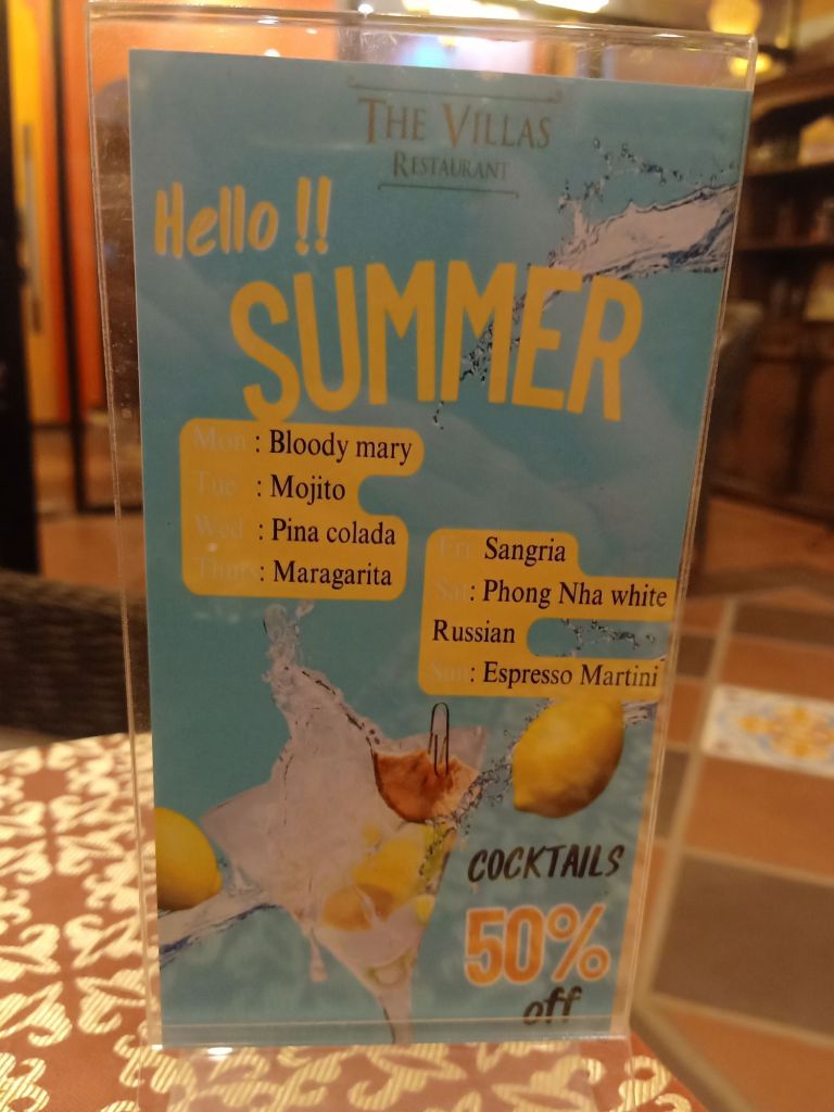 After bringing more of my stuff over, we cycled to The Villas for Summer cocktails. Today was Long Island Iced Tea, one of Captain Caveman’s favourites and we had 2 each, paying a total of 360,000VND (£10.92) as they were 50% off.