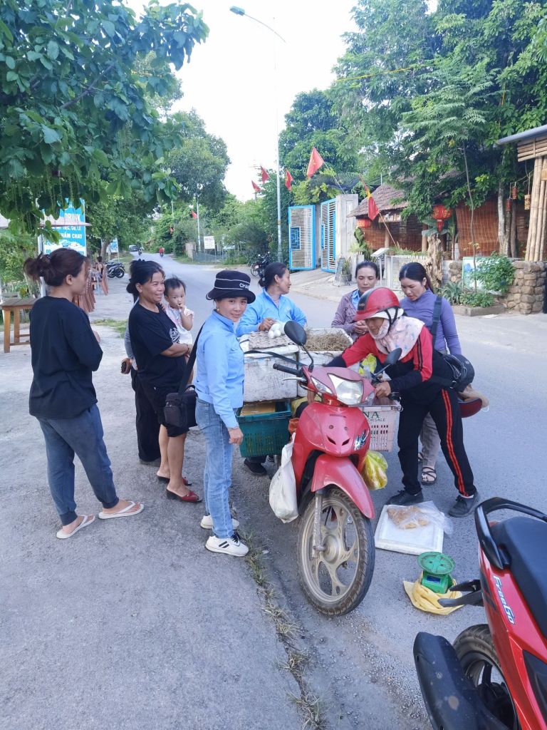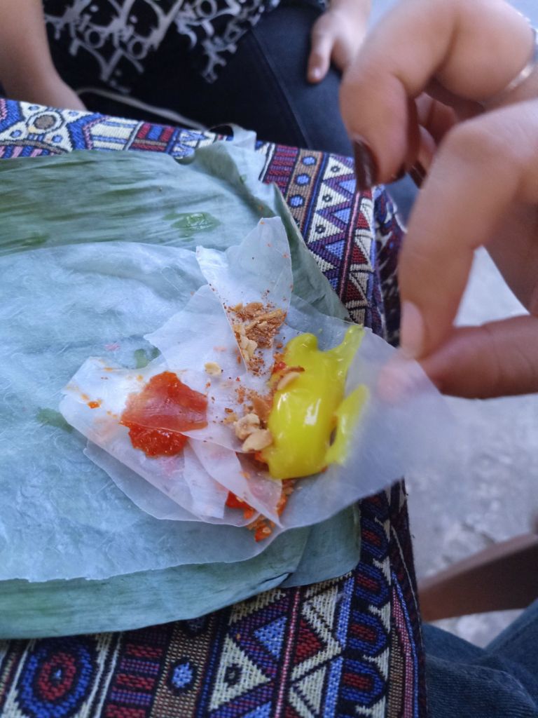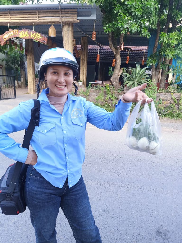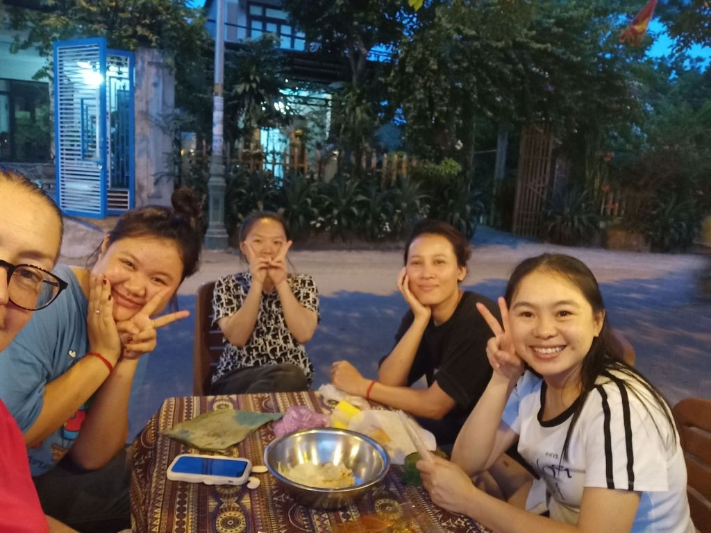 By 6pm I was at Phong Nha Vegan having a laugh with Ha. I was meant to be having a swim with her but I had no spare clothes and the staff were too busy with their customers. While everyone was having a bit of a rest near the cooler machine, I spotted the Banh Canh lady. She comes by on her motorbike shouting ‘Banh Canh’ and sells her wares of noodles, eggs and sometimes veggies. I shouted Hanh from the kitchen and Ha from the hammock to come to buy some things. There was quite a crowd and the lady did a roaring trade. Hanh just bought the Banh Canh noodles for 10,000VND (31p).